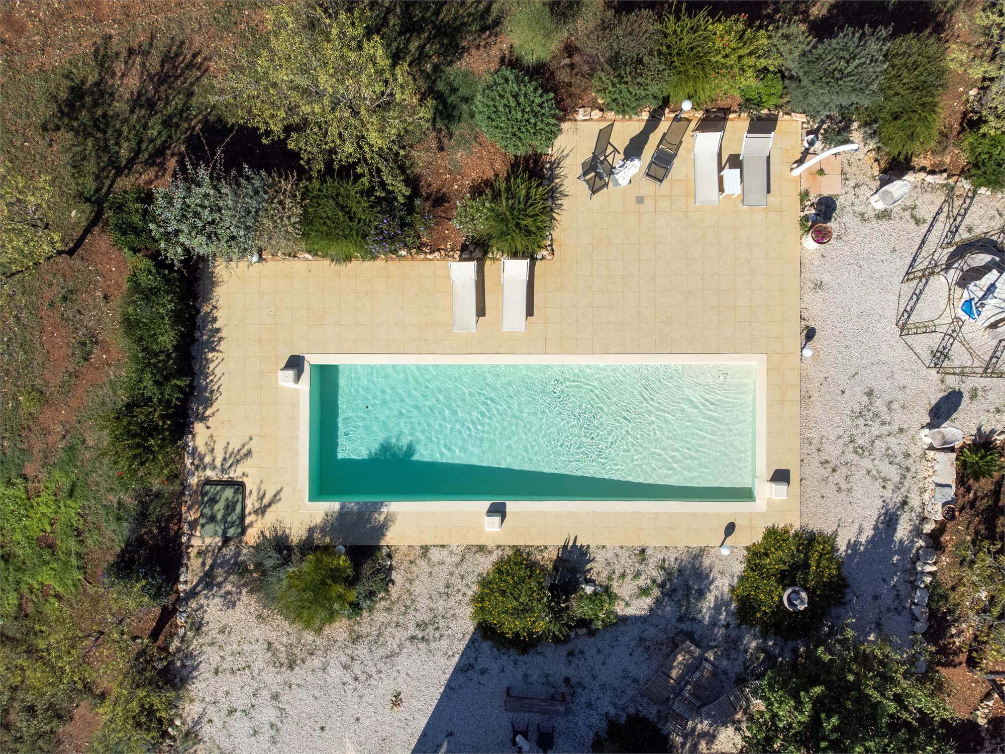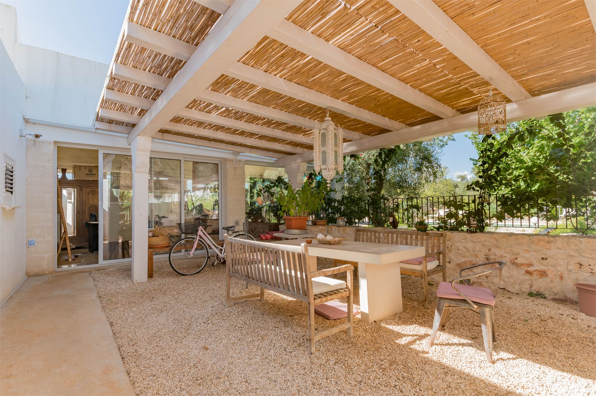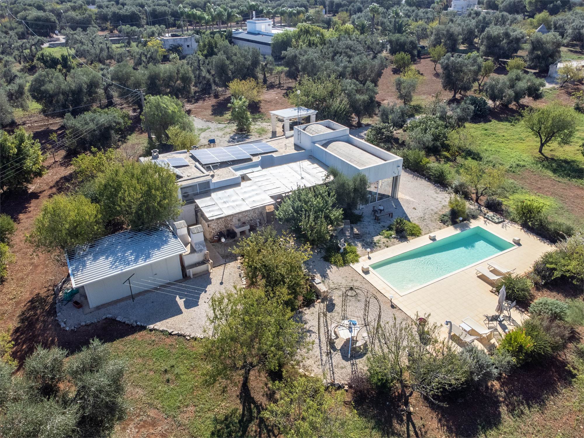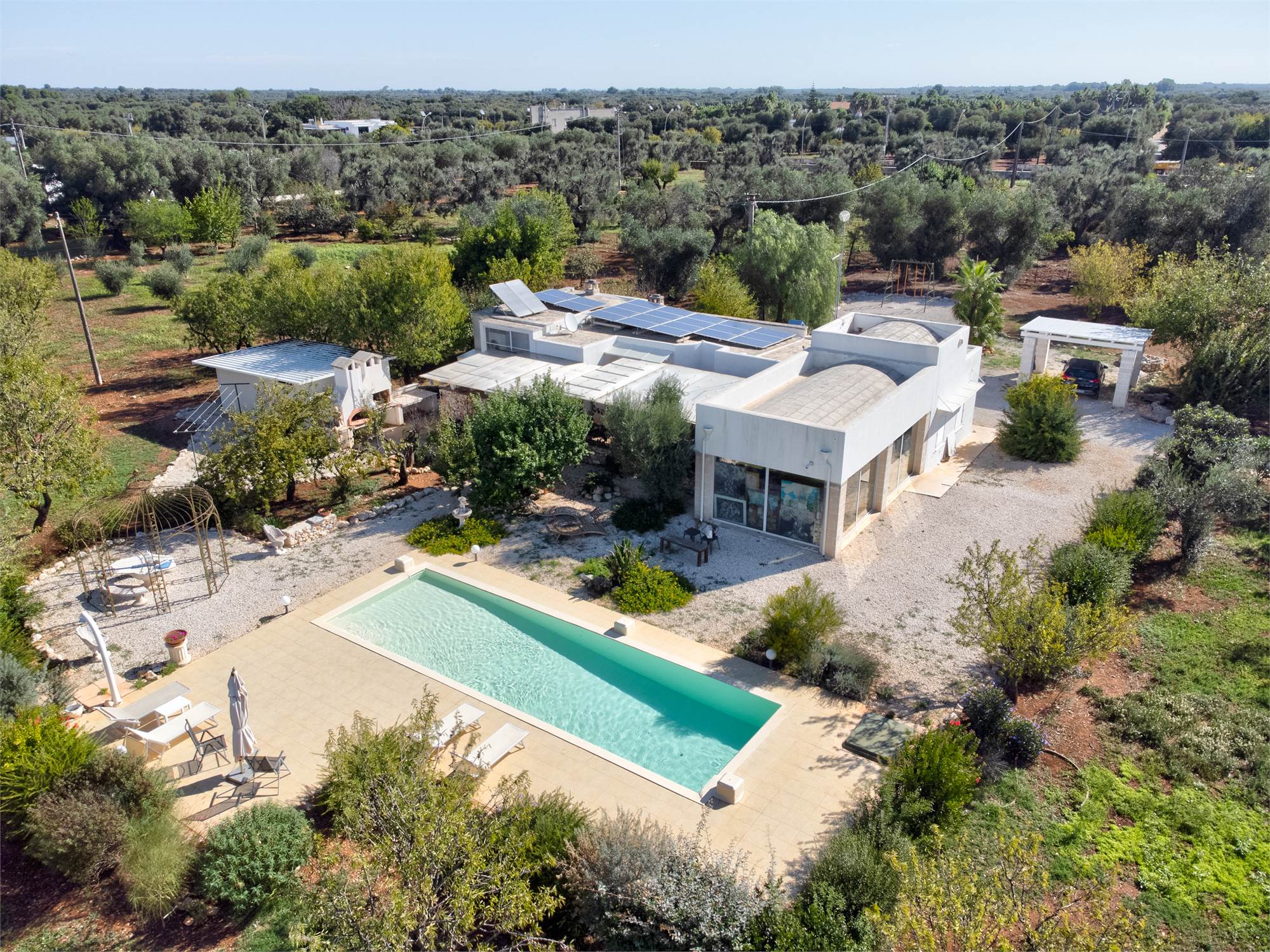 The property is equipped with all comforts: underfloor heating, photovoltaic system, automatic gate, artesian well, alarm system, air conditioning and internet connection, parking space shaded by a pergola.