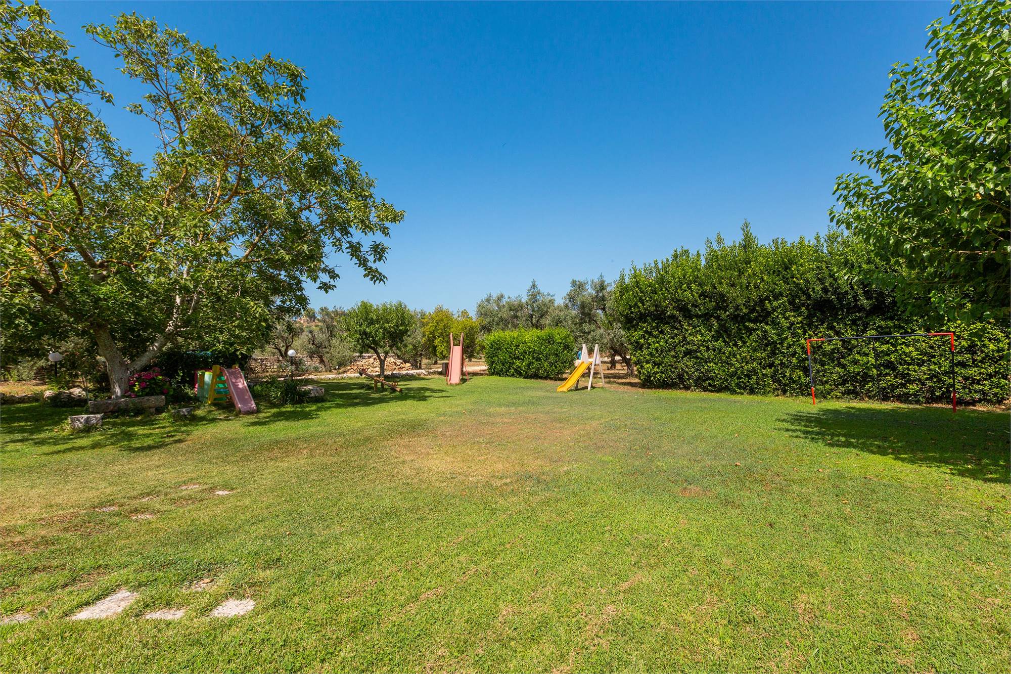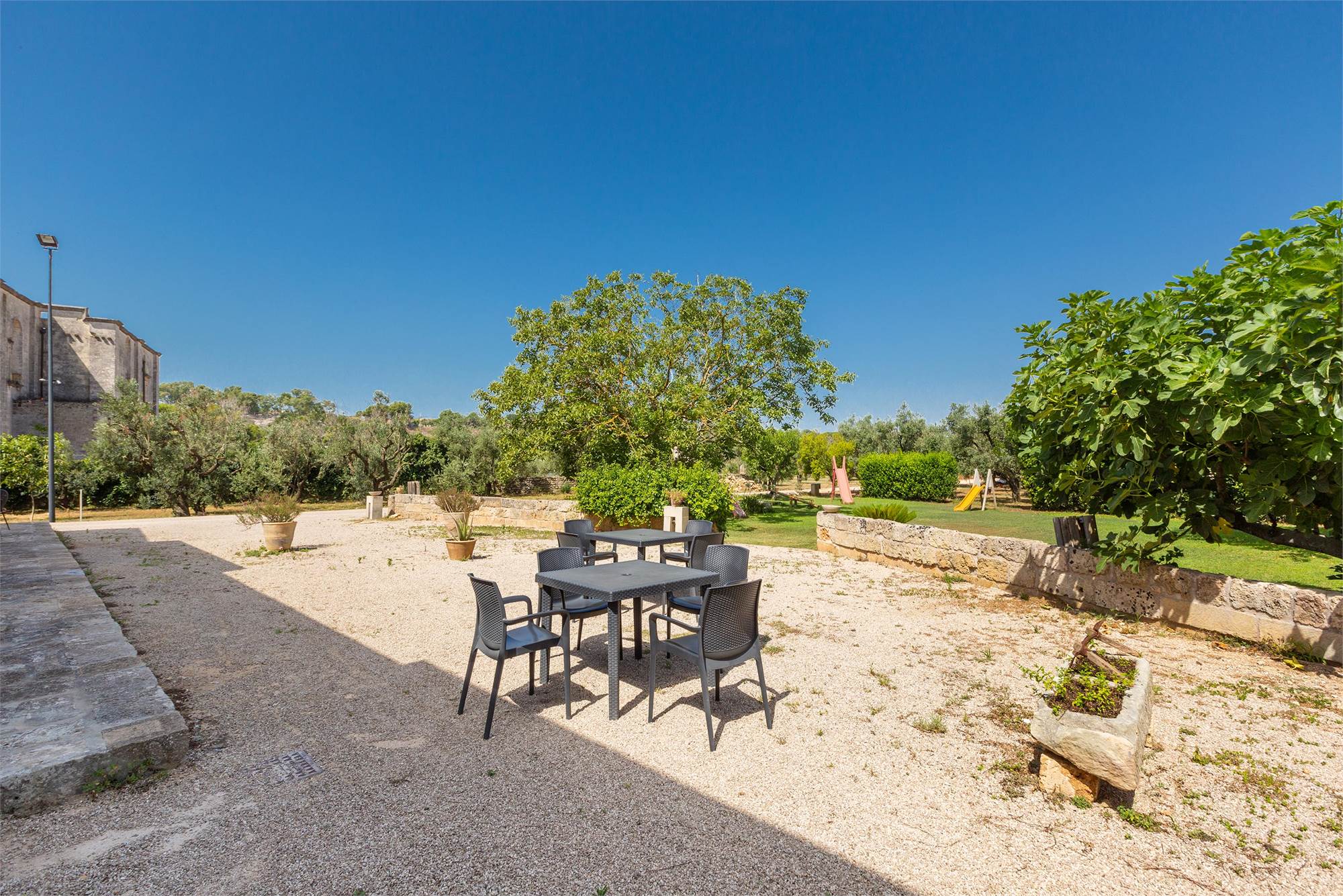 All rooms have balconies and are furnished with outdoor furniture, overlooking the beautiful garden in front of the property. The garden is embellished by an extraordinary variety of trees, hedges and flowers typical of Salento, and is equipped with a dedicated play area for children’s entertainment.