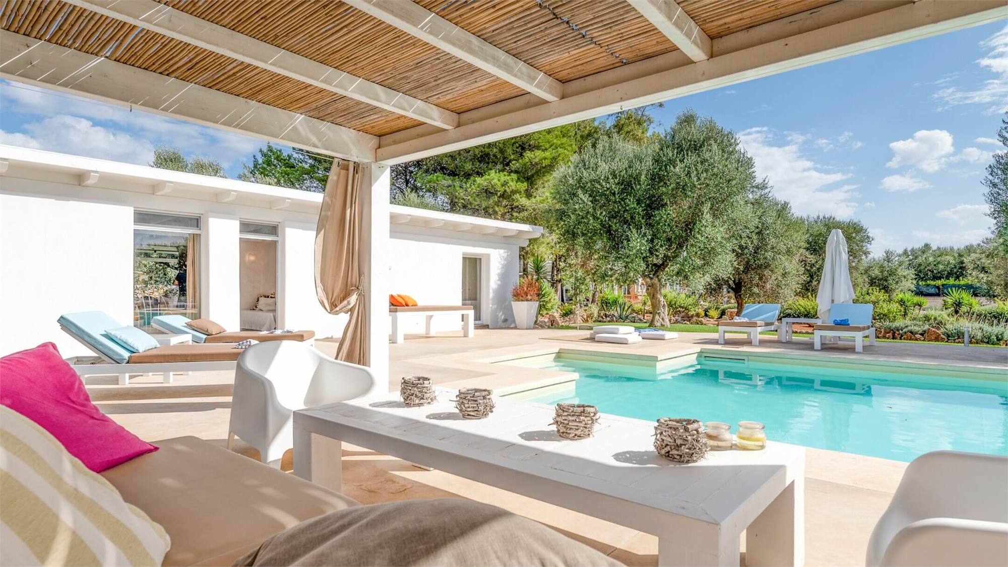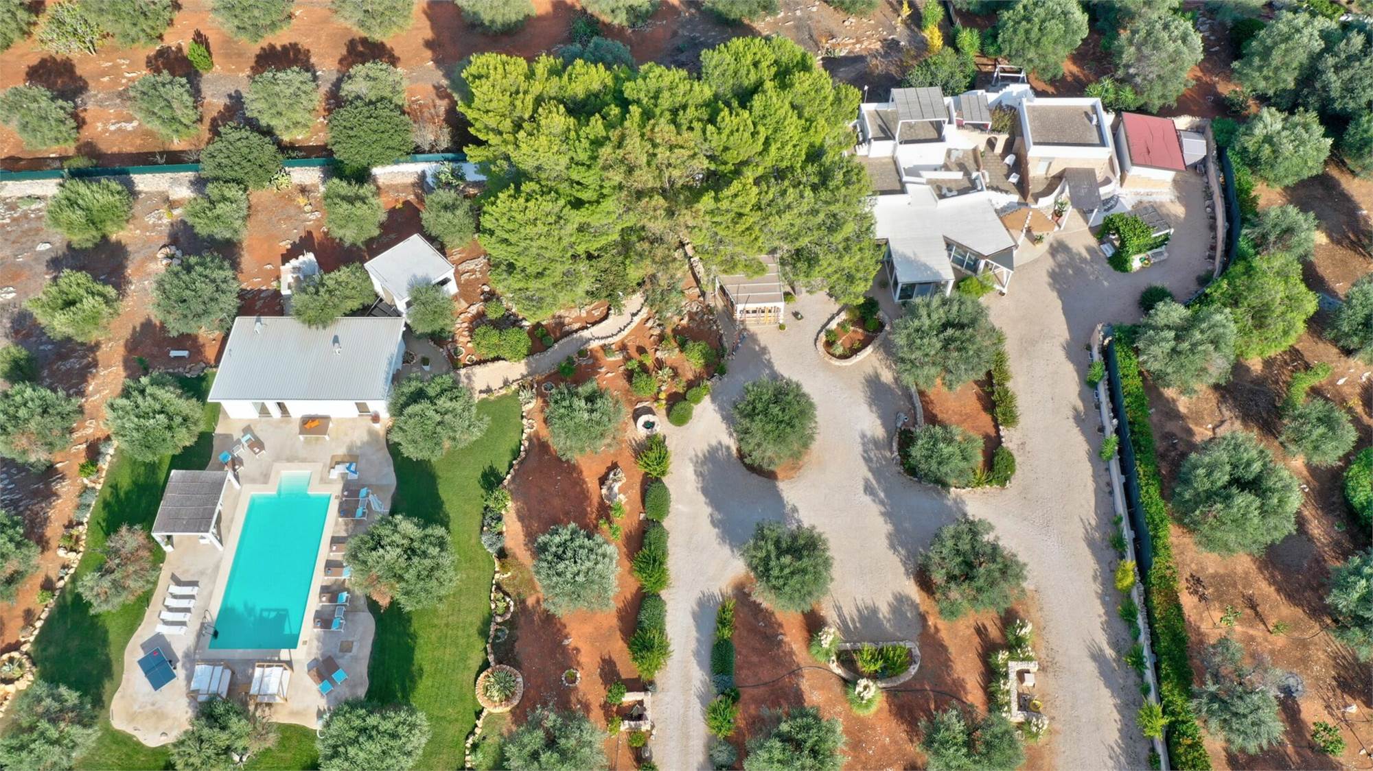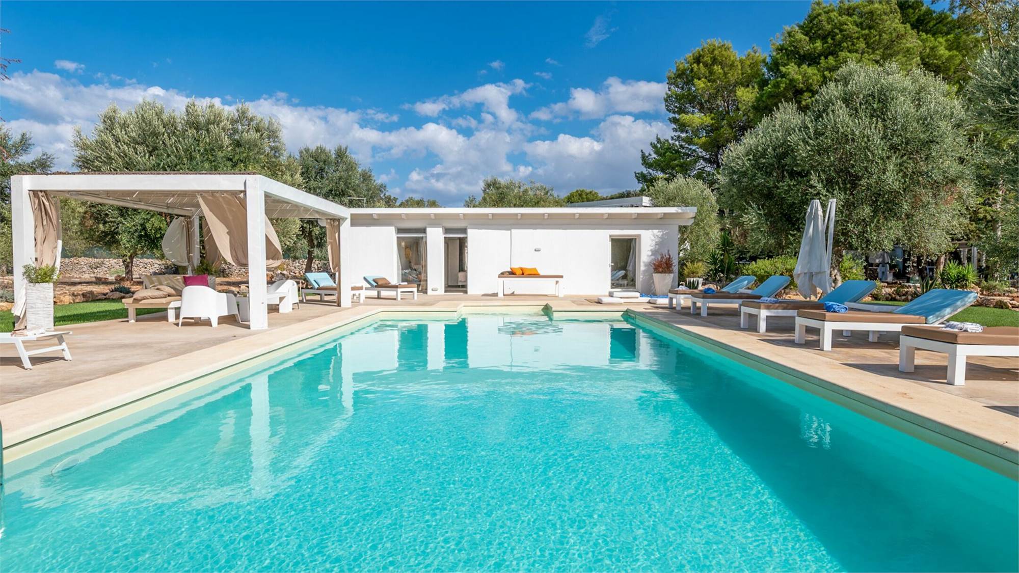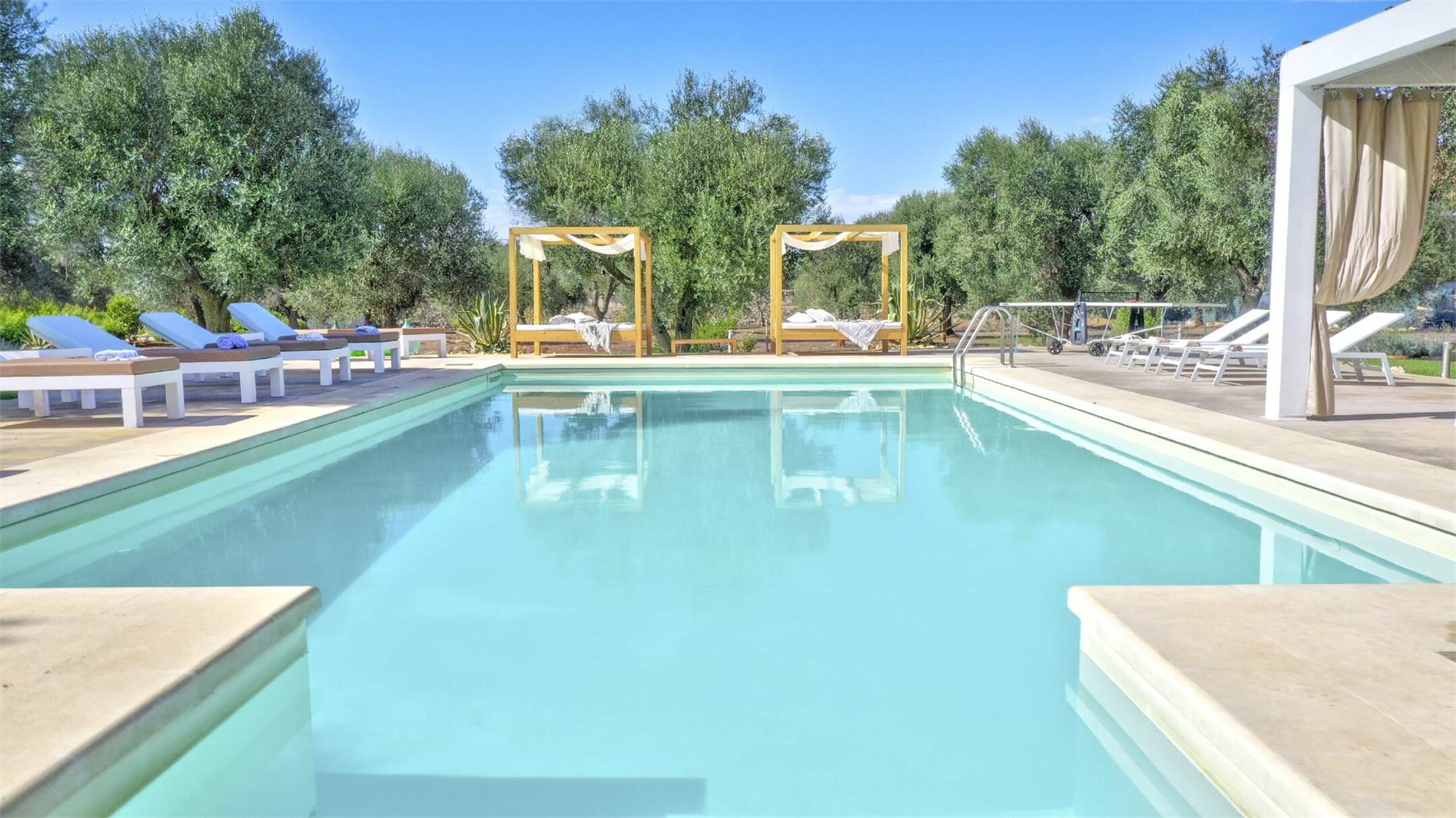 The external environments have been designed to satisfy every type of need, every external corner of the villa is used for relaxing activities: the swimming pool (12x6x1.4) with solarium surrounded by the olive trees that embrace the guest, the relaxation area for massages and finally the fitness area.