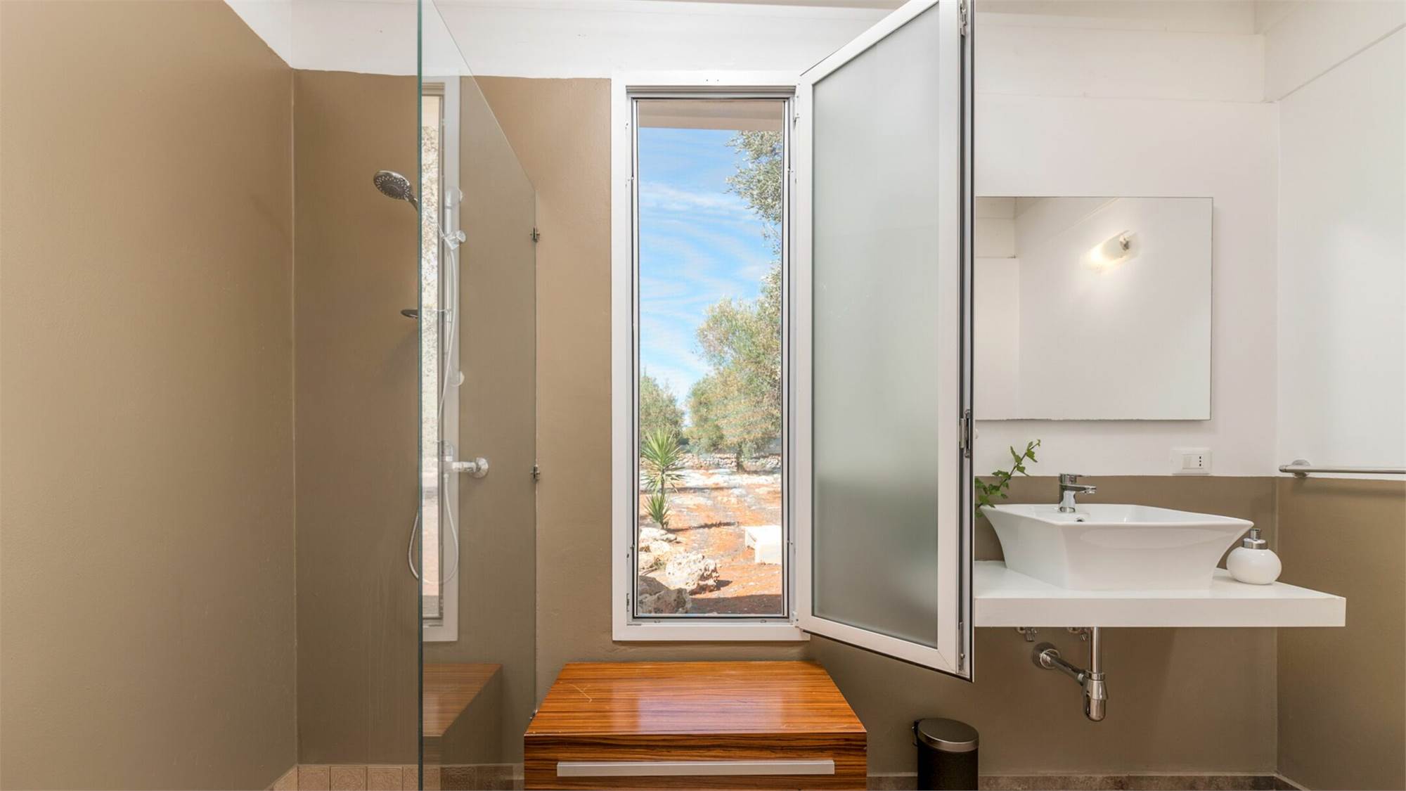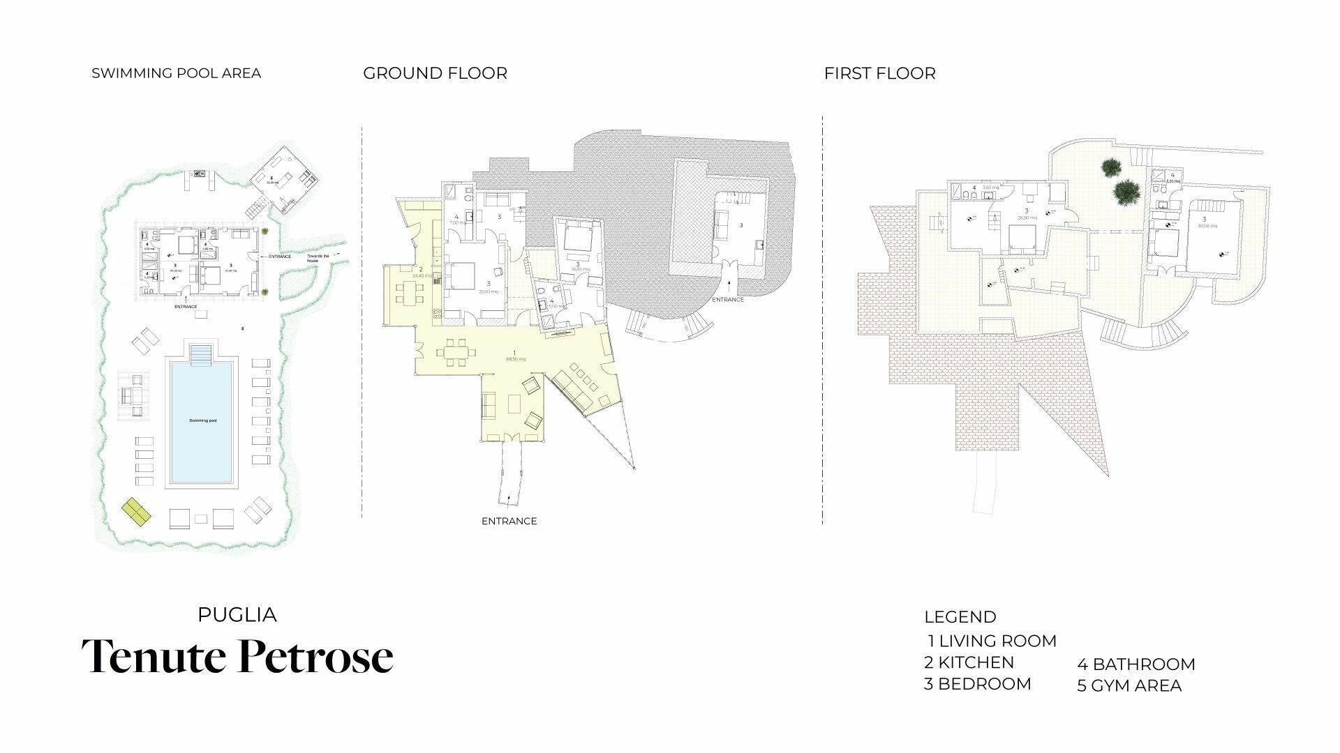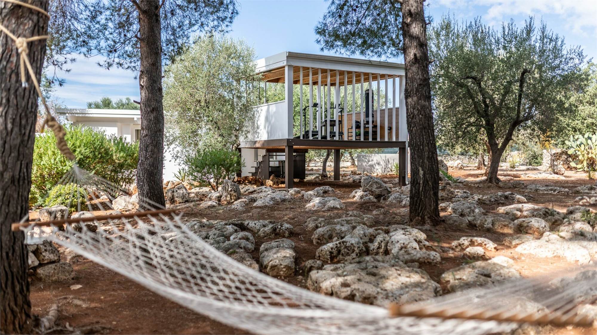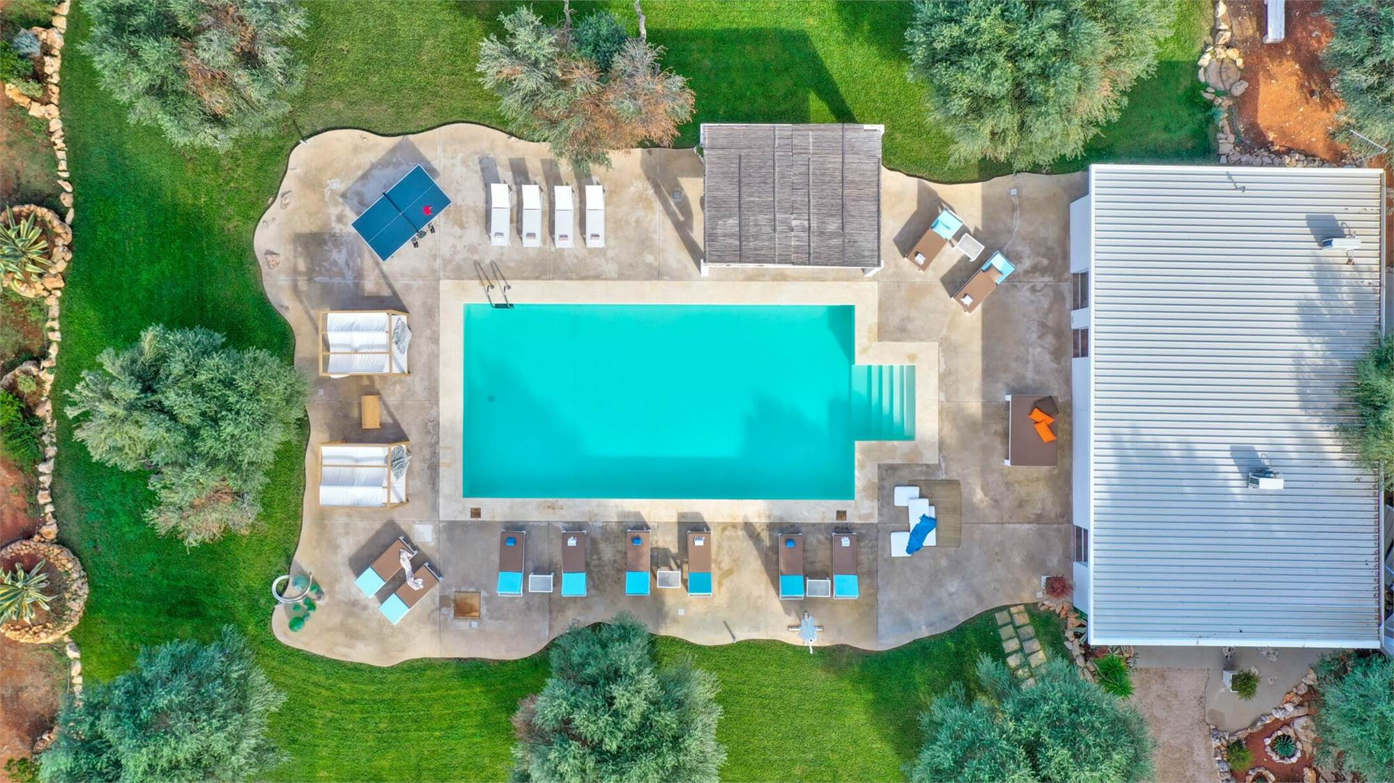 The external environments have been designed to satisfy every type of need, every external corner of the villa is used for relaxing activities: the swimming pool (12x6x1.4) with solarium surrounded by the olive trees that embrace the guest, the relaxation area for massages and finally the fitness area.