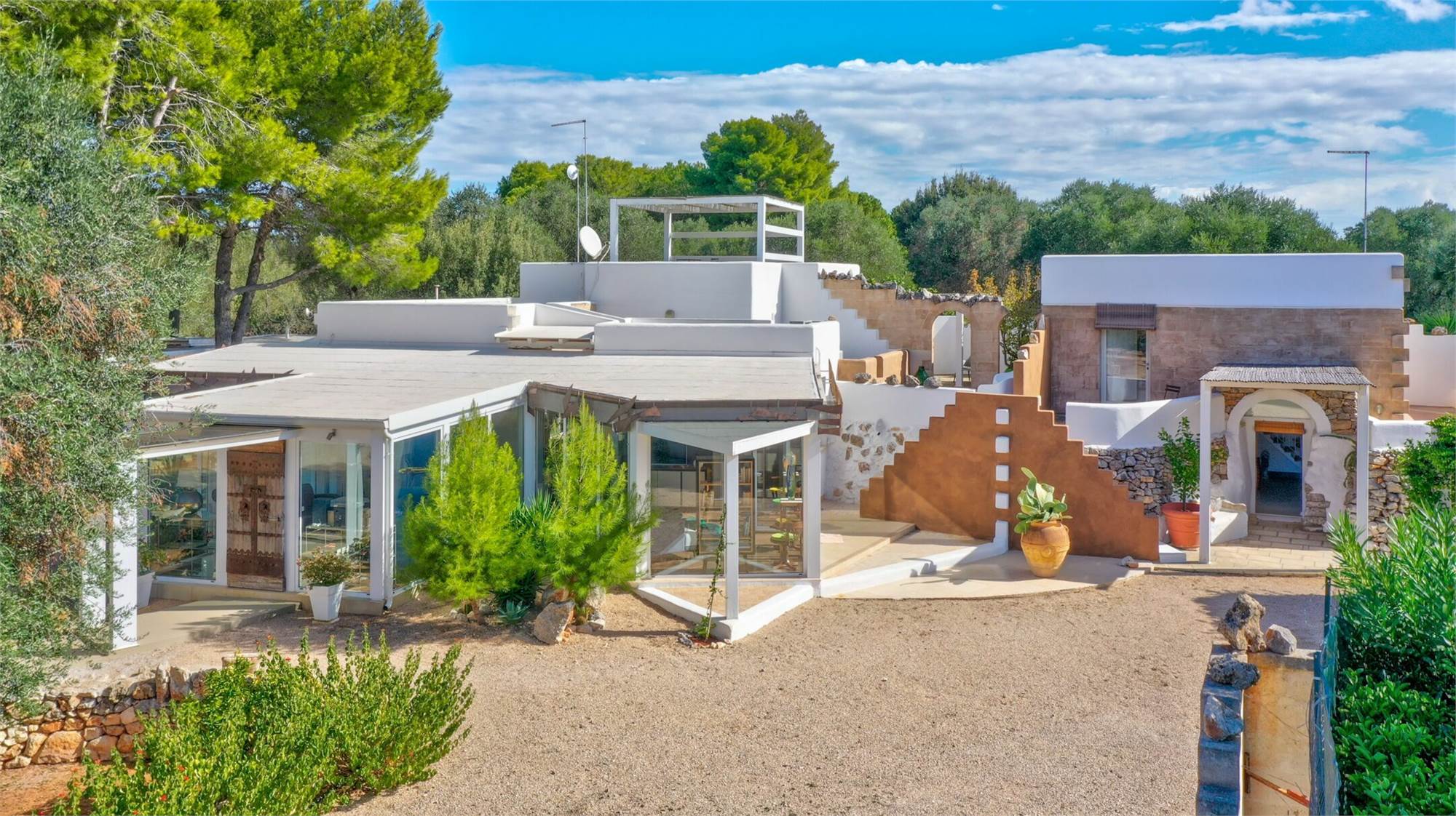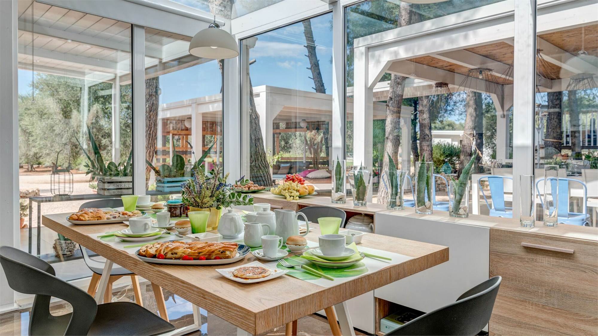 The prestigious property, surrounded by nature, is characterized by a minimal and at the same time modern style, with design objects and furnishings.