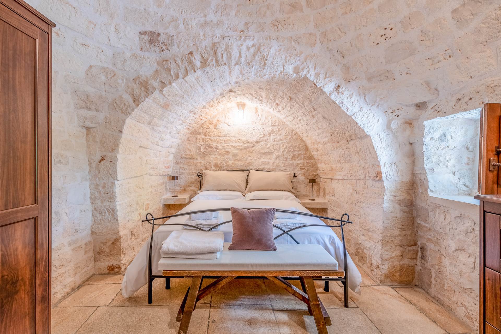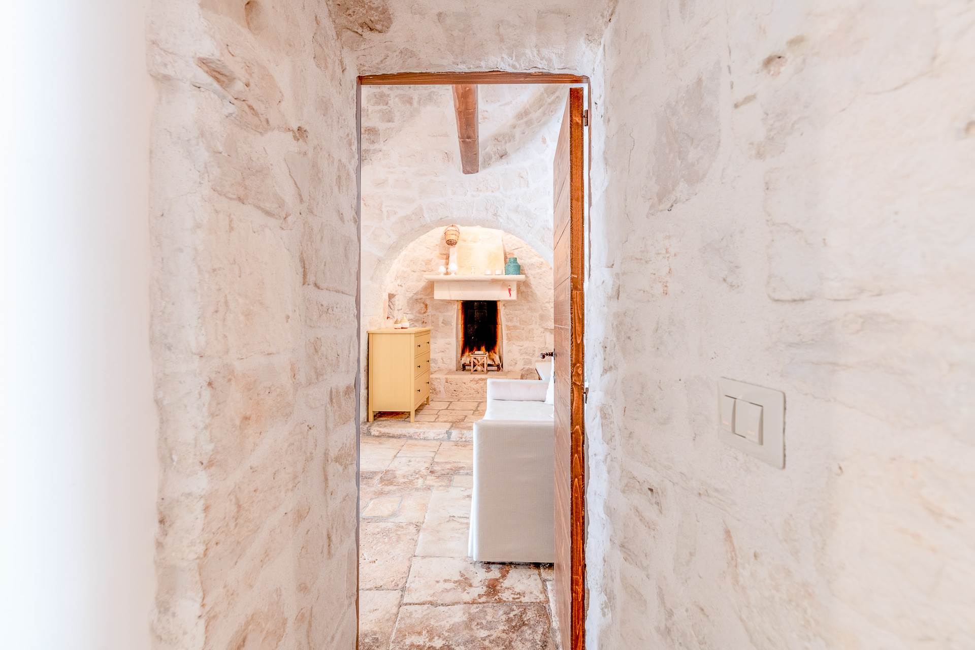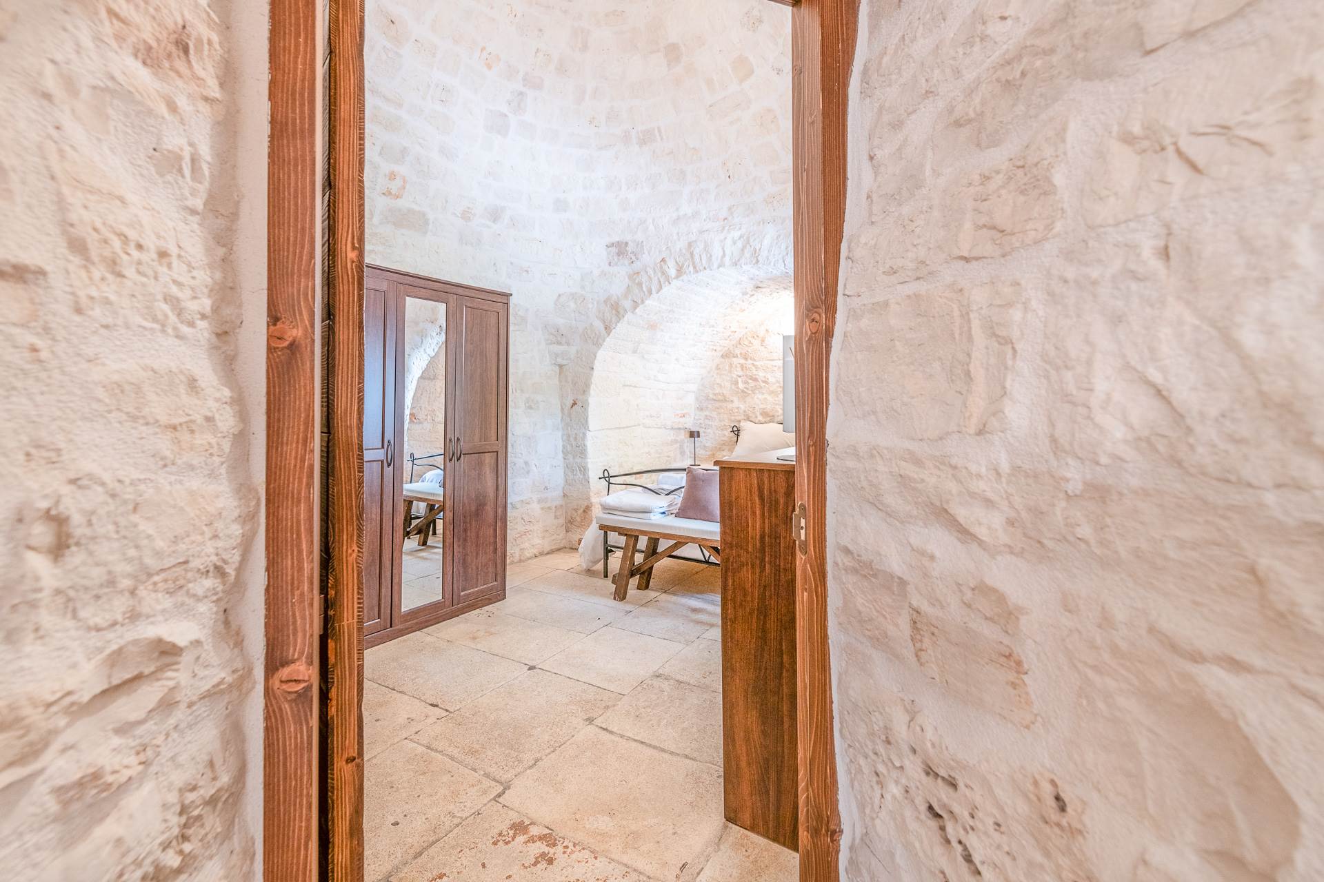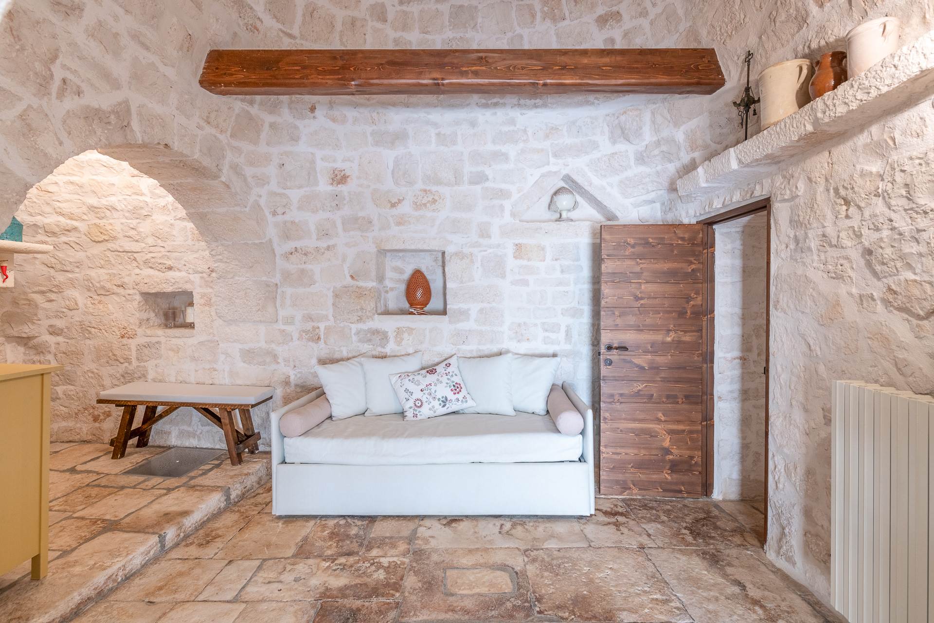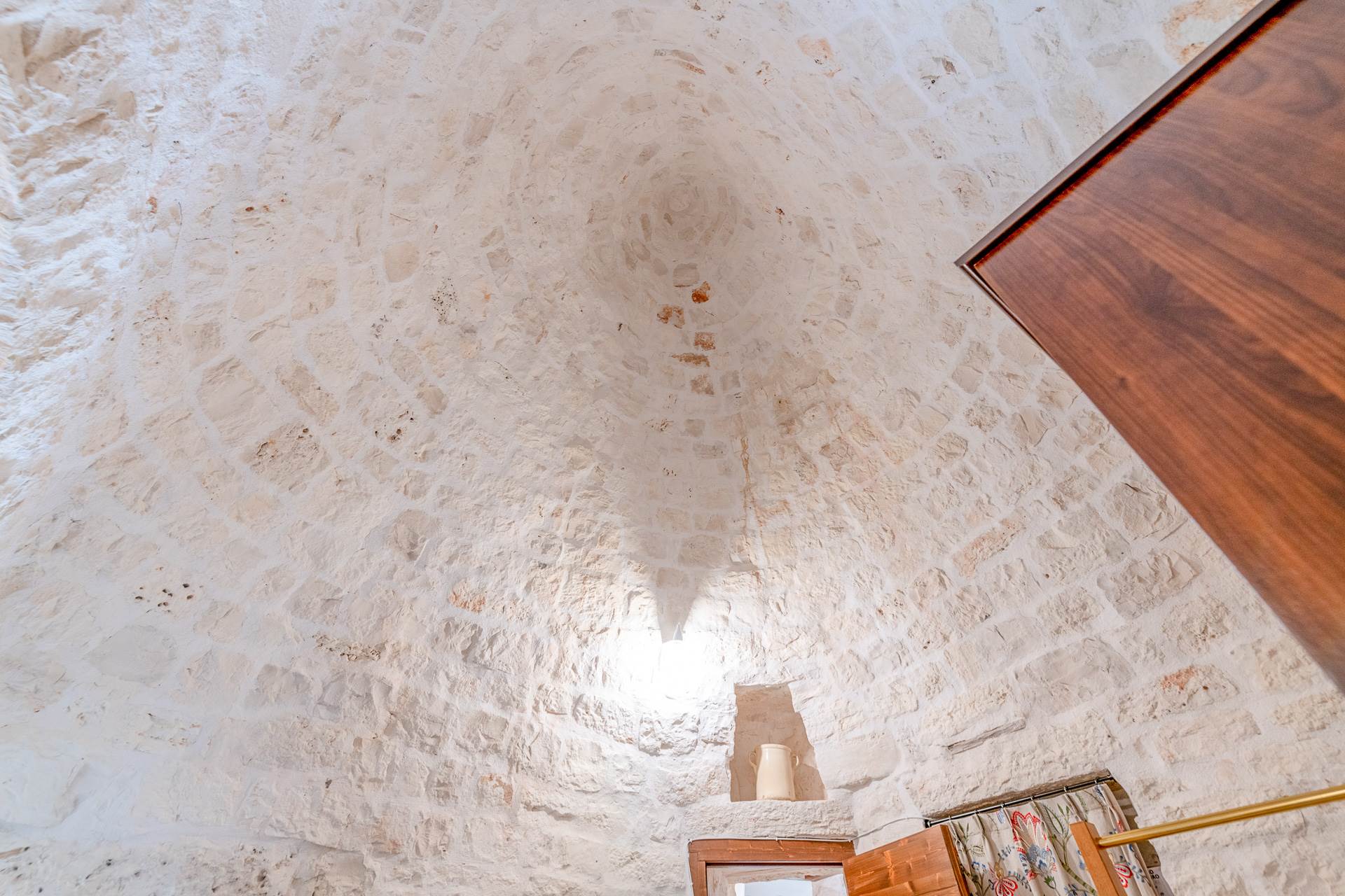 At the entrance to the main trullo there is a mezzanine which houses a French bed, optimizing the space and offering an additional rest area.
