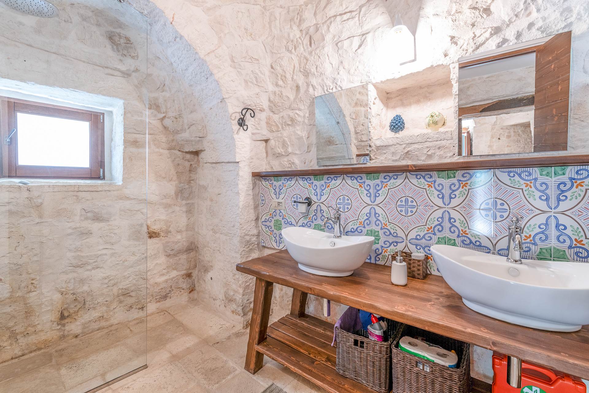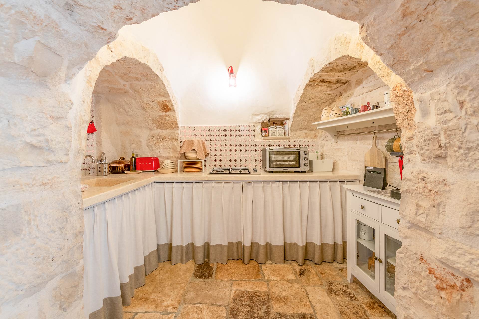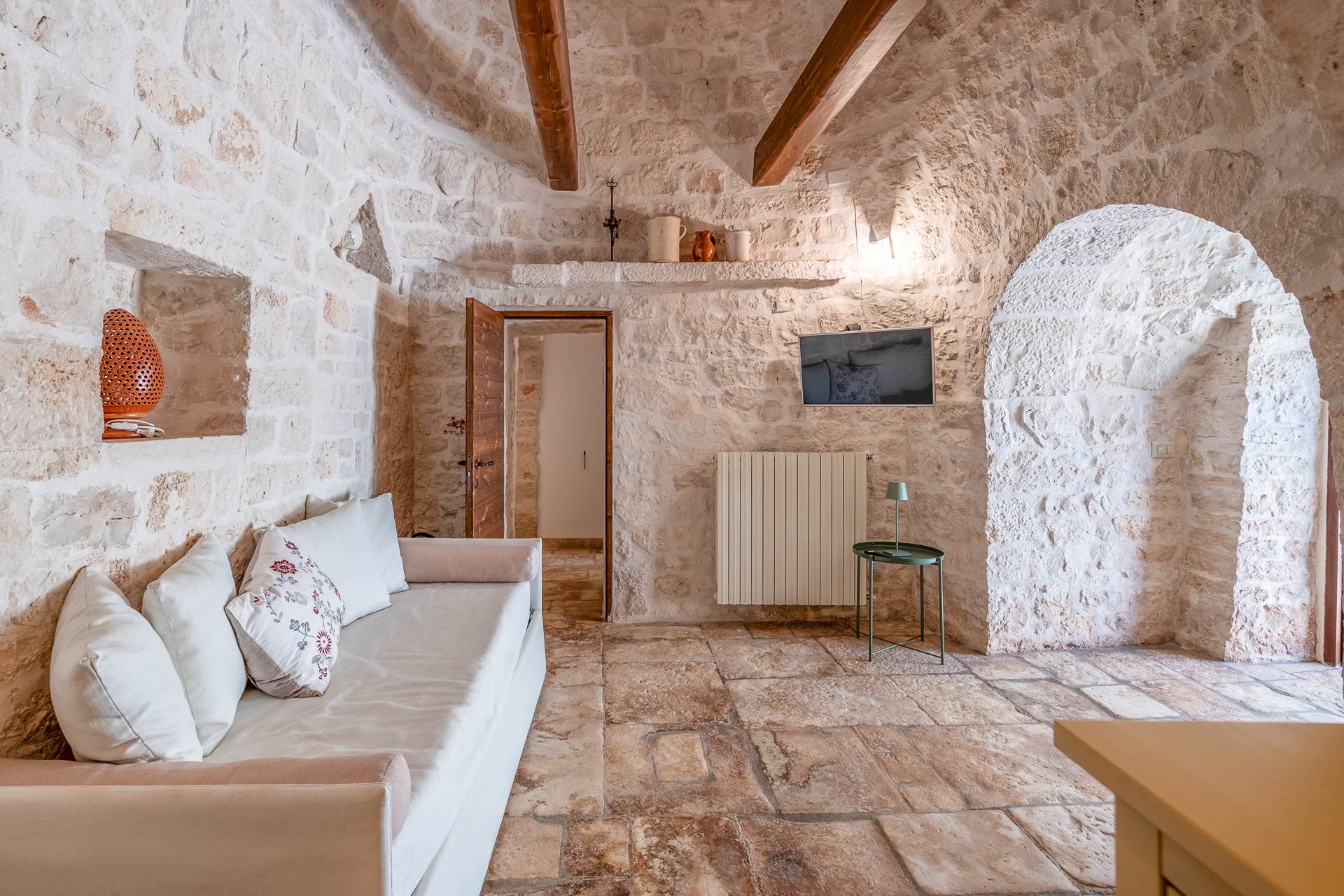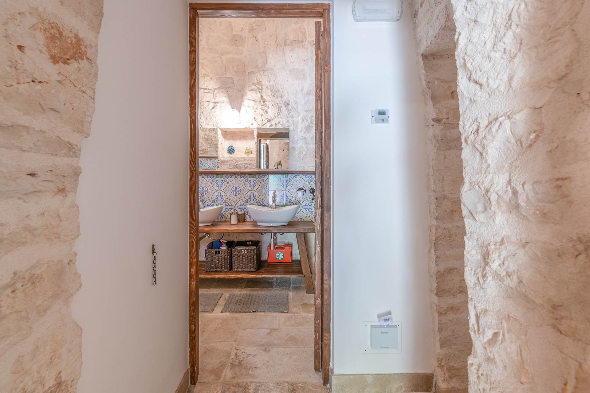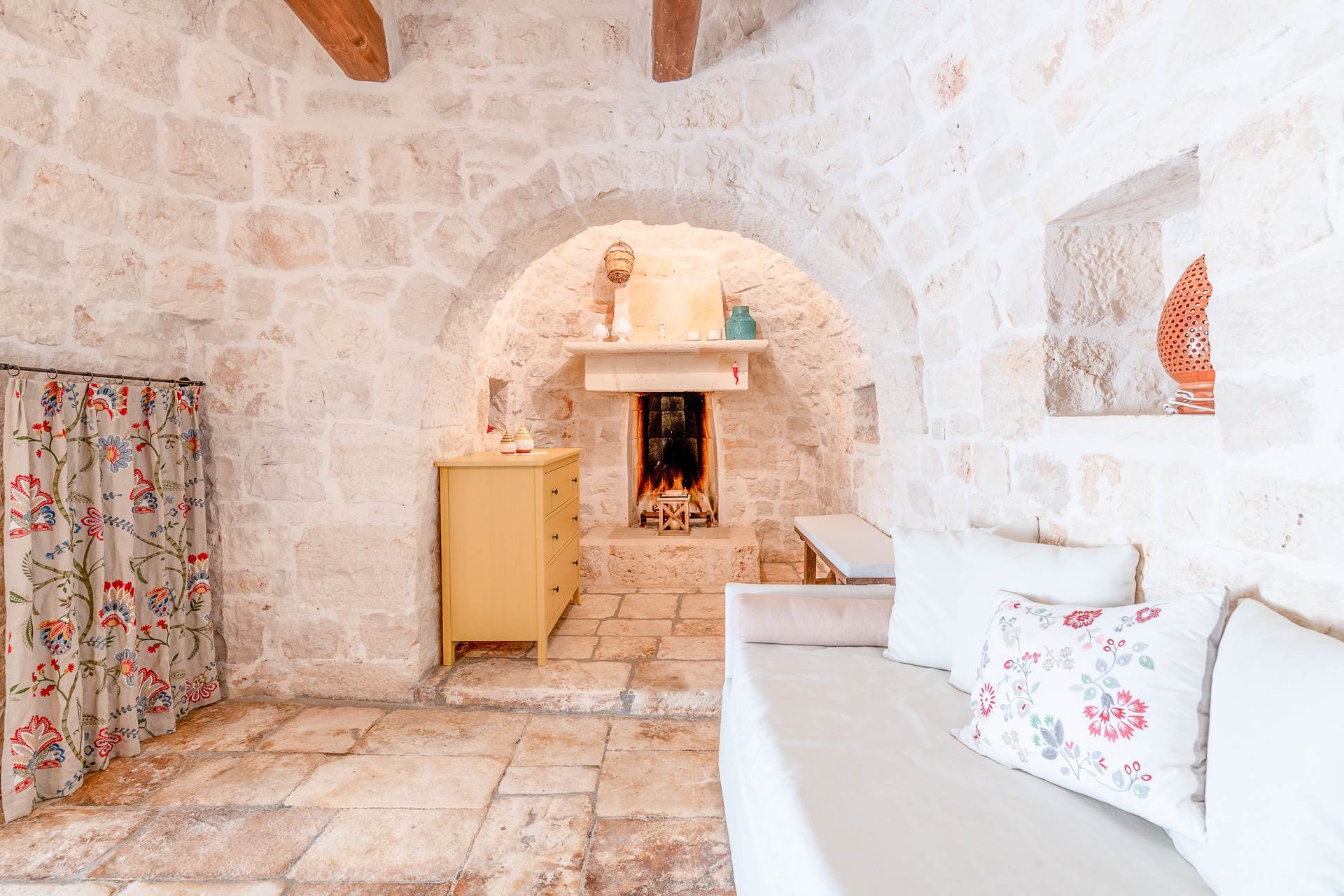 At the entrance to the main trullo there is a mezzanine which houses a French bed, optimizing the space and offering an additional rest area.