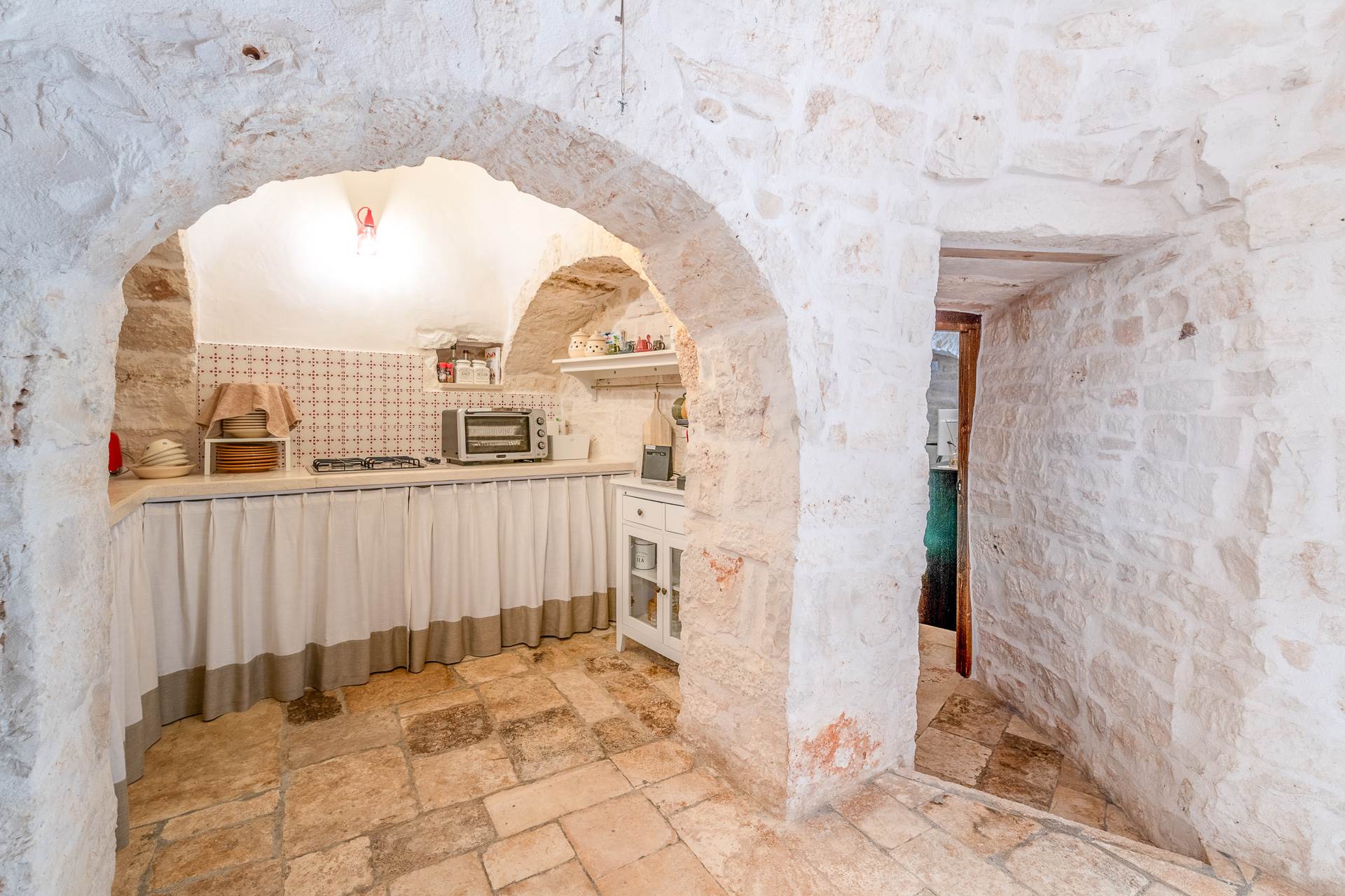The entrance to the property opens onto a dining room which integrates an open kitchen, positioned inside a trullo. This unique configuration creates an evocative and welcoming environment, perfect for entertaining guests and enjoying convivial moments.