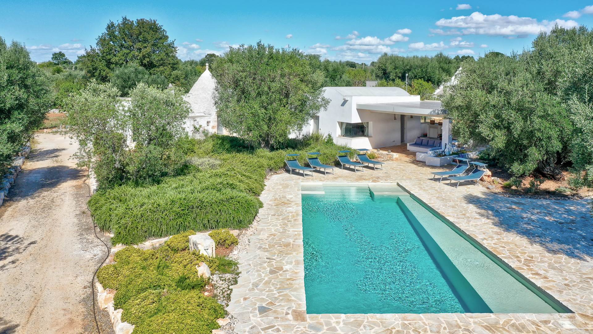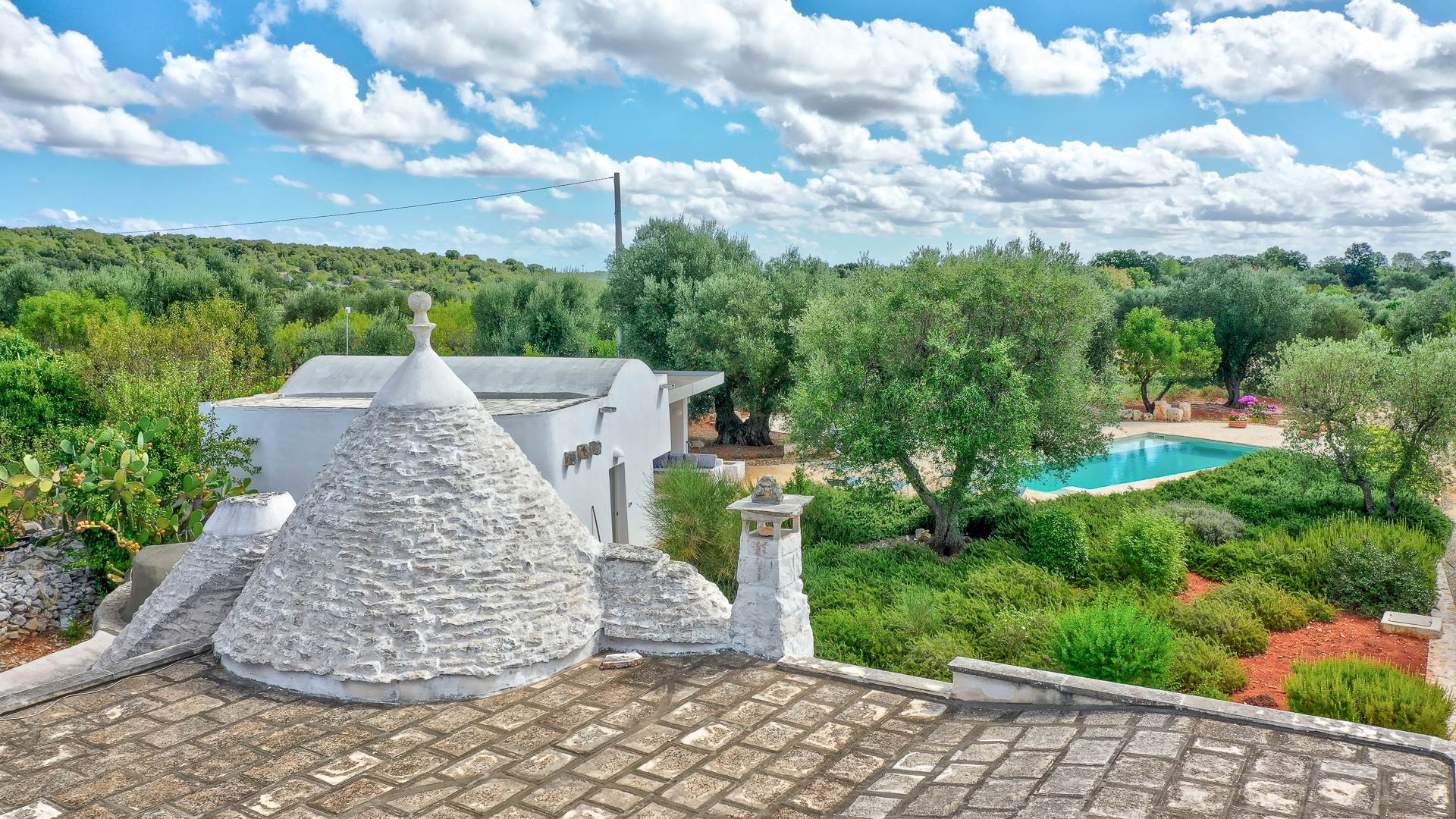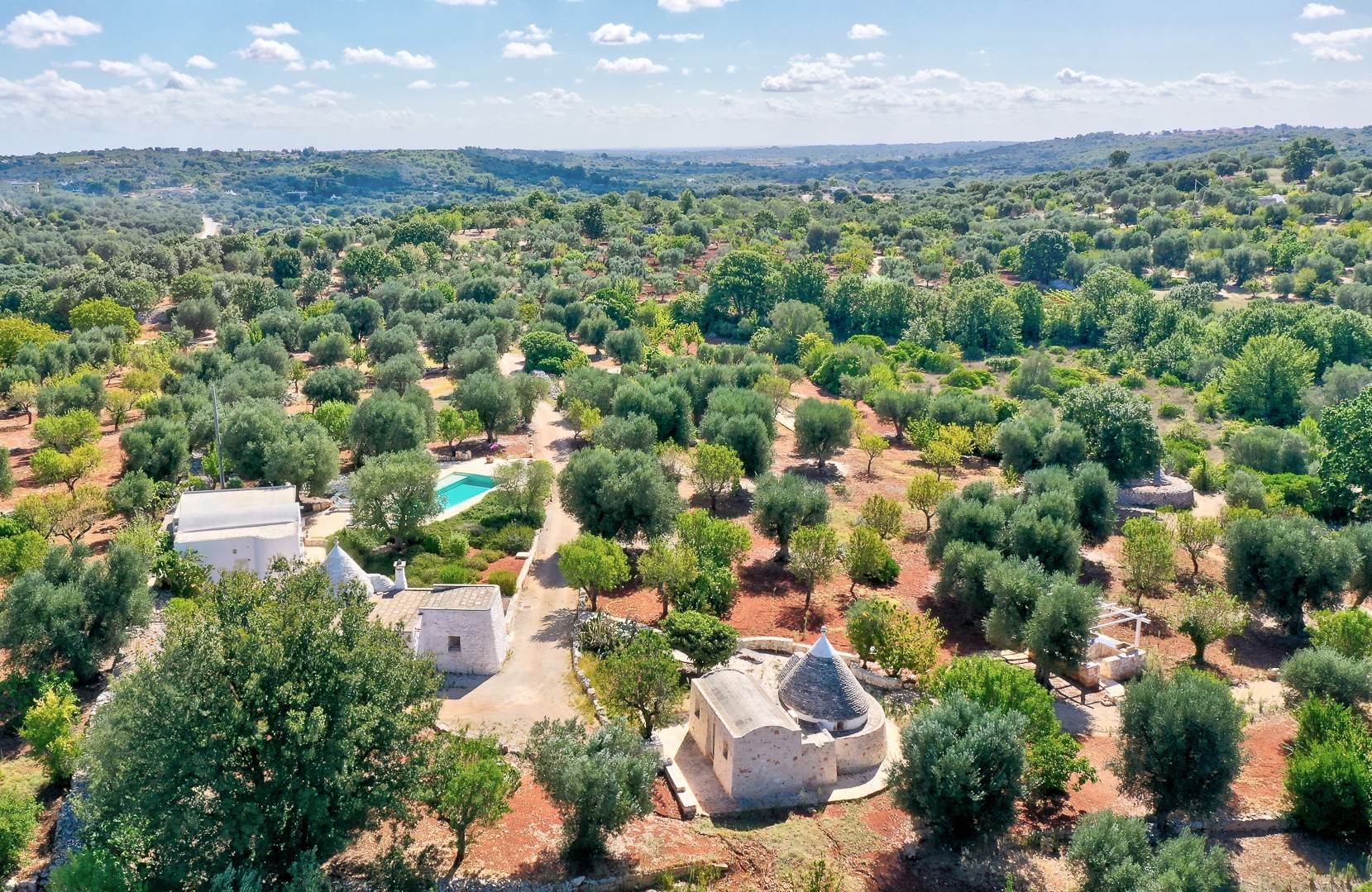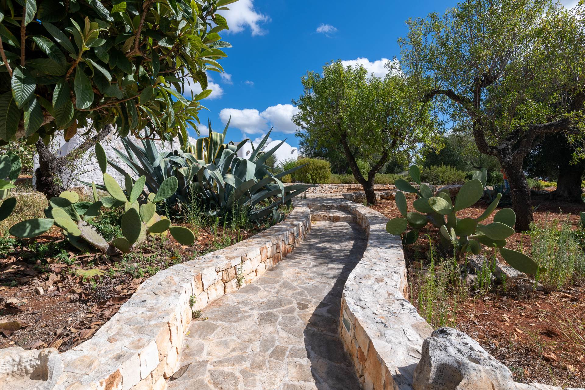 The landscape surrounding the property offers the characteristic views of the Itria Valley, with wide views of fields sown or flowered, depending on the season, interrupted by centuries-old olive trees and dry stone walls.