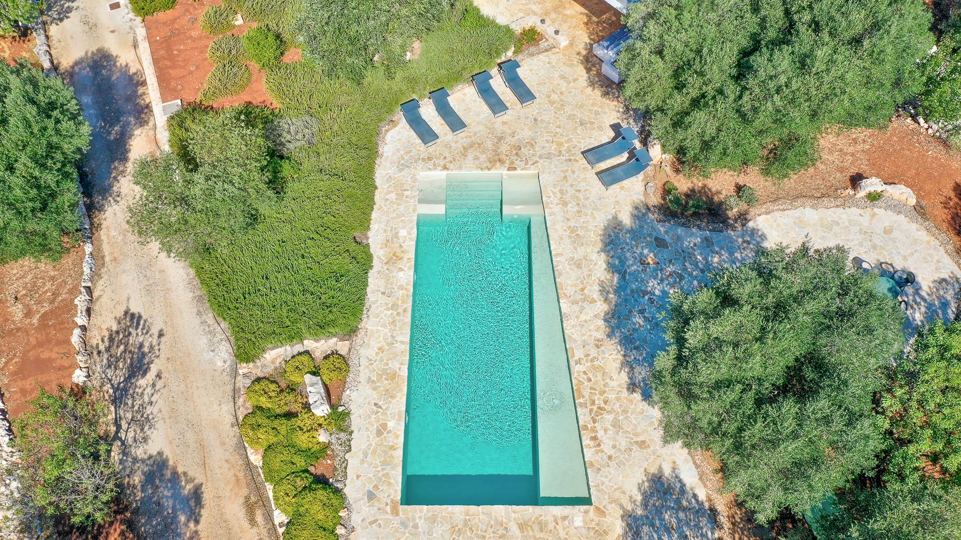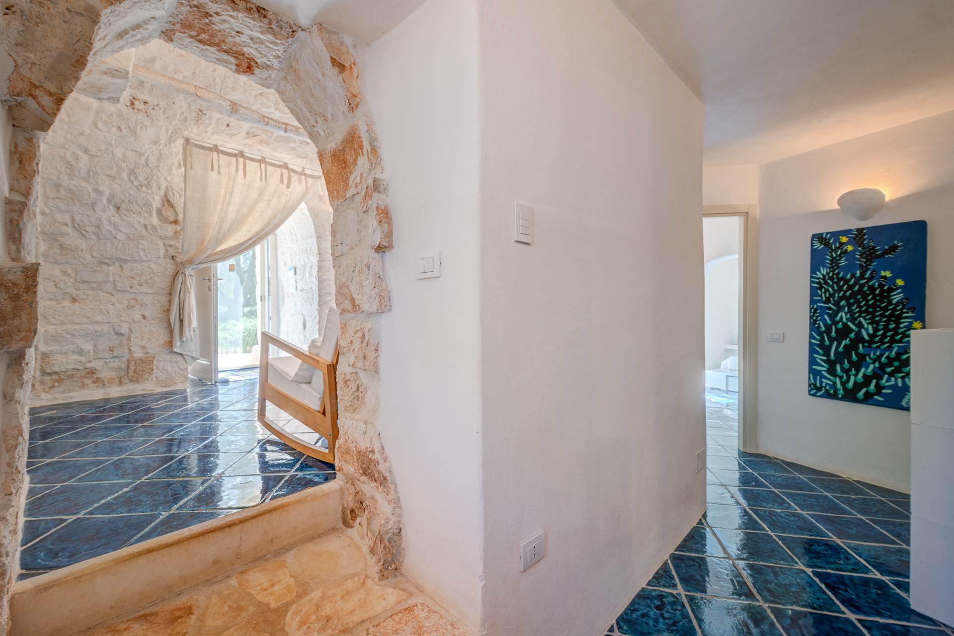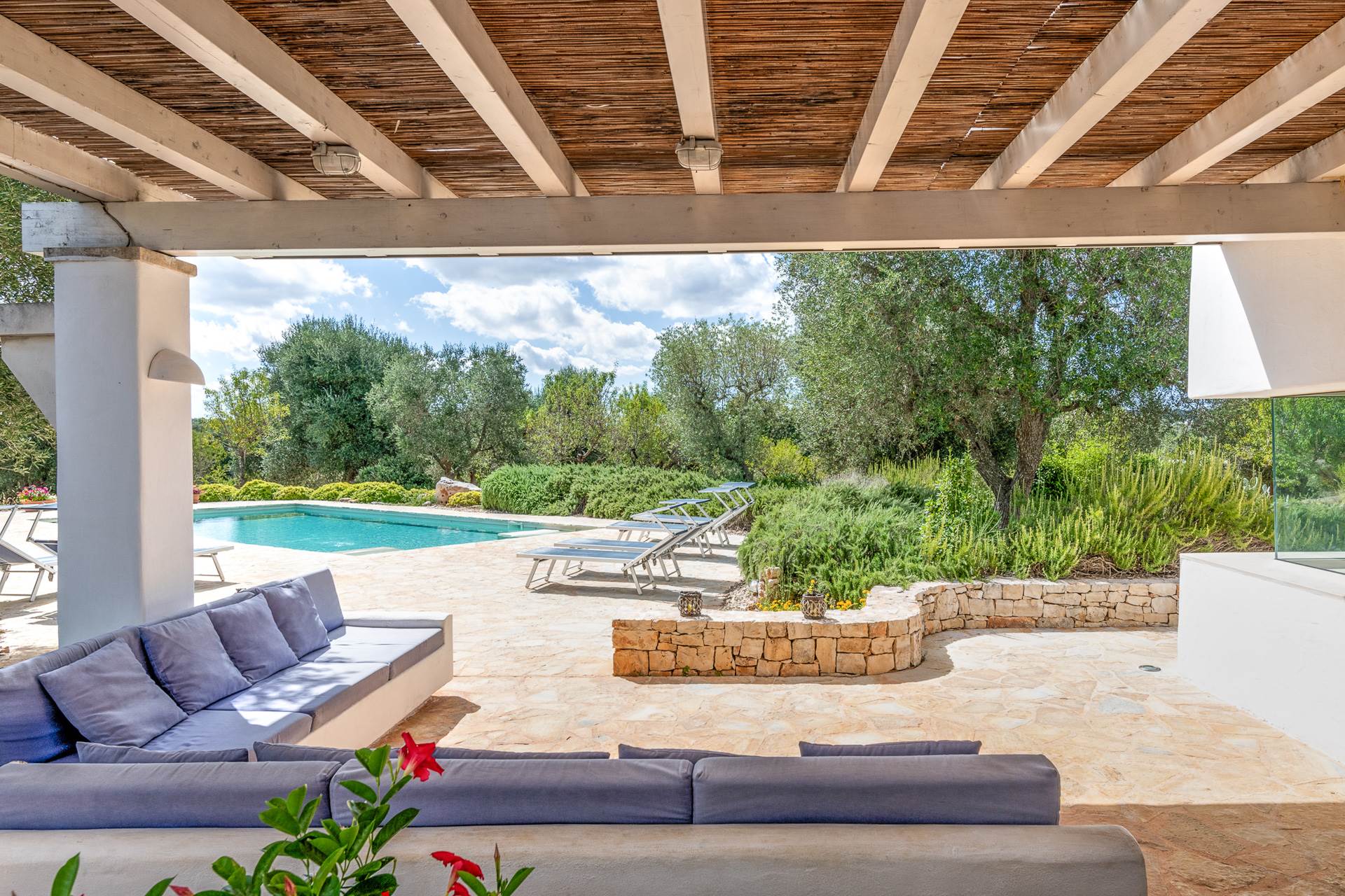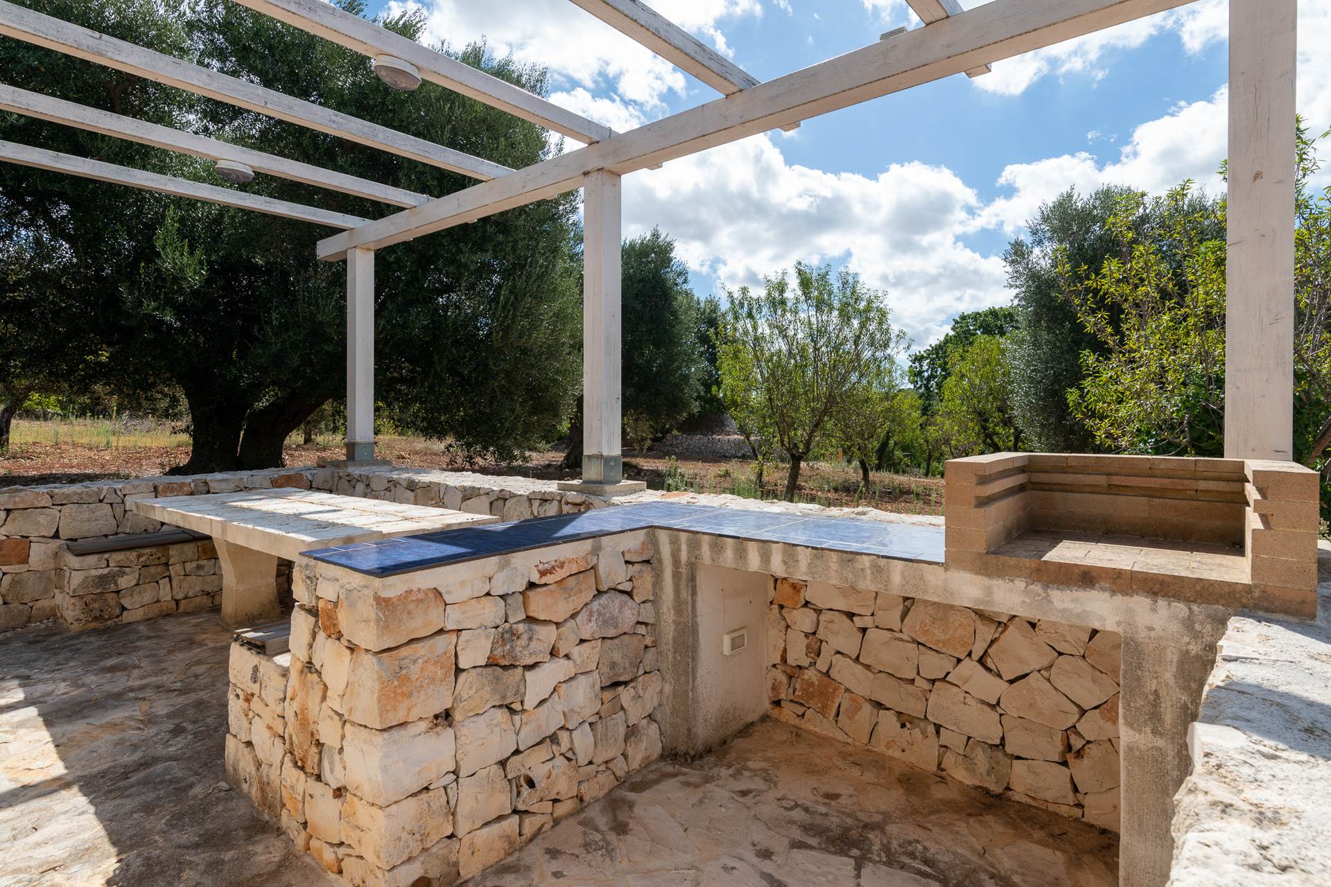 The landscape surrounding the property offers the characteristic views of the Itria Valley, with wide views of fields sown or flowered, depending on the season, interrupted by centuries-old olive trees and dry stone walls.