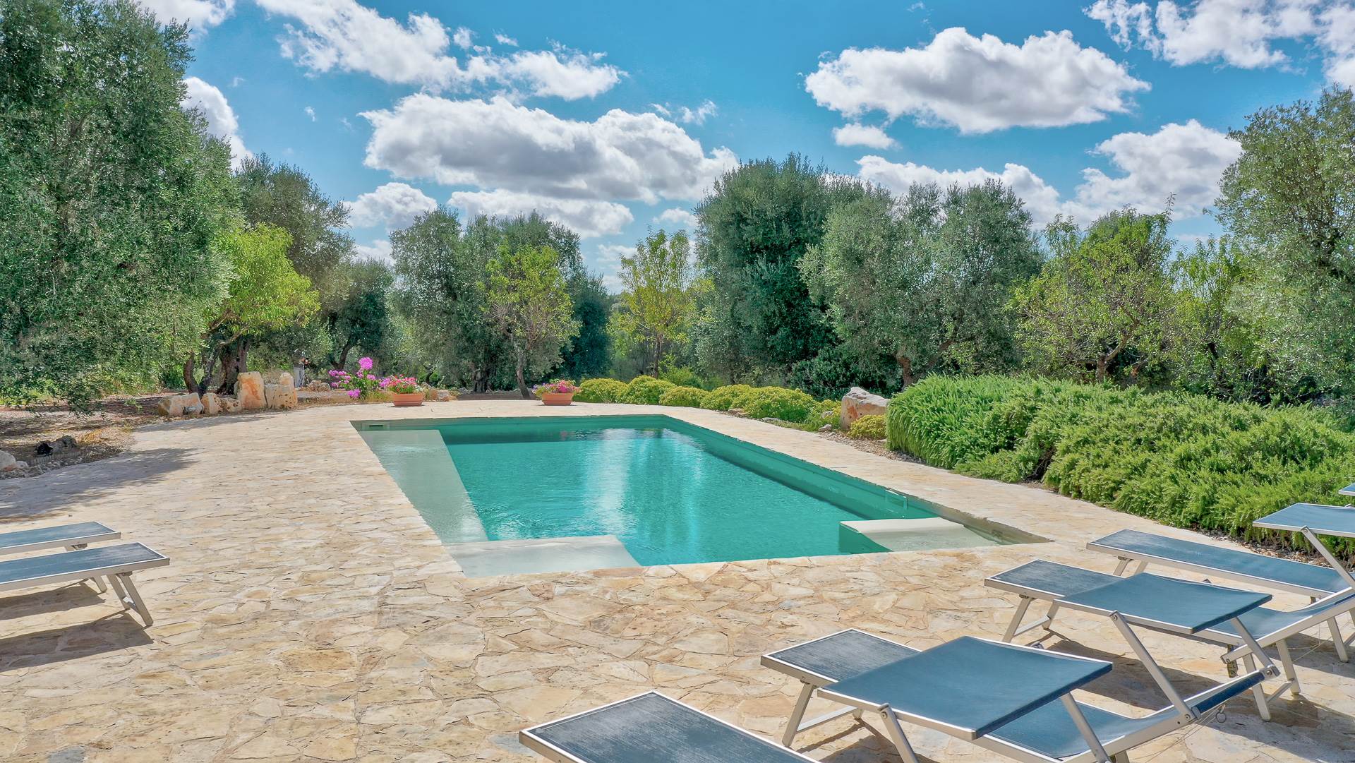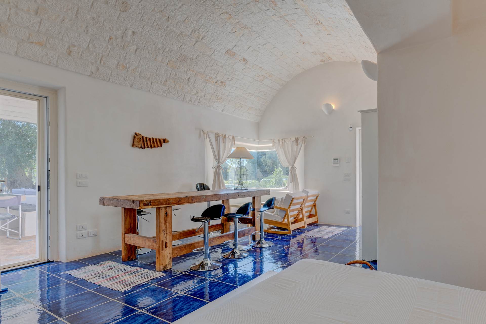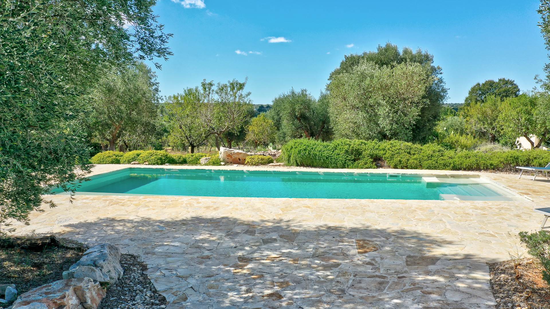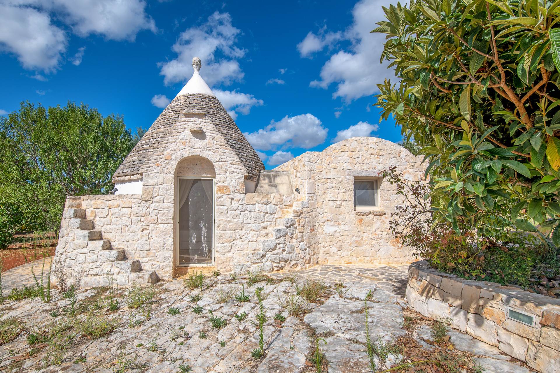 The landscape surrounding the property offers the characteristic views of the Itria Valley, with wide views of fields sown or flowered, depending on the season, interrupted by centuries-old olive trees and dry stone walls.