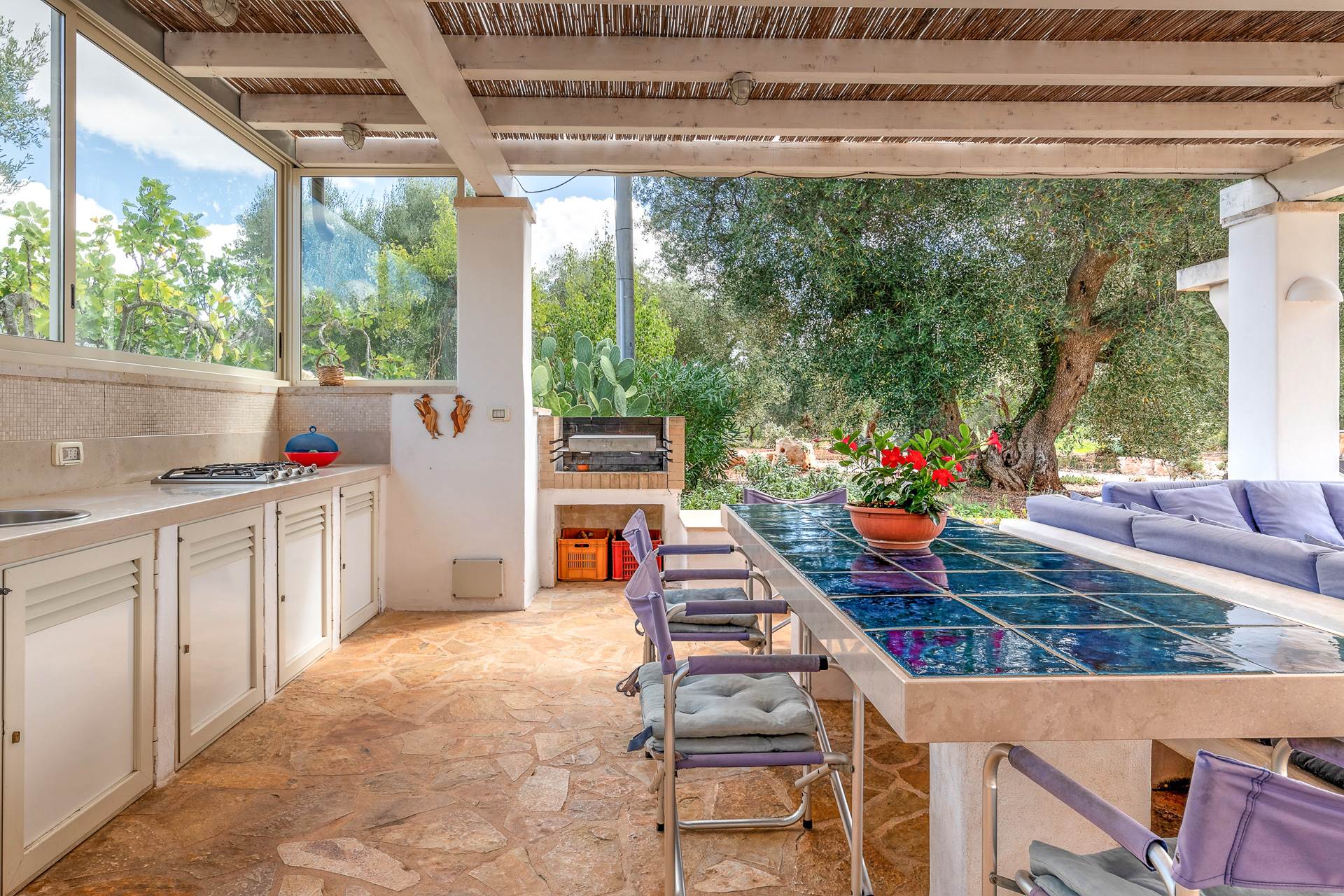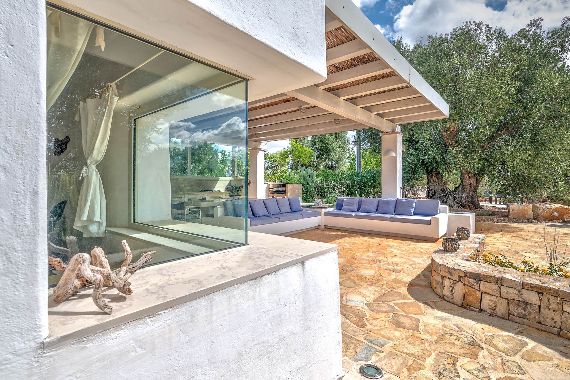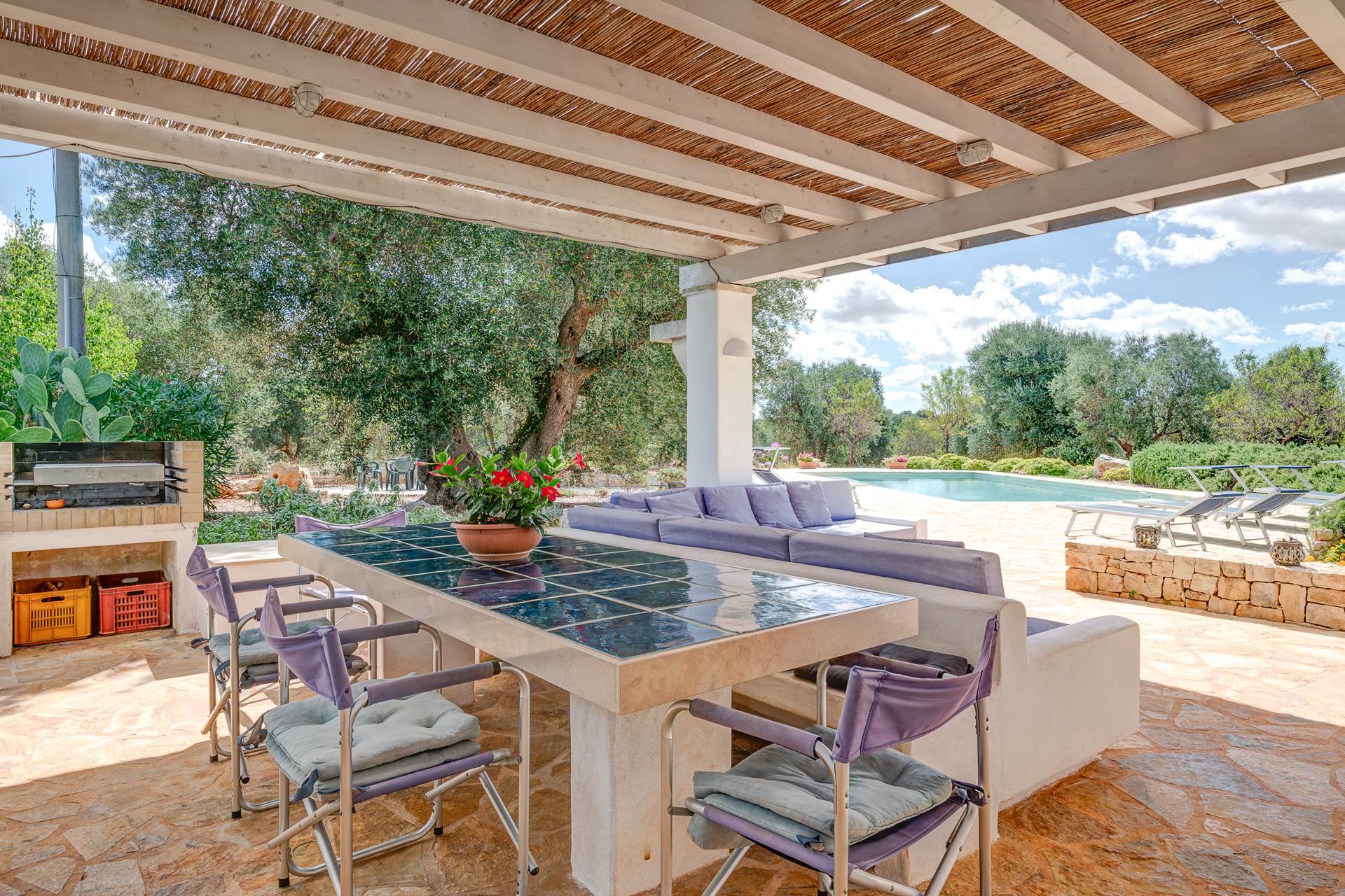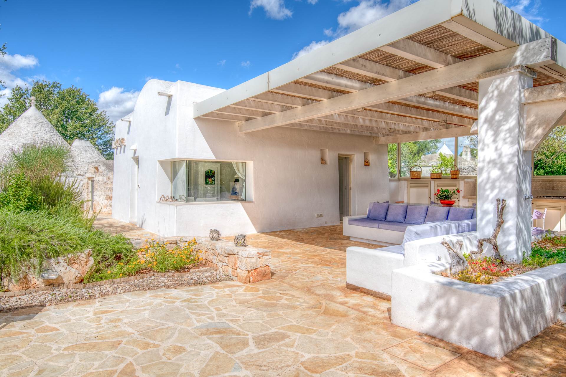 On one side of the lamia a large porch houses a comfortable living area with kitchen, barbecue and masonry sofas.
