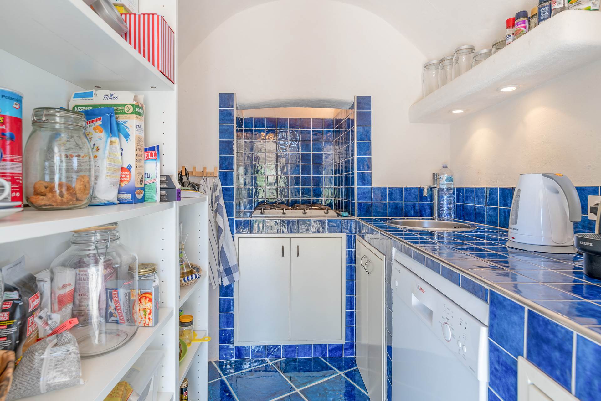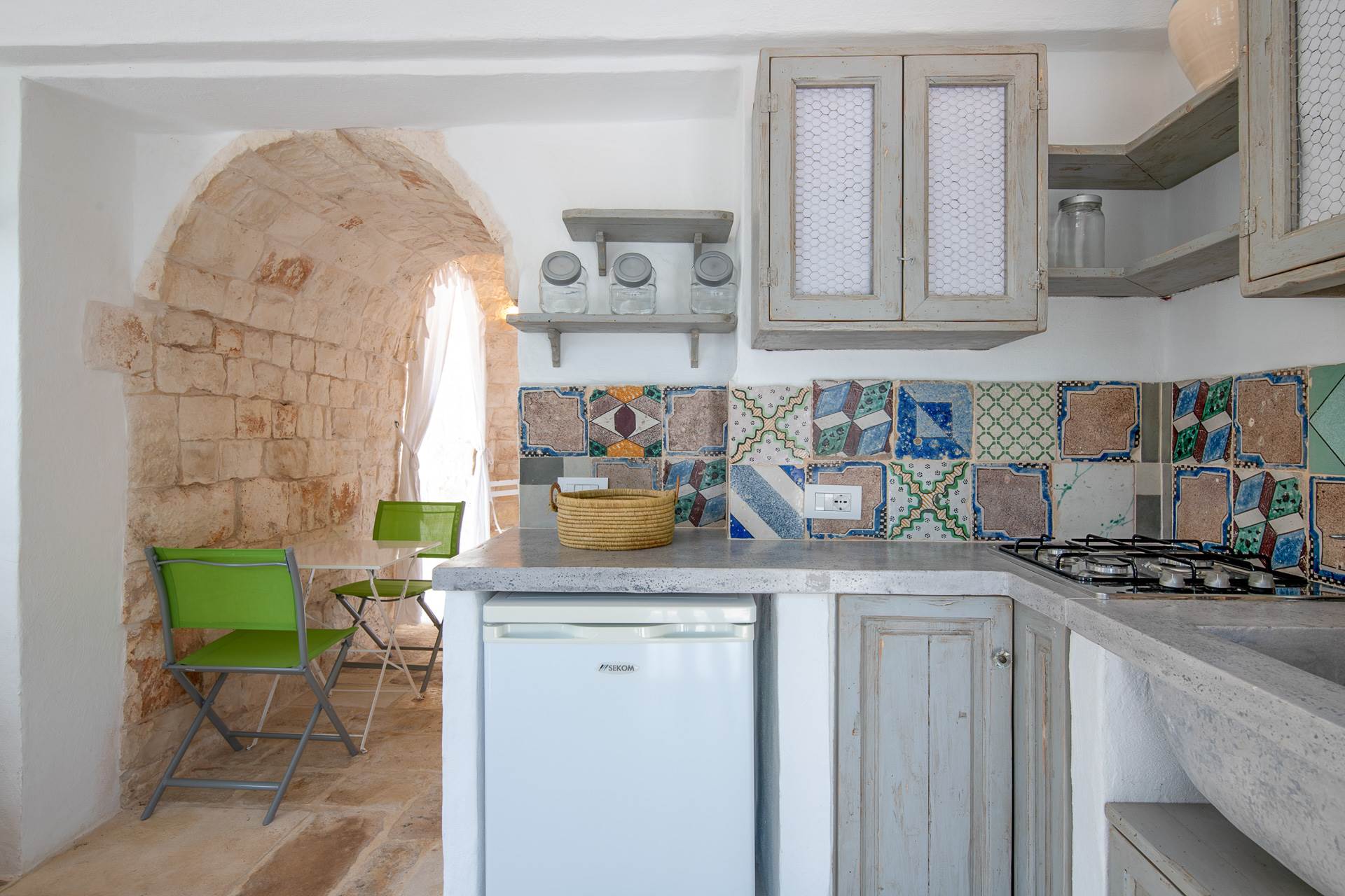 On the opposite side of the lamia, inside an old oven, a comfortable kitchenette has been created.