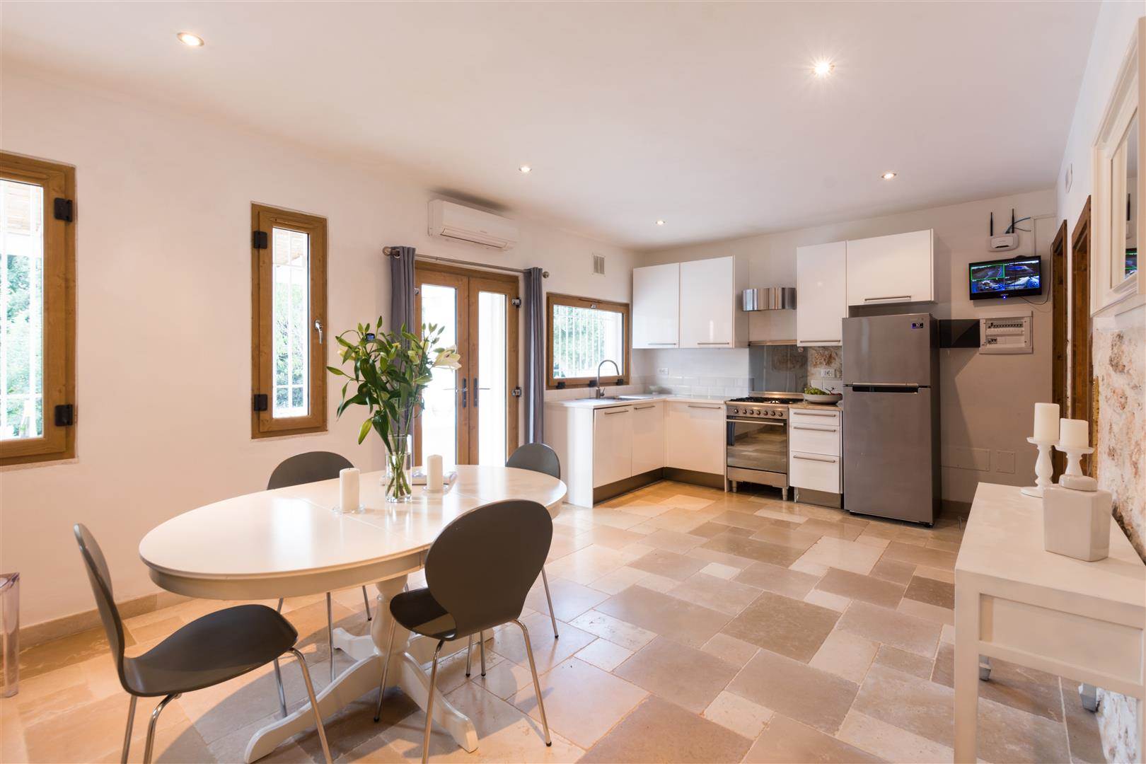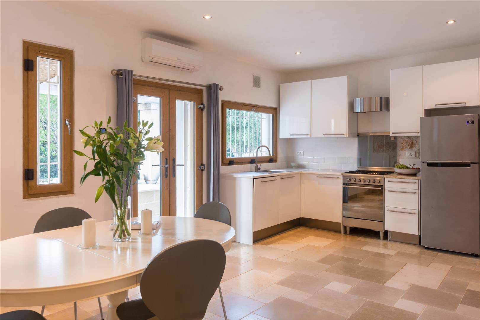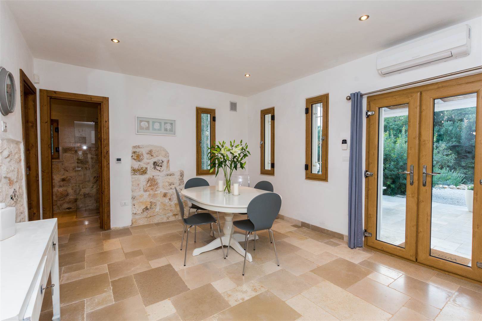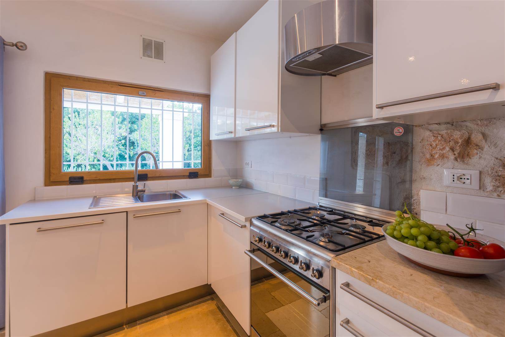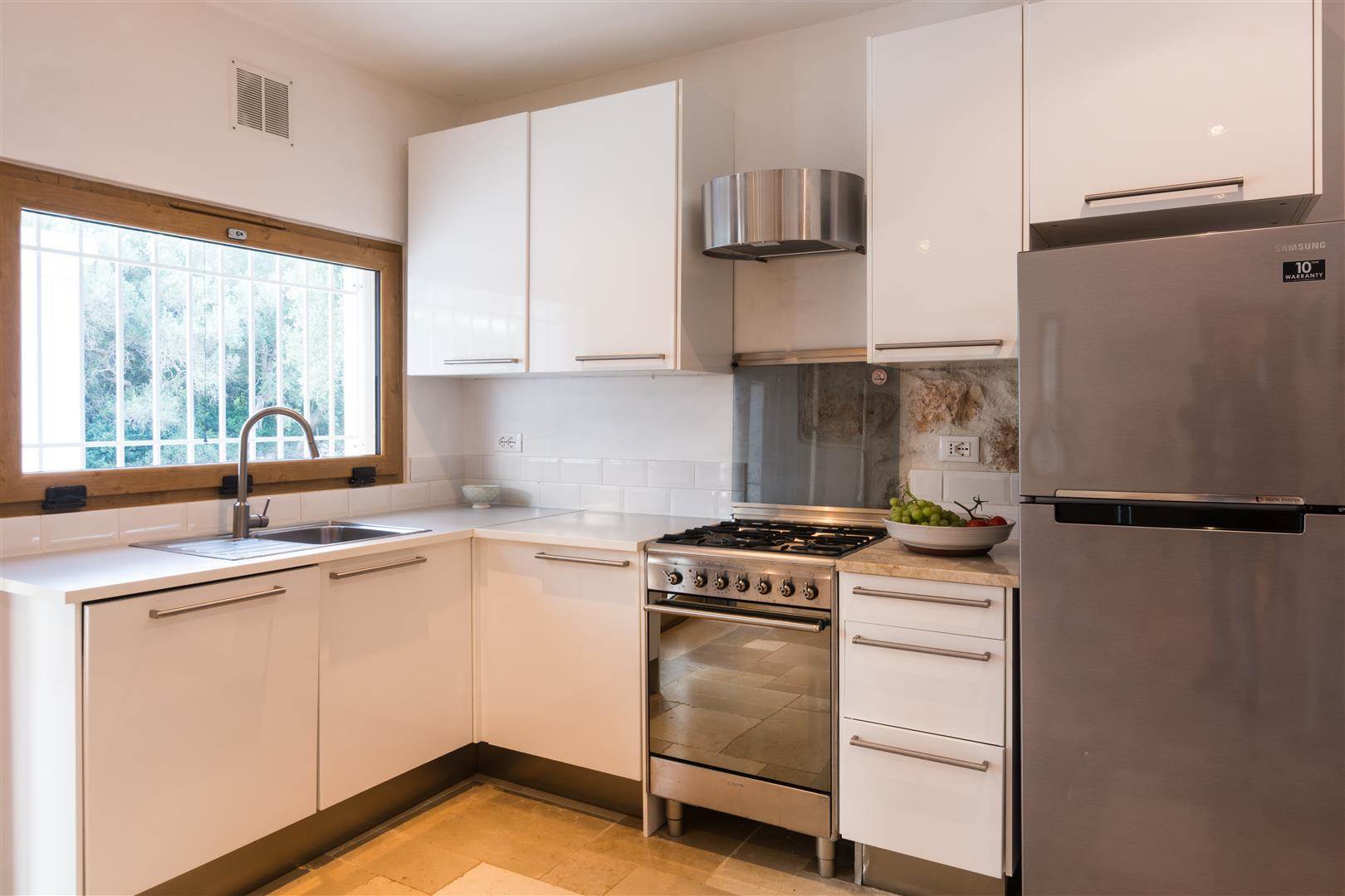 The pool has a shallow end, which is ideal for children, and slopes away to a depth of 1.2m. Outside there is a covered veranda, with stone seating around a stone coffee table, also there is a marble stone table with seating for 6. Inside to the left there is a white fitted kitchen, with stainless steel sink, and dishwasher. A large fridge freezer, gas hob and electric oven.