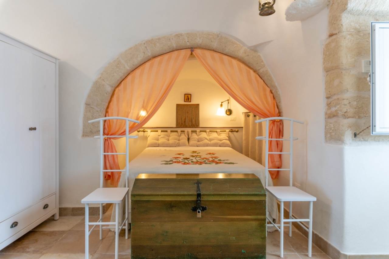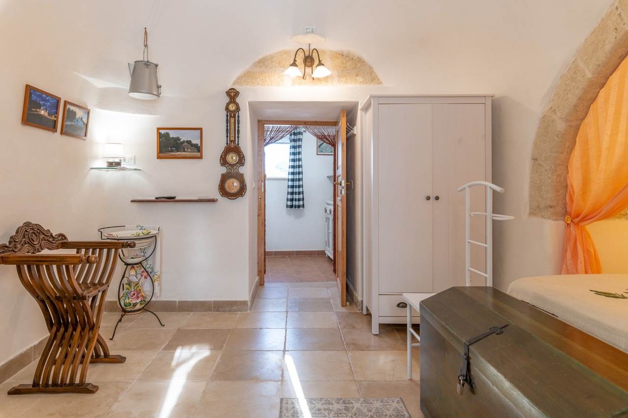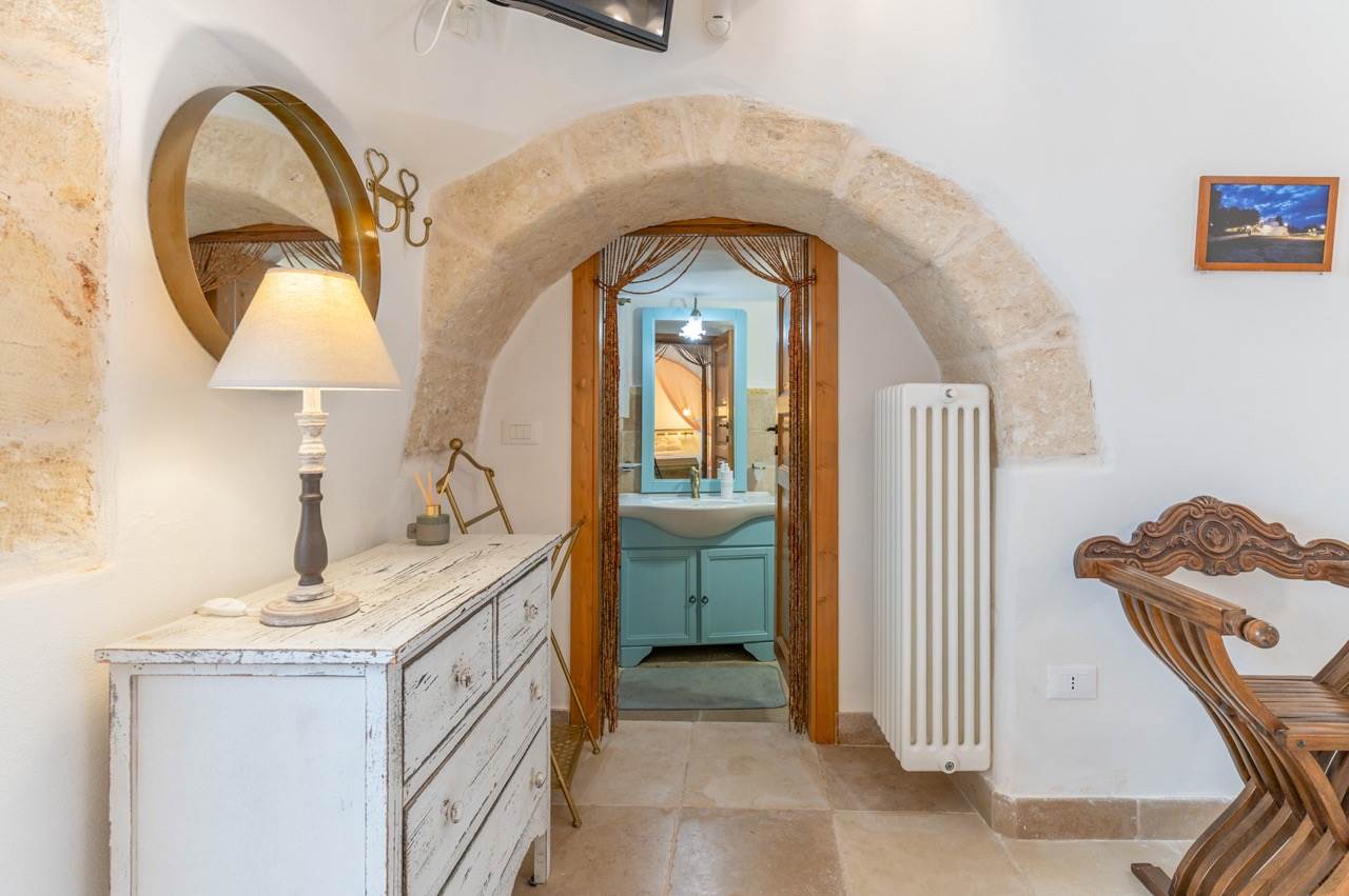 The sleeping area, obtained inside the trullo, includes two double bedrooms, each with en suite bathroom with shower.