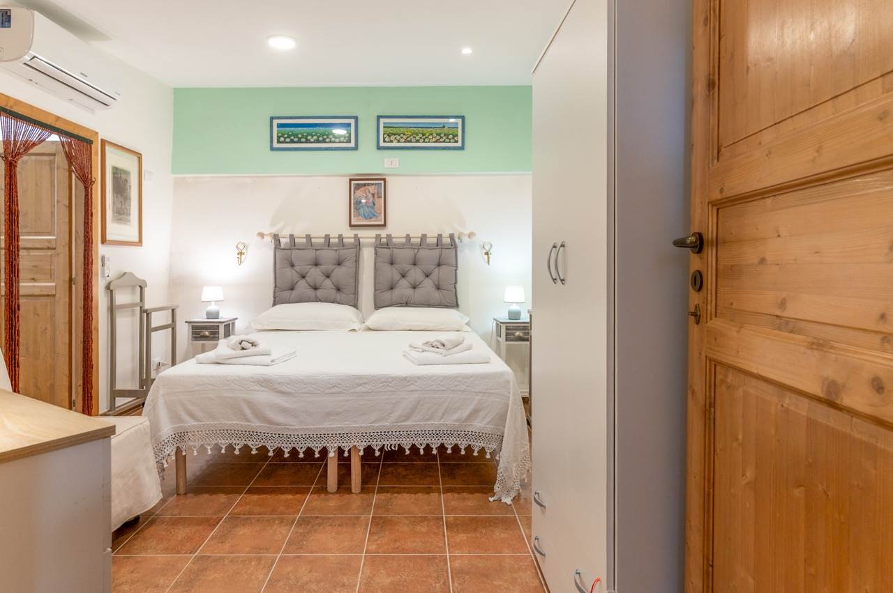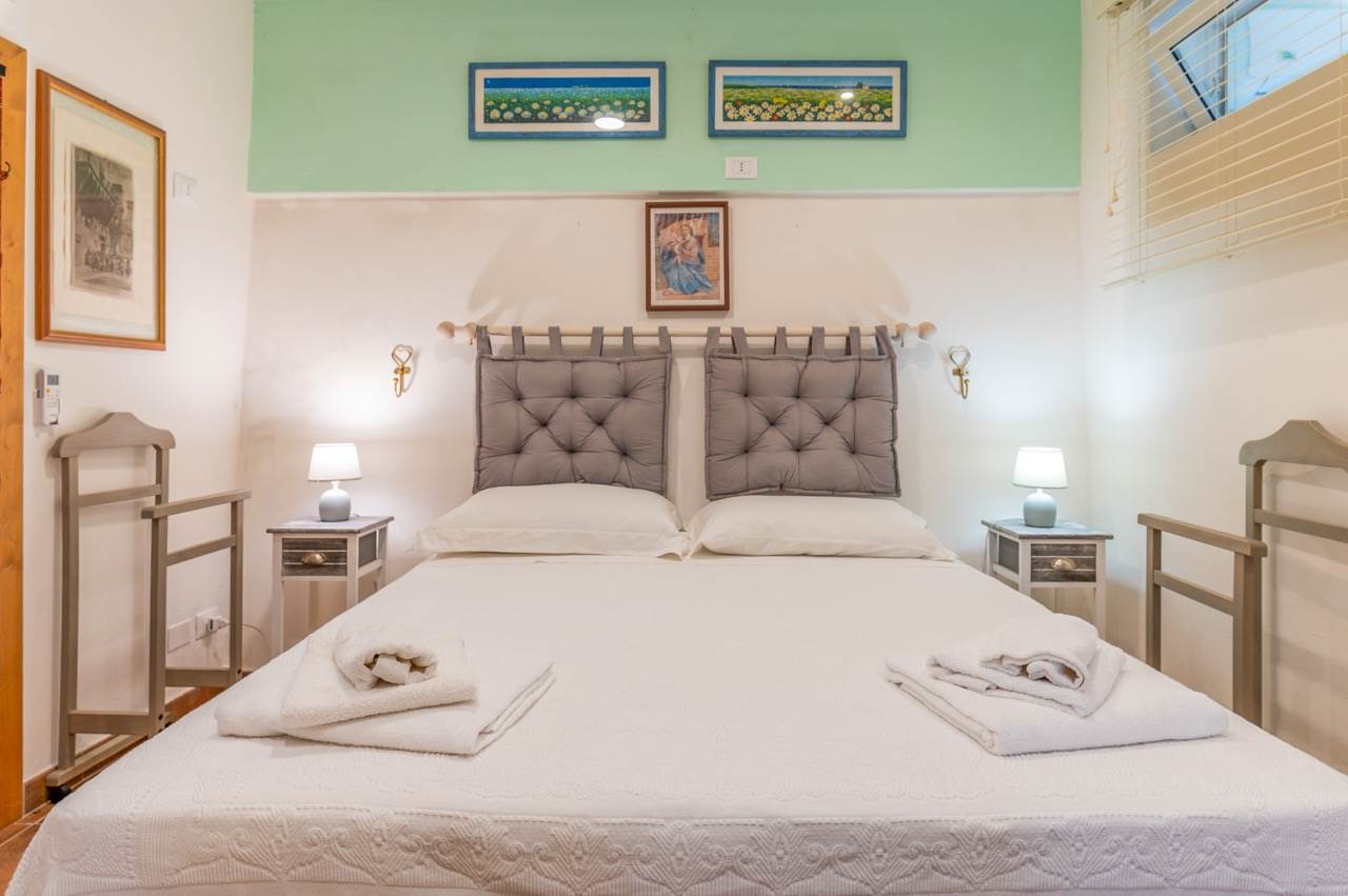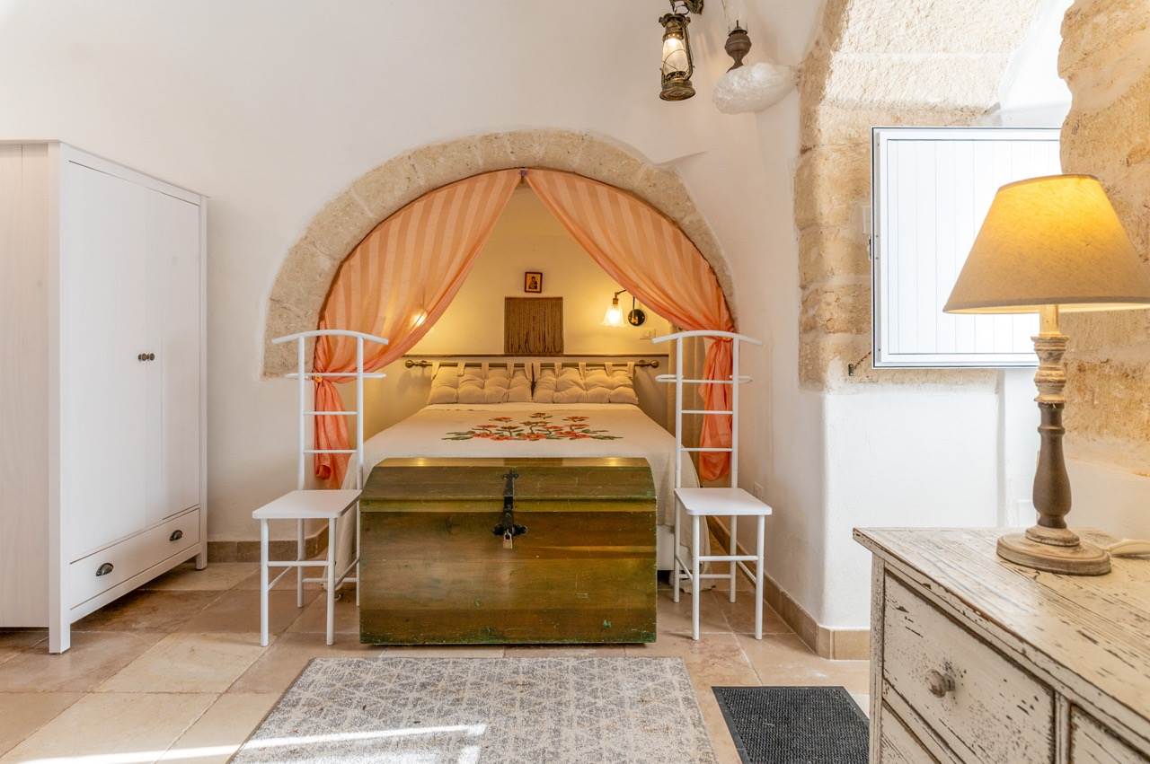 The sleeping area, obtained inside the trullo, includes two double bedrooms, each with en suite bathroom with shower.