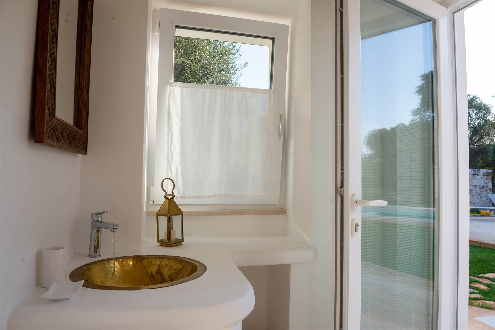 Outside, private swimming pool with solarium area, well-kept garden with Mediterranean plants, large patio for outdoor dining with built-in table and a bathroom.