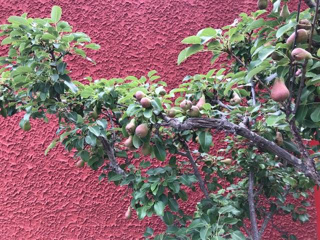 The house is accessed via a tree-lined avenue leading to the square in front of the entrance, shaded by two large pine trees.