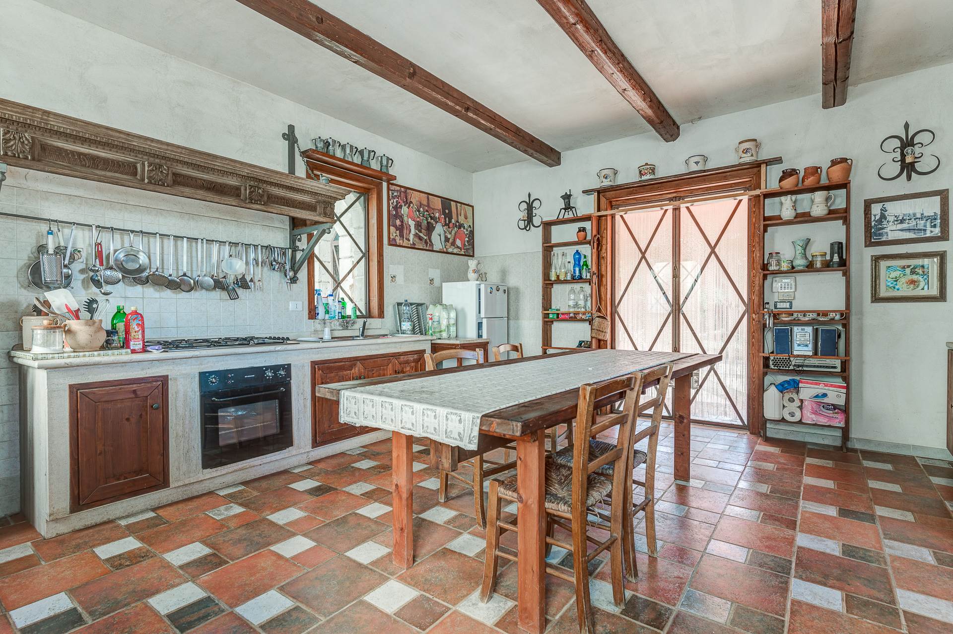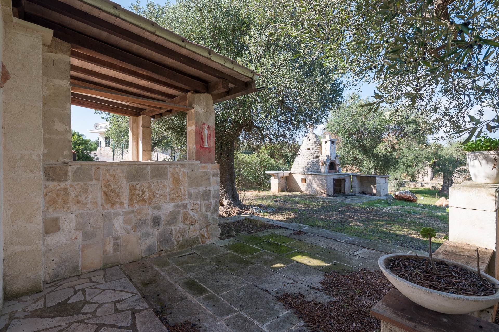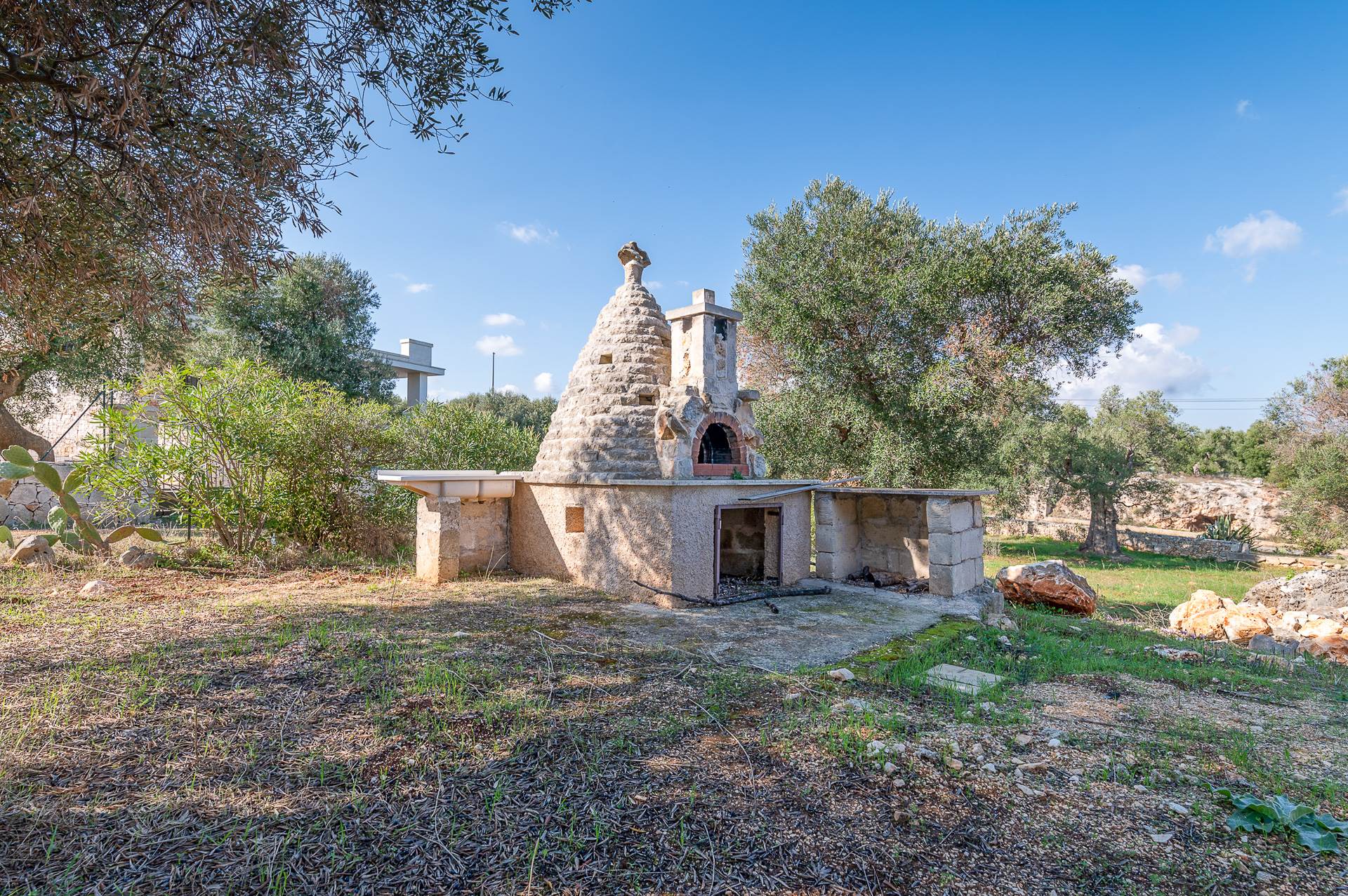 Also on the ground floor, annexed to the main body, there is the complete kitchen with outside the barbecue and the wood-burning oven that has the shapes of the characteristic Apulian Trullo.