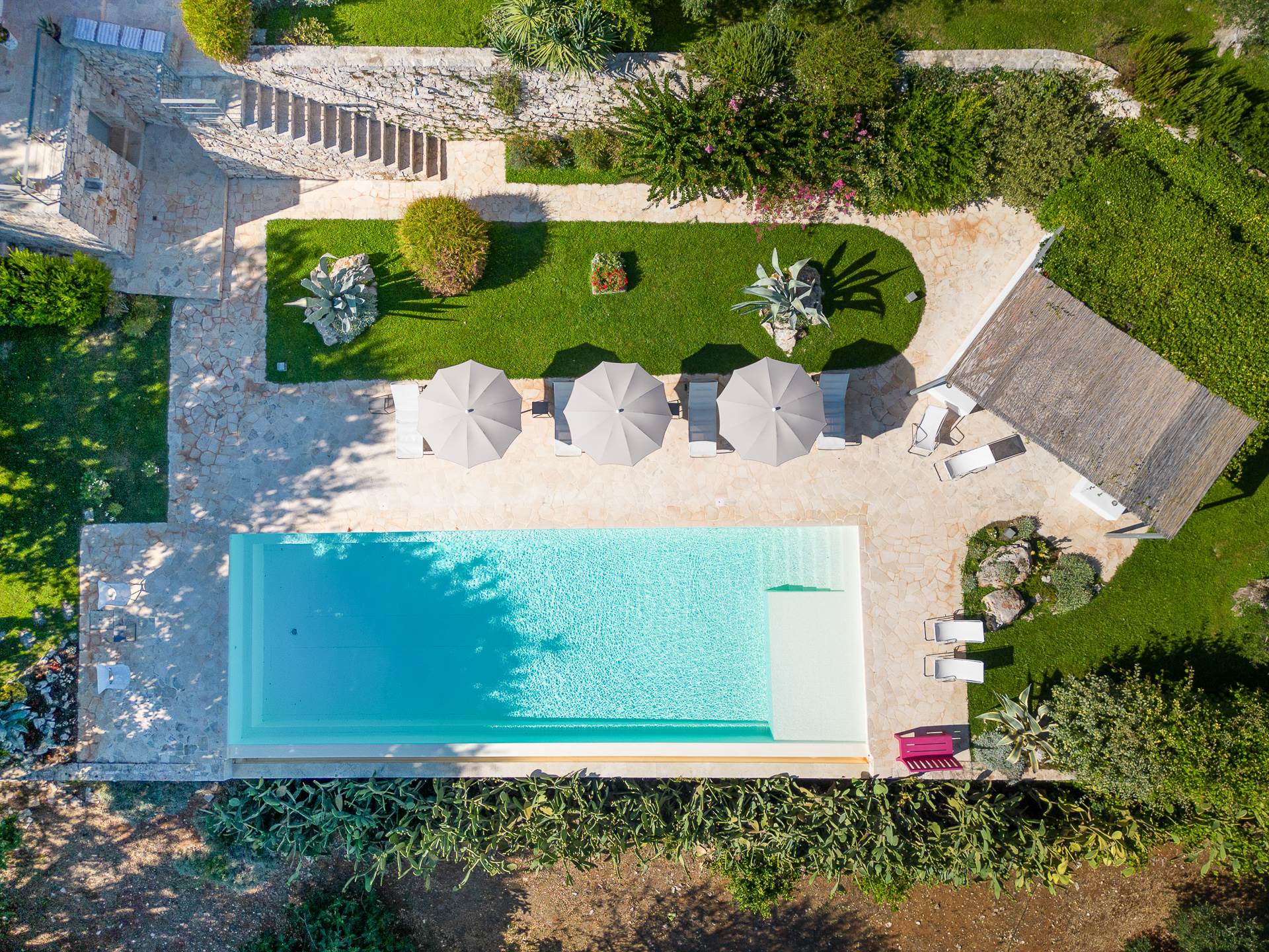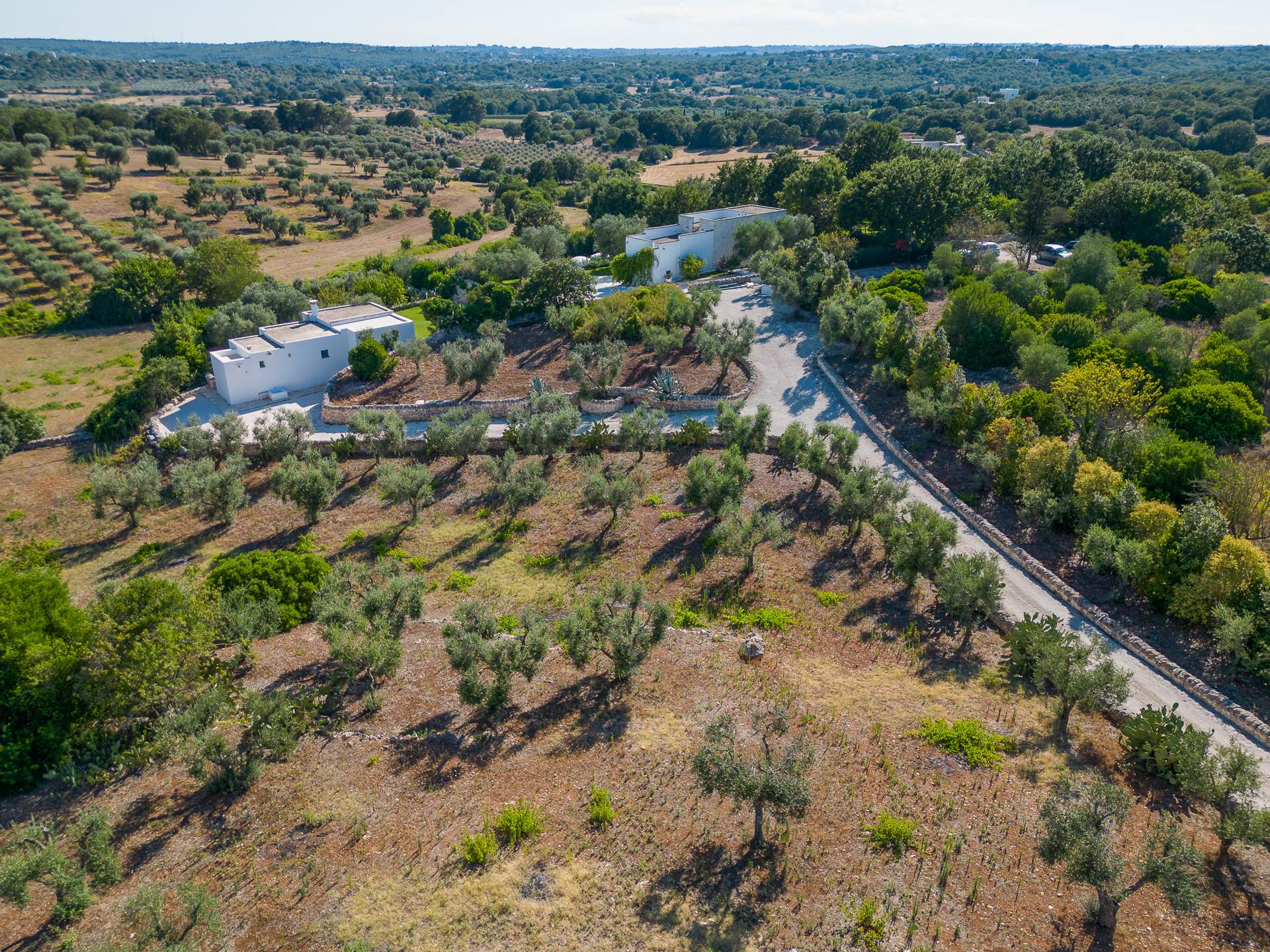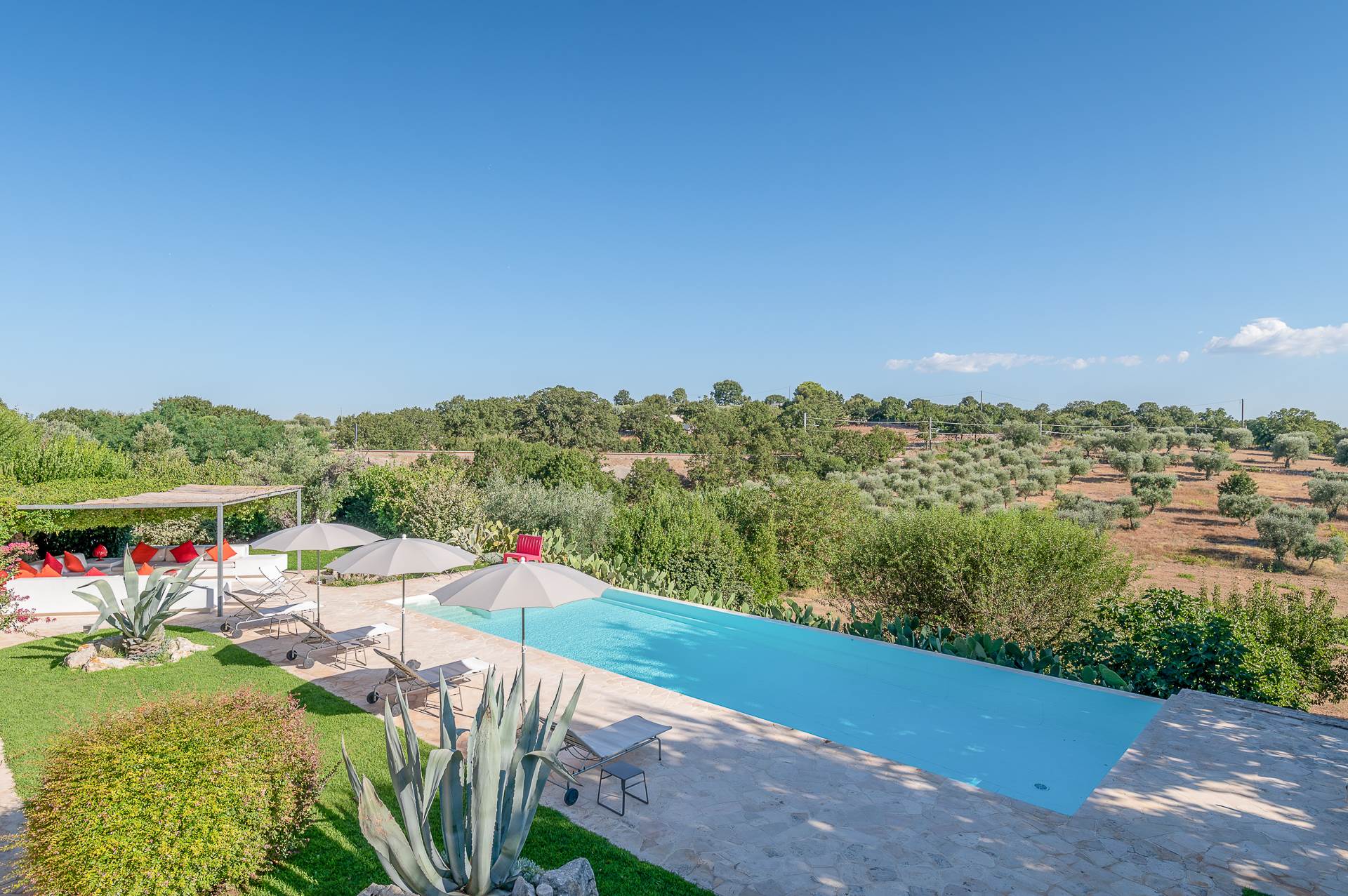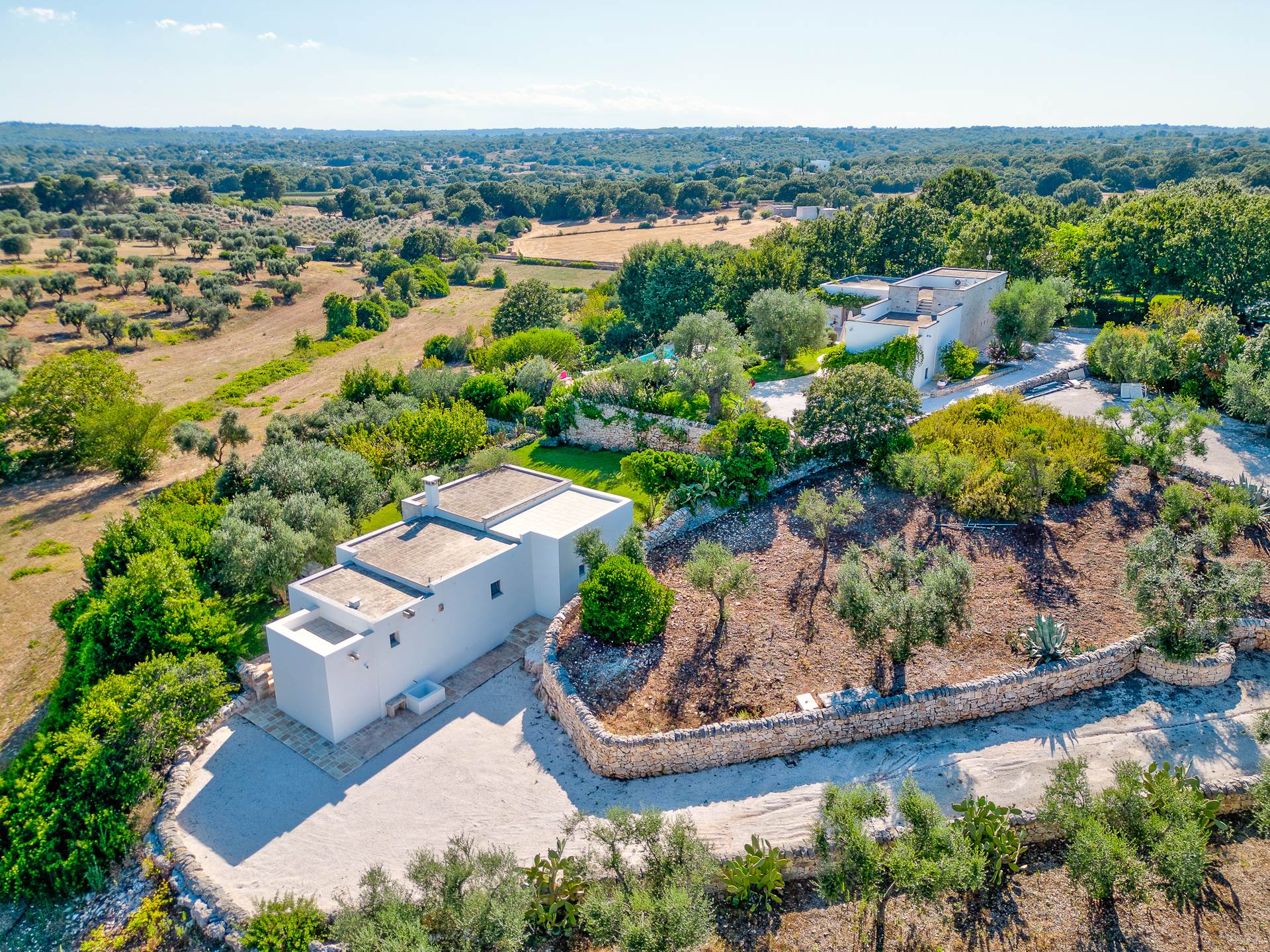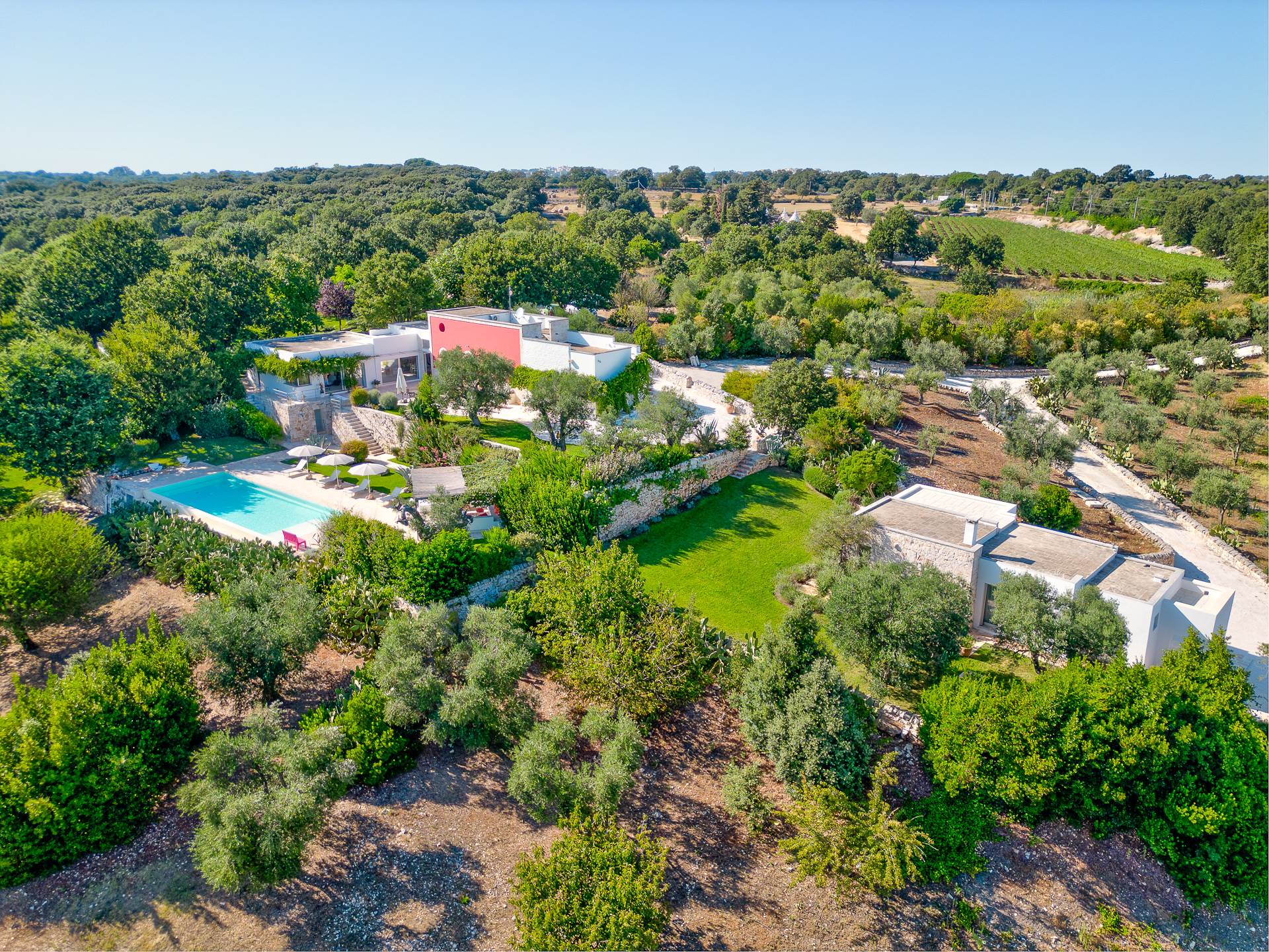 Thanks to its elevated position, Villa Casolare Antea, dominates the entire valley, offering an open and unique view over the countryside of the Itria Valley. The entire and vast property is completely fenced and is surrounded by oak and olive trees. Inside the garden, a lawn skirts the buildings and the pool.
