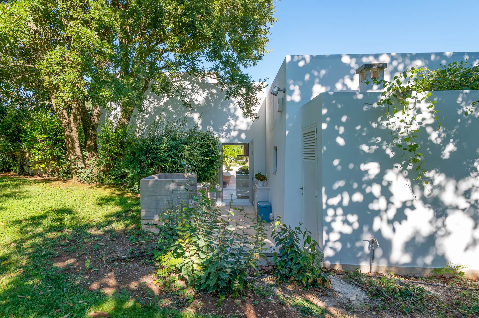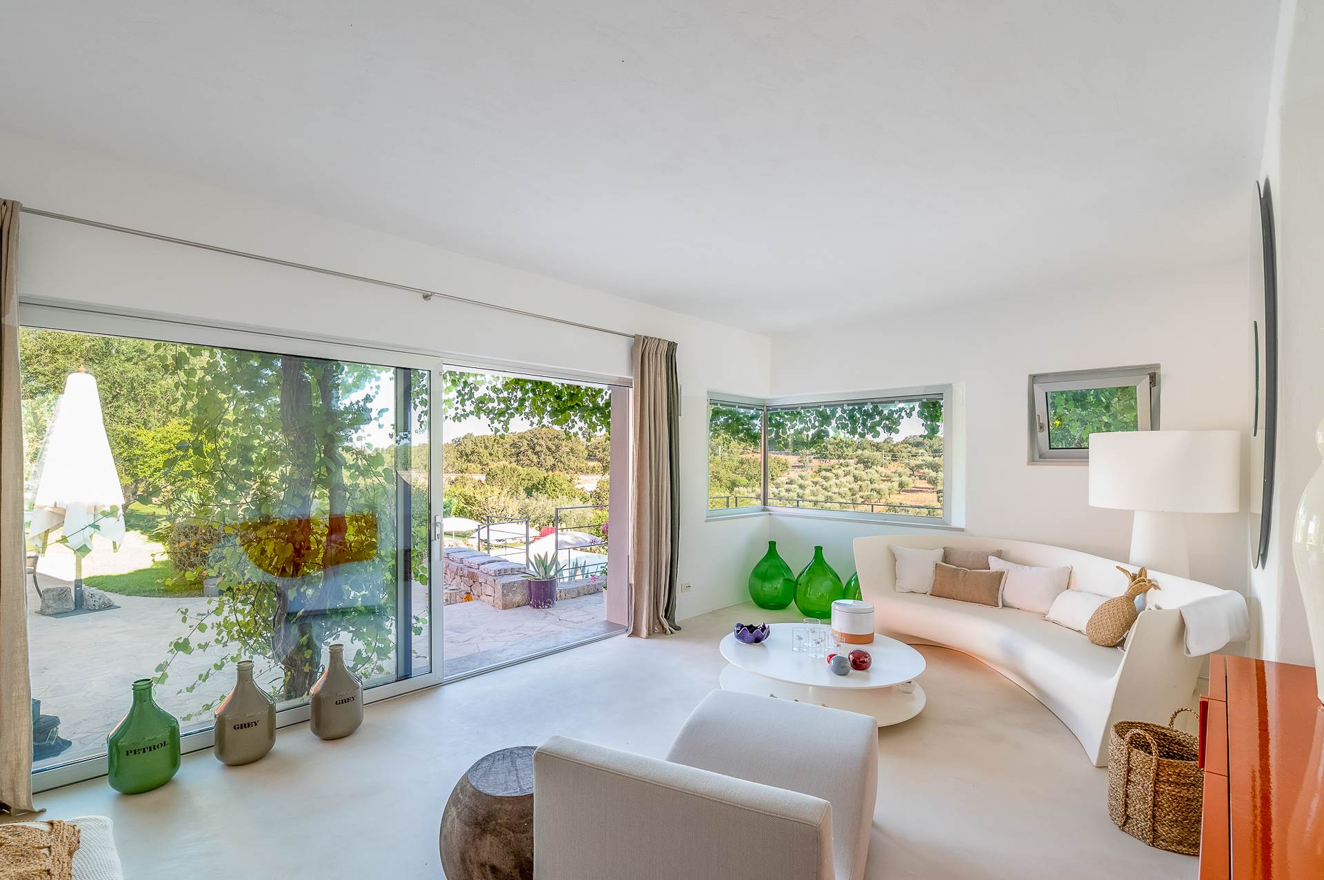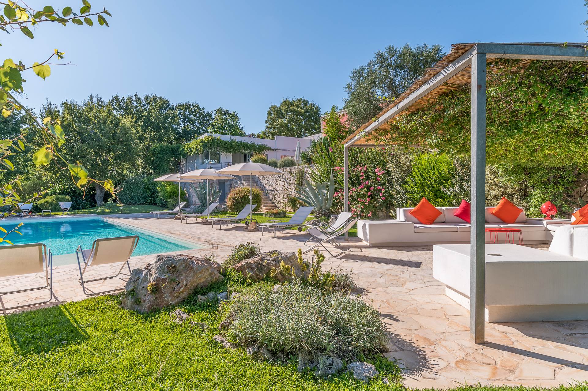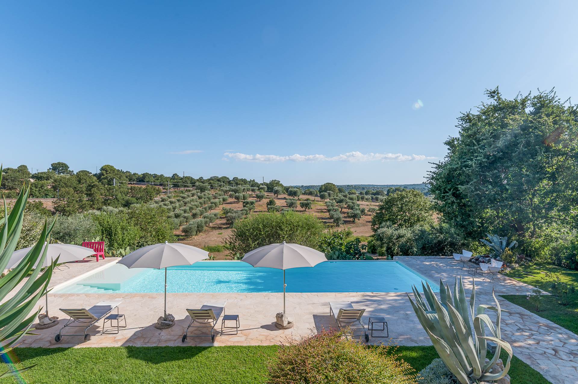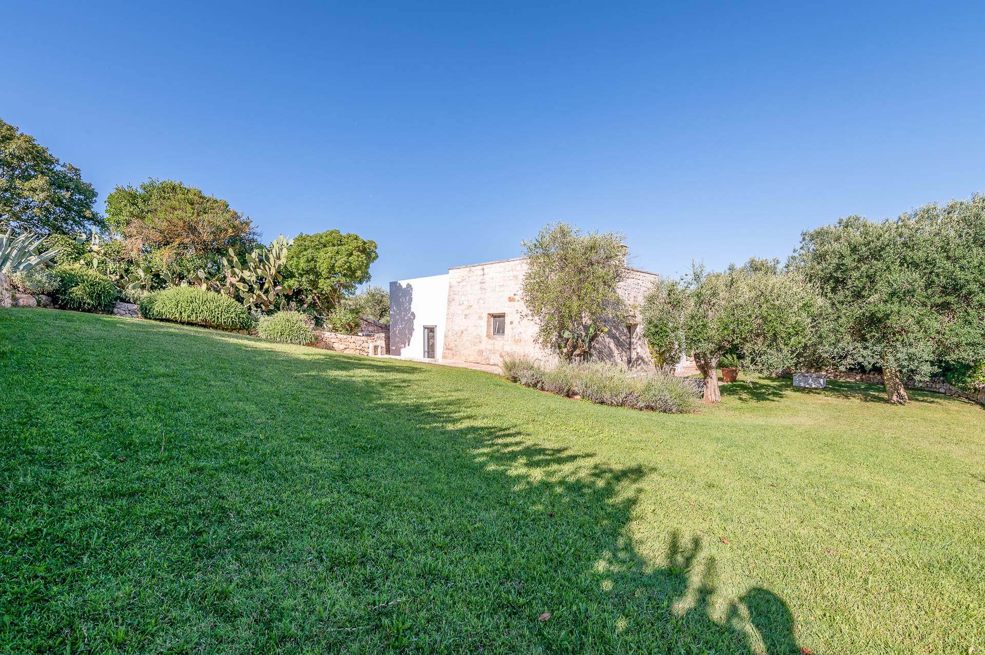 Thanks to its elevated position, Villa Casolare Antea, dominates the entire valley, offering an open and unique view over the countryside of the Itria Valley. The entire and vast property is completely fenced and is surrounded by oak and olive trees. Inside the garden, a lawn skirts the buildings and the pool.