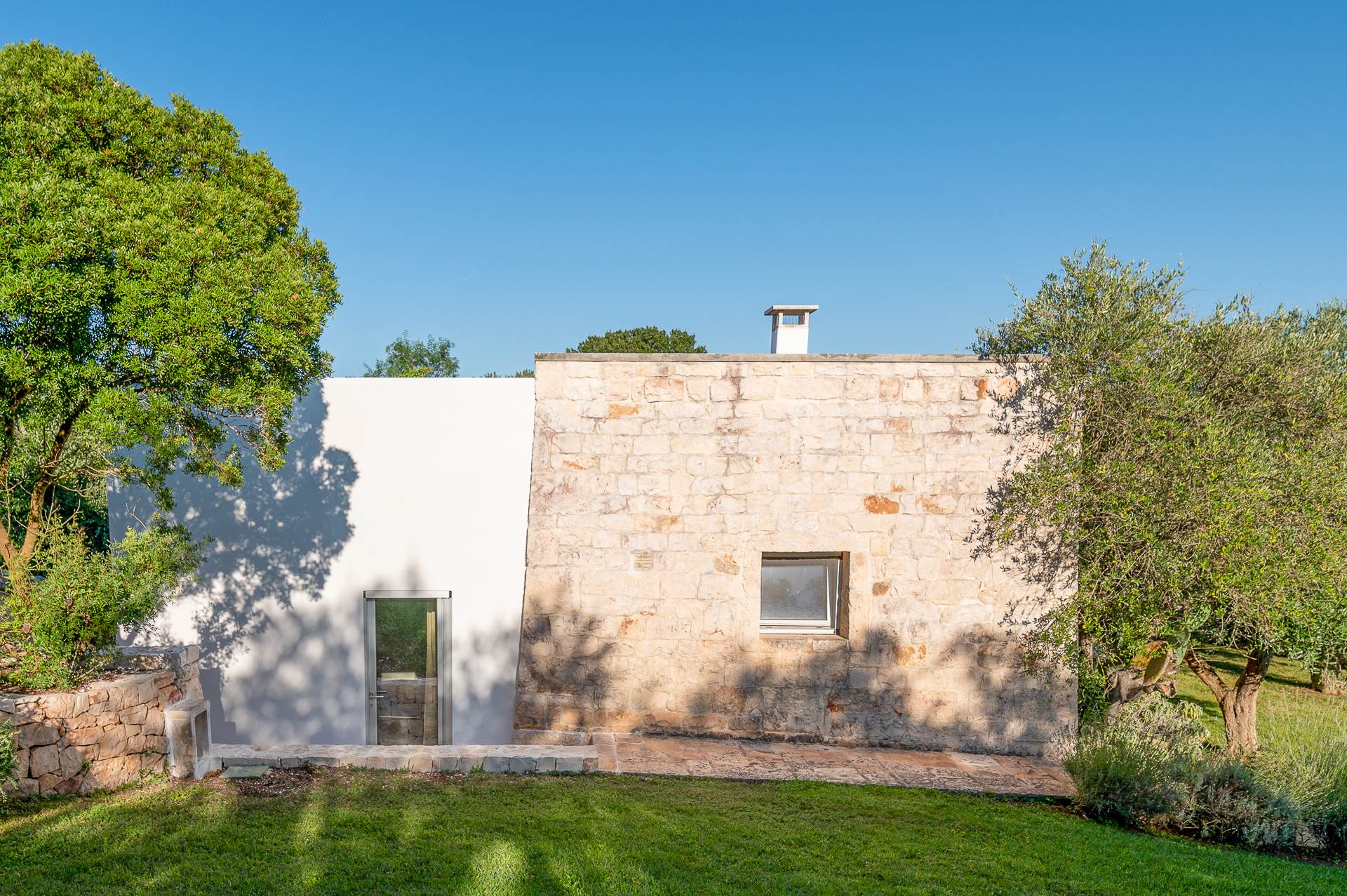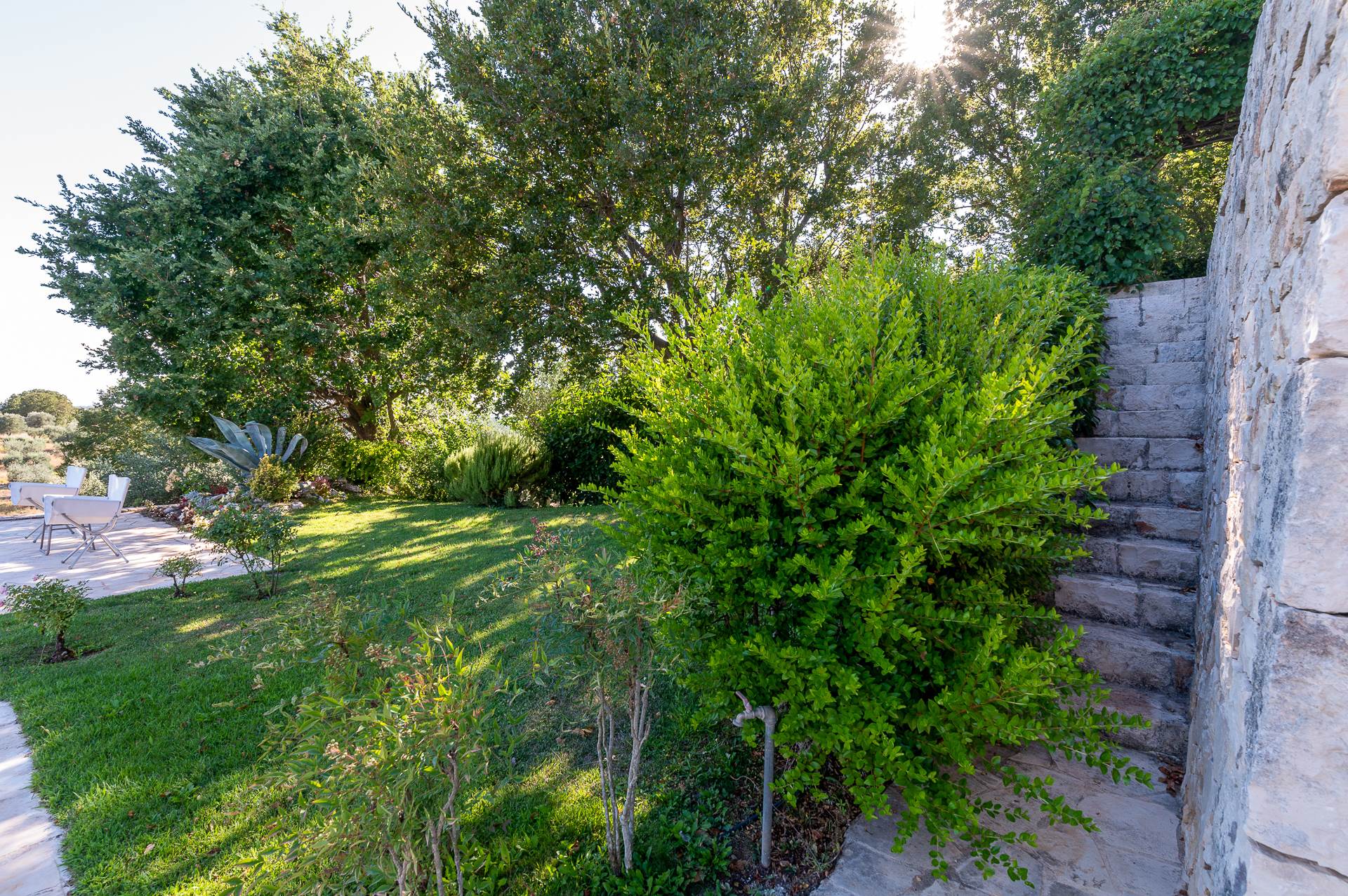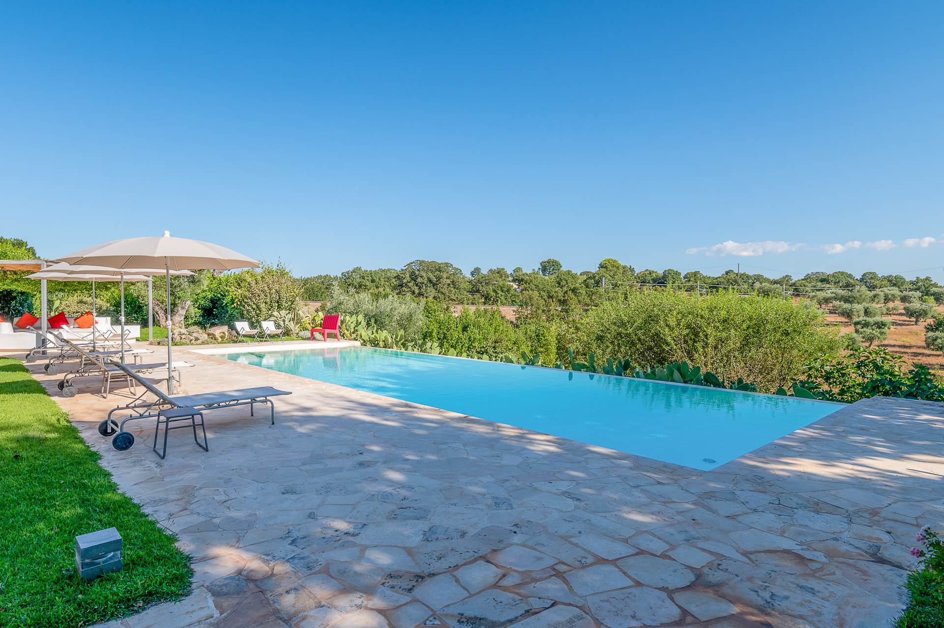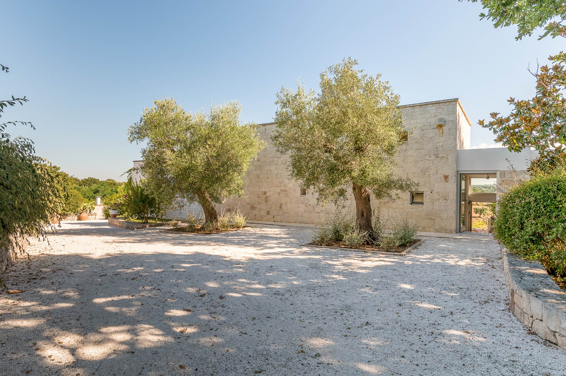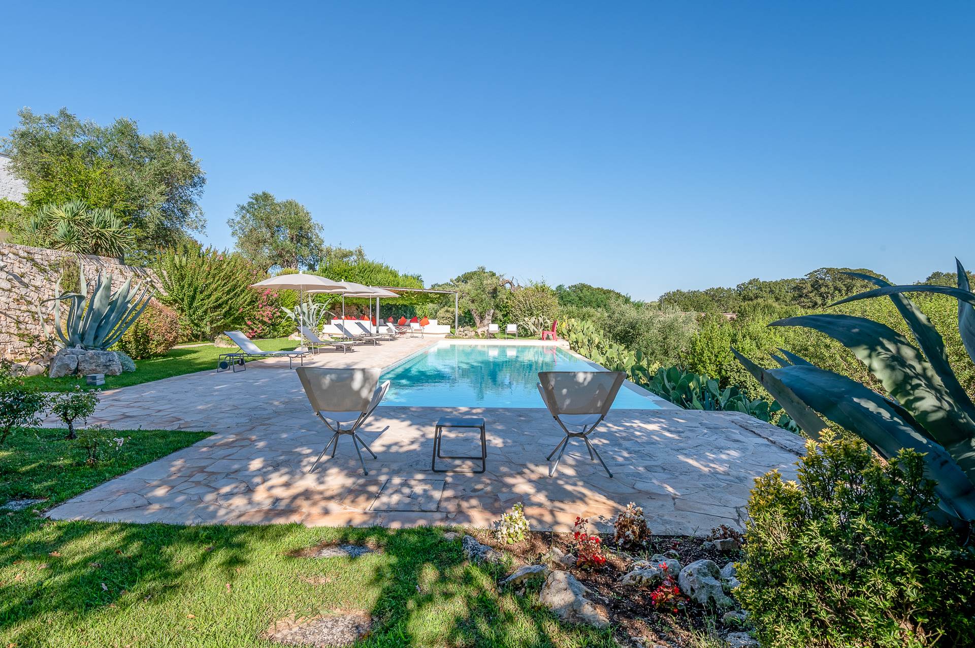 Thanks to its elevated position, Villa Casolare Antea, dominates the entire valley, offering an open and unique view over the countryside of the Itria Valley. The entire and vast property is completely fenced and is surrounded by oak and olive trees. Inside the garden, a lawn skirts the buildings and the pool.