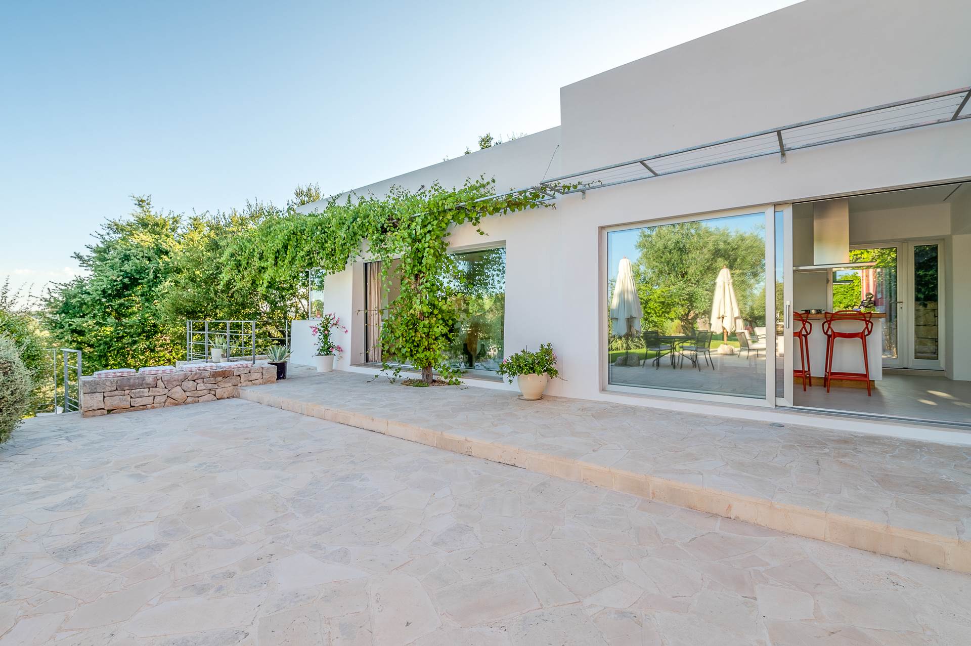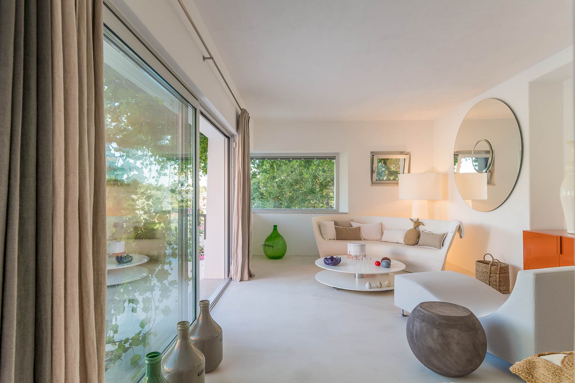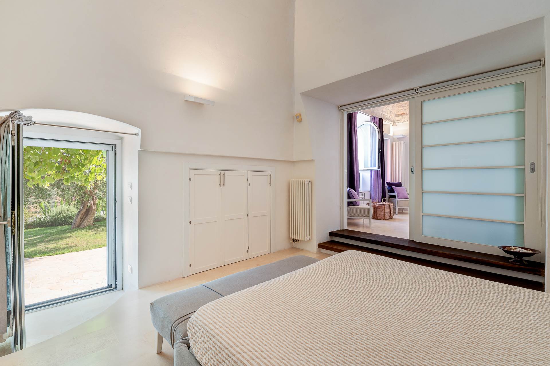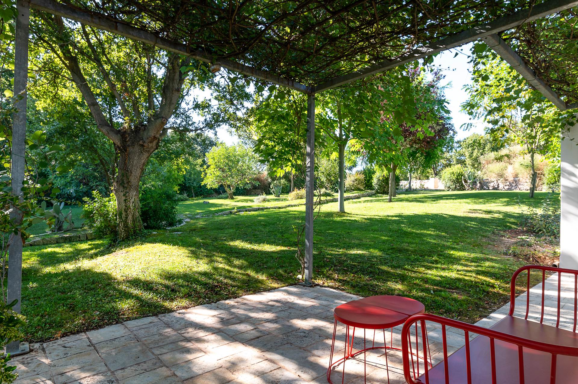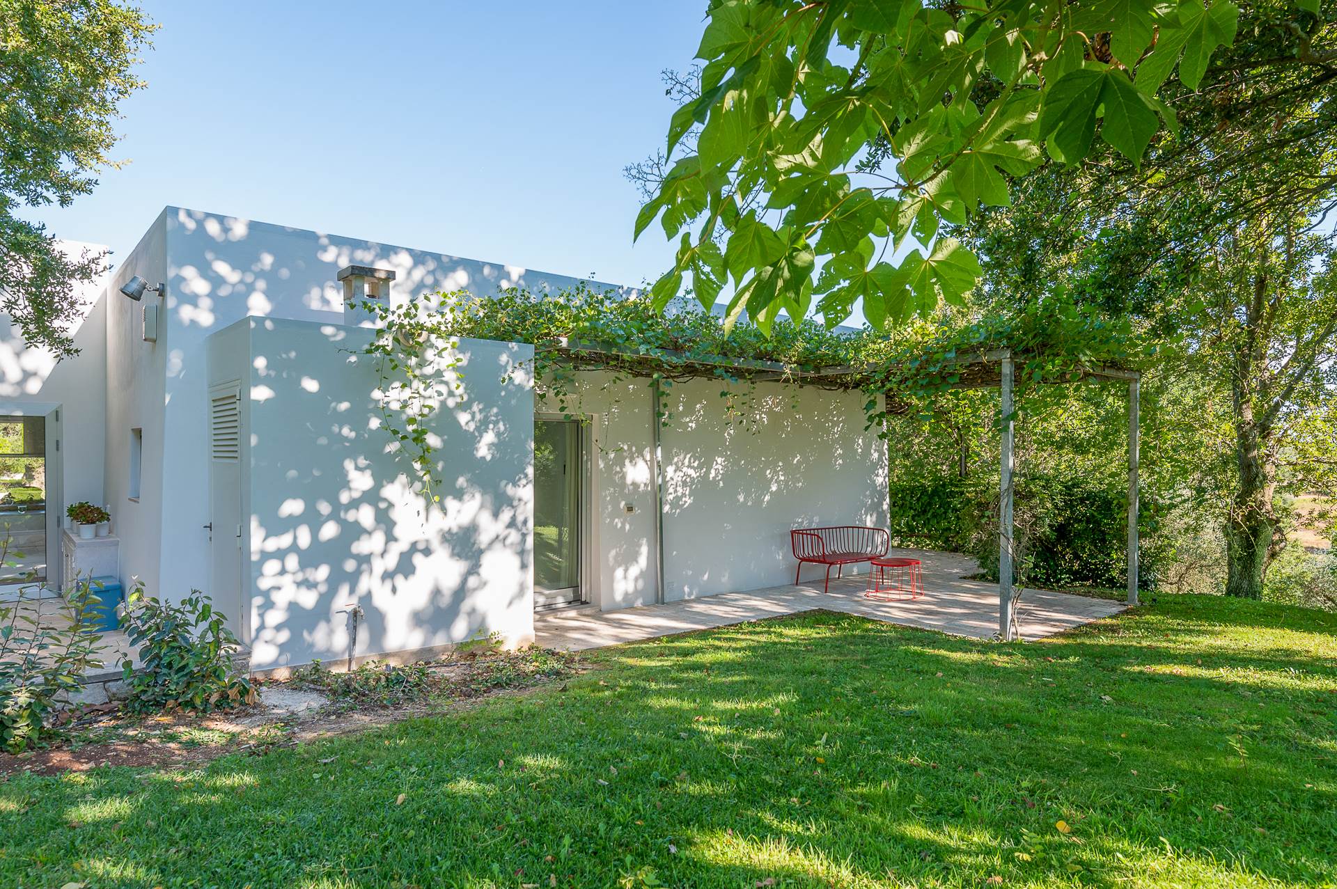 Thanks to its elevated position, Villa Casolare Antea, dominates the entire valley, offering an open and unique view over the countryside of the Itria Valley. The entire and vast property is completely fenced and is surrounded by oak and olive trees. Inside the garden, a lawn skirts the buildings and the pool.