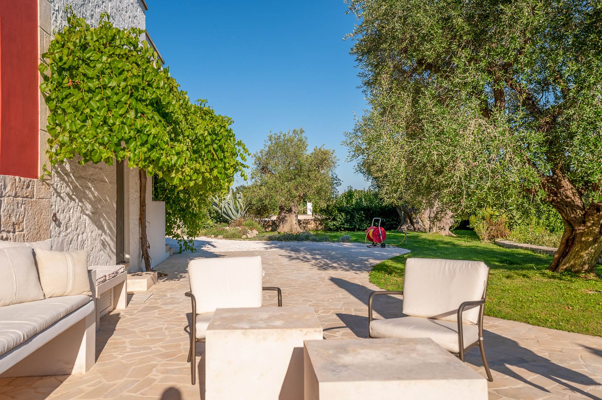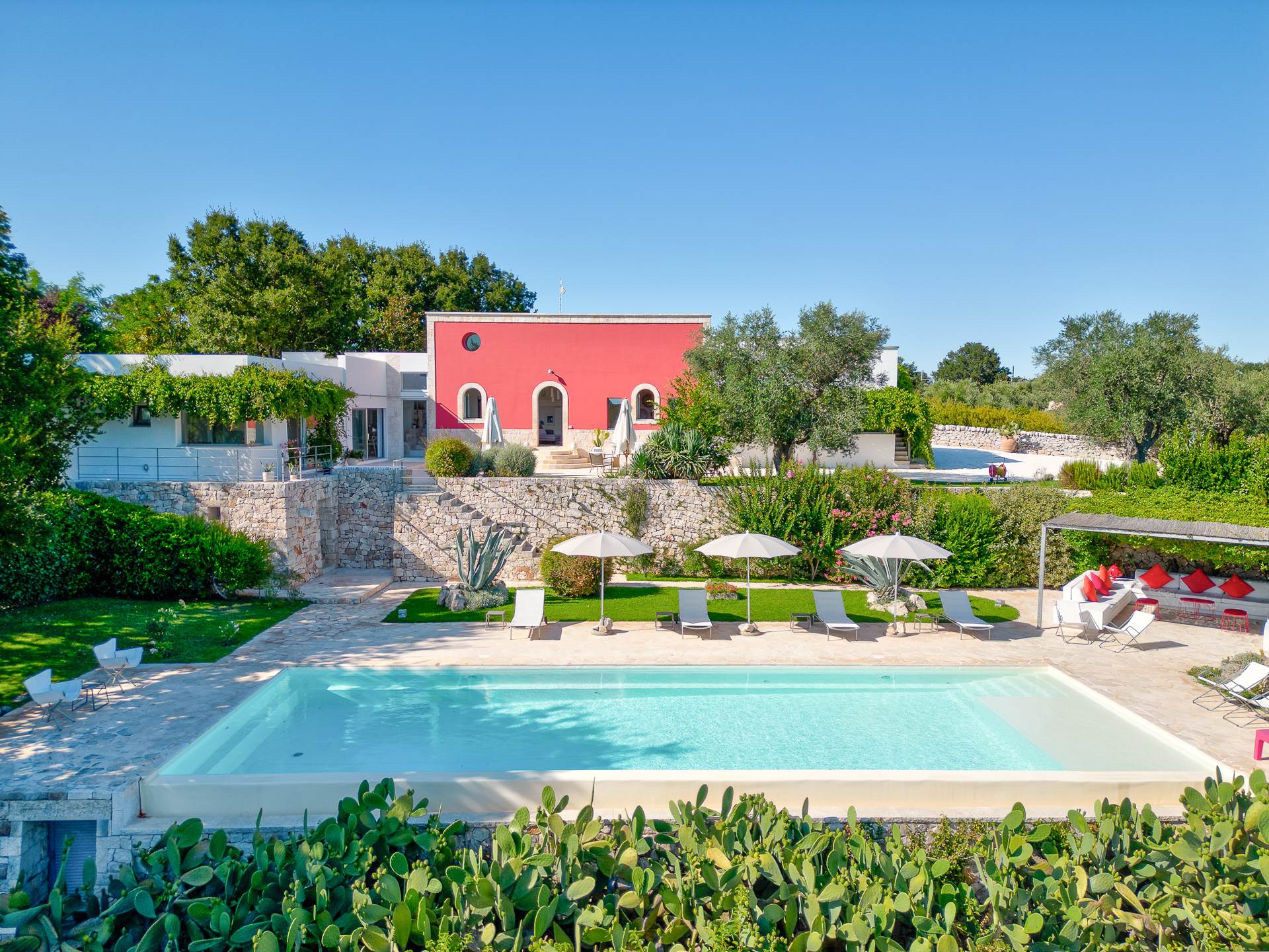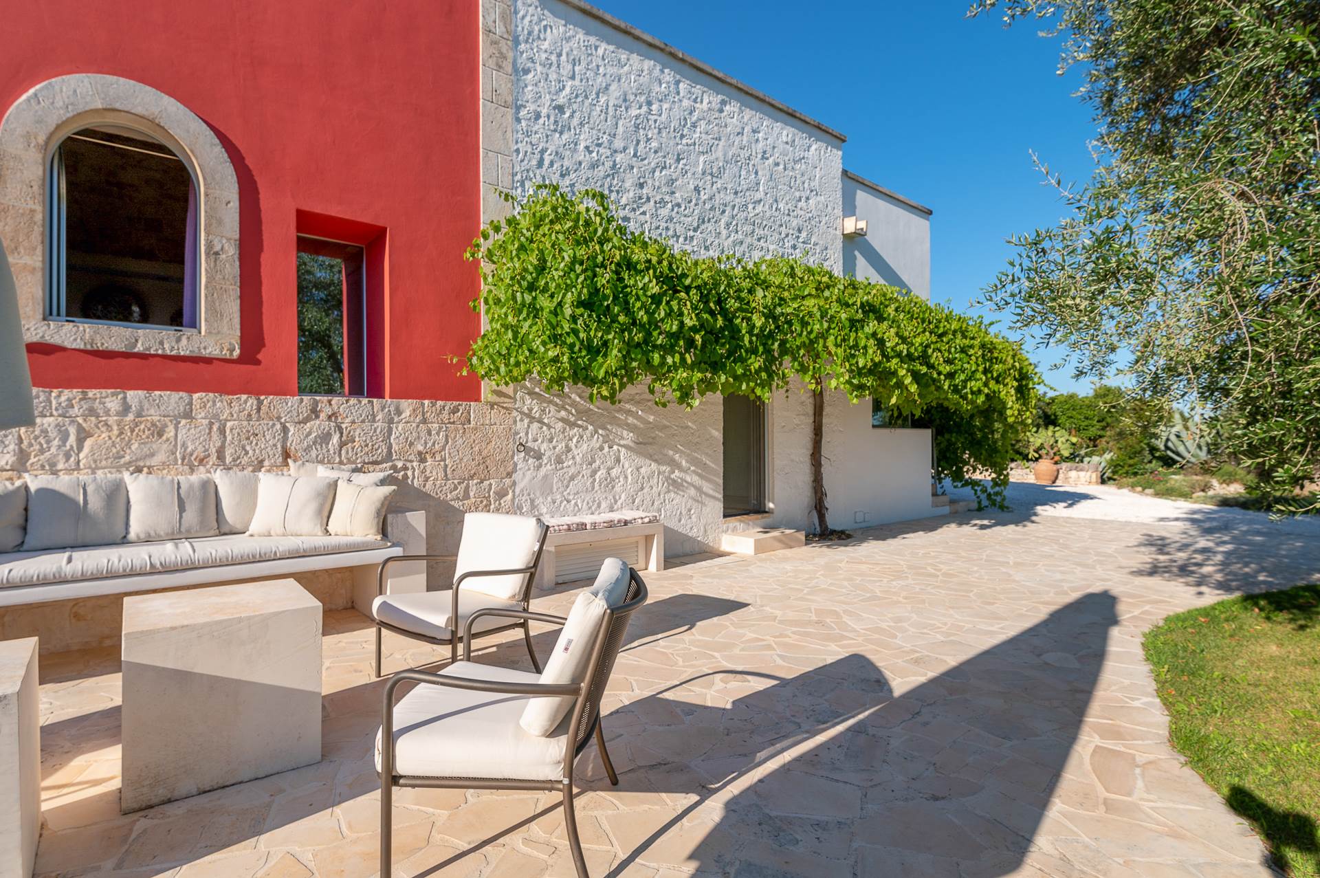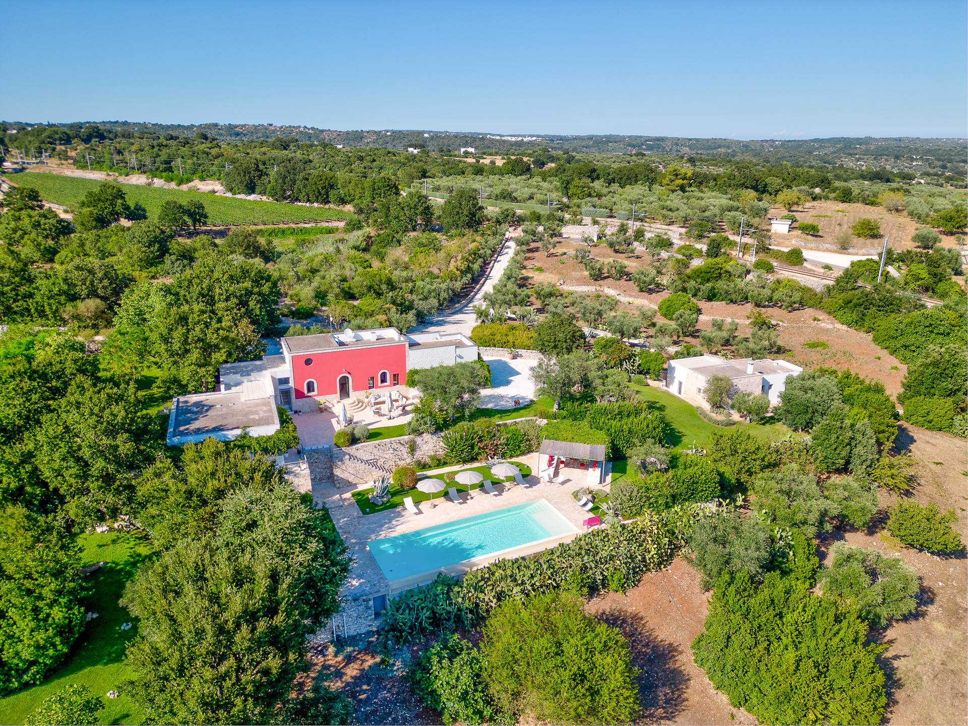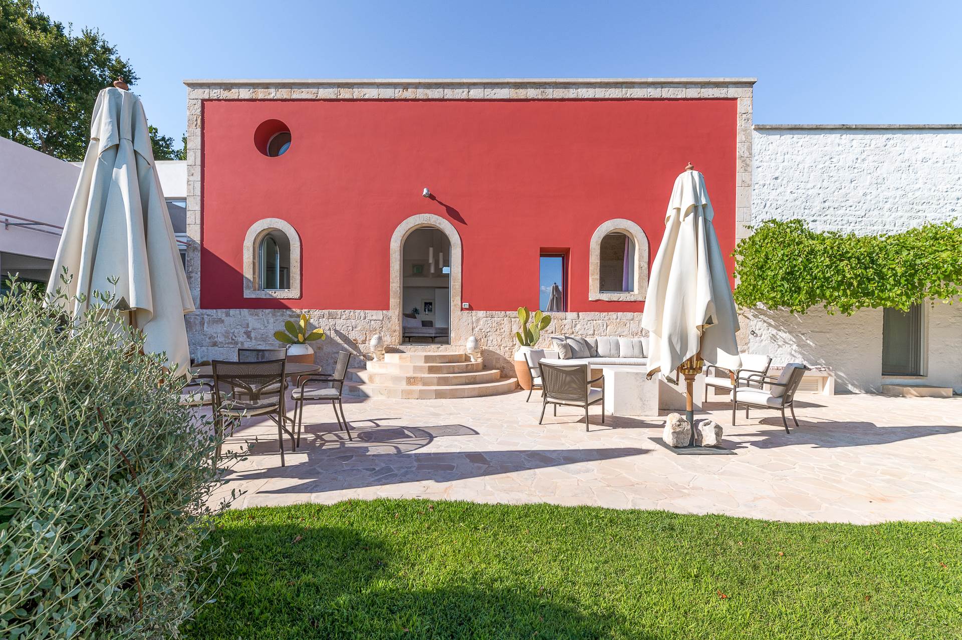 The architecture of the property and the panoramic views from it are of rare beauty, rich in the typical colors of Puglia: the blue of the sky, the intense red of the earth, the dark green of the olive trees, the dazzling white of the lime.