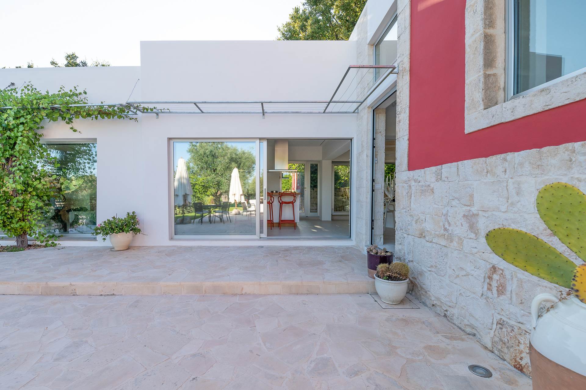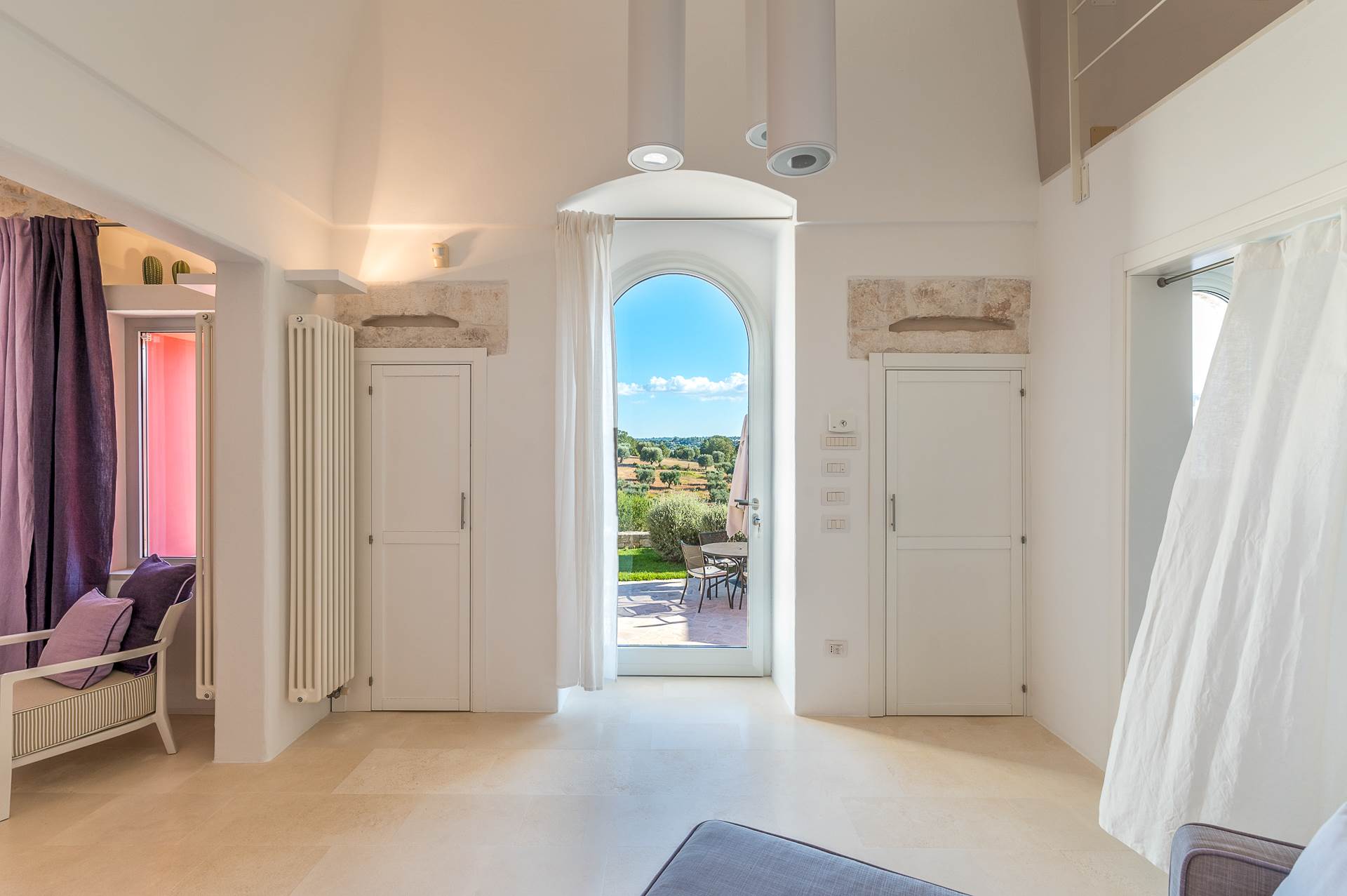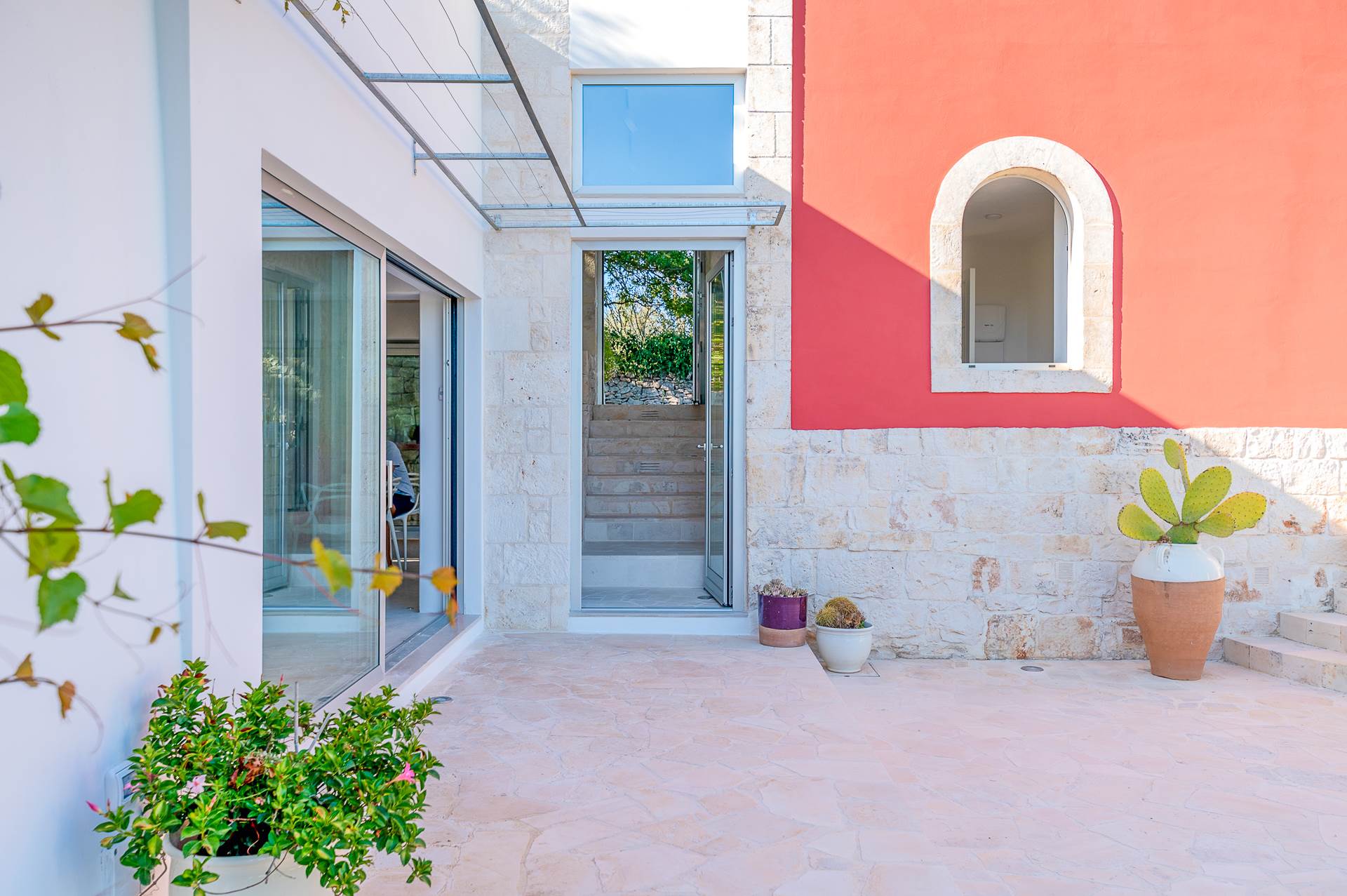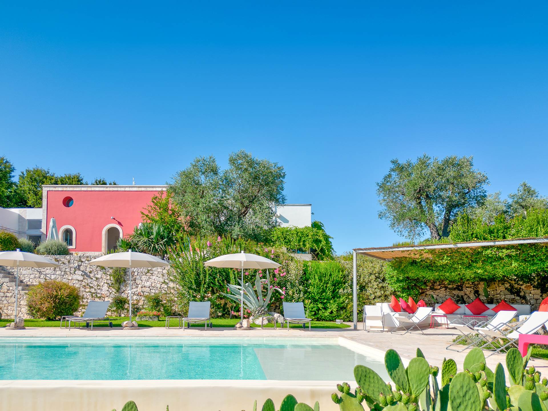The architecture of the property and the panoramic views from it are of rare beauty, rich in the typical colors of Puglia: the blue of the sky, the intense red of the earth, the dark green of the olive trees, the dazzling white of the lime.