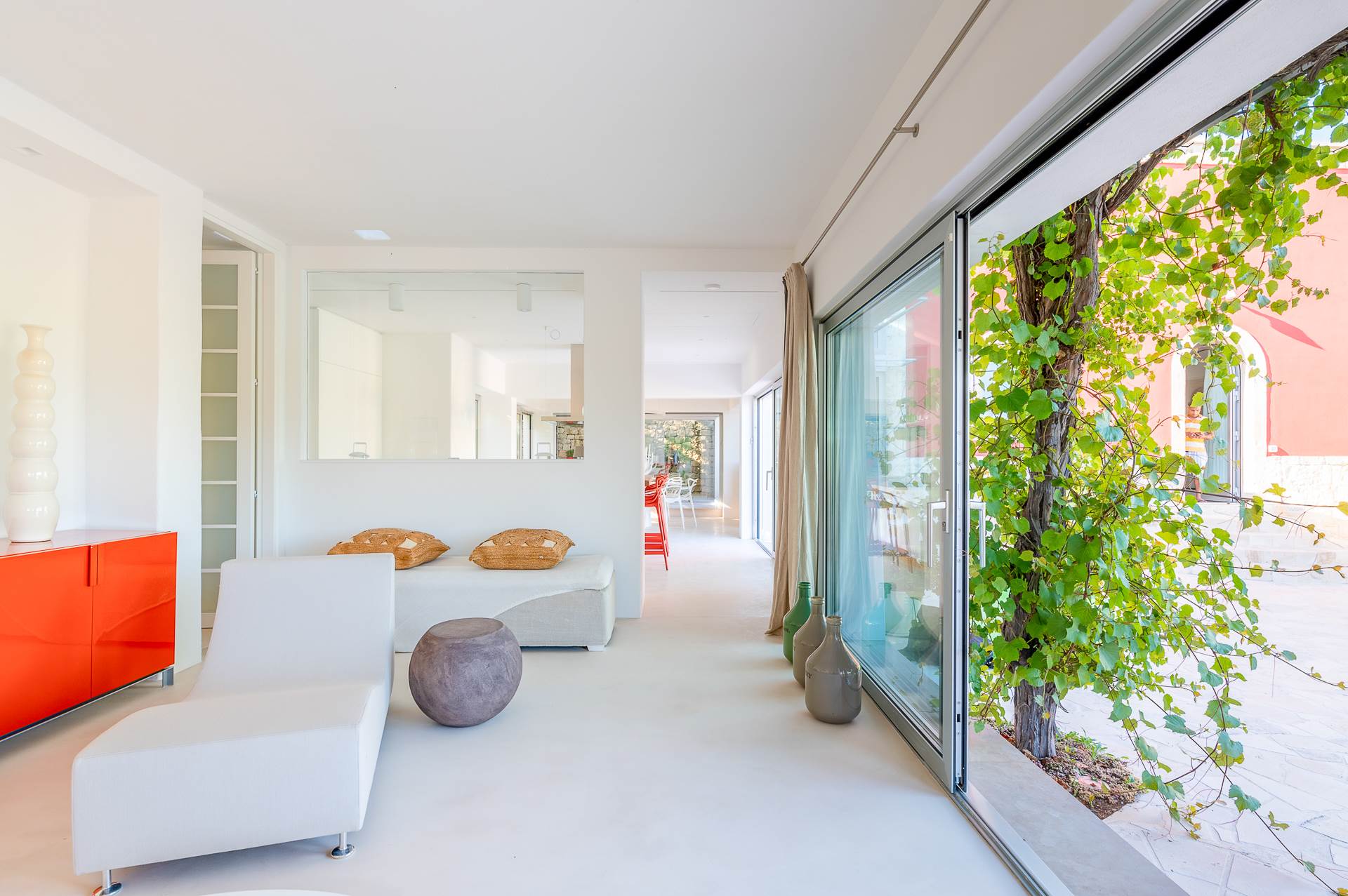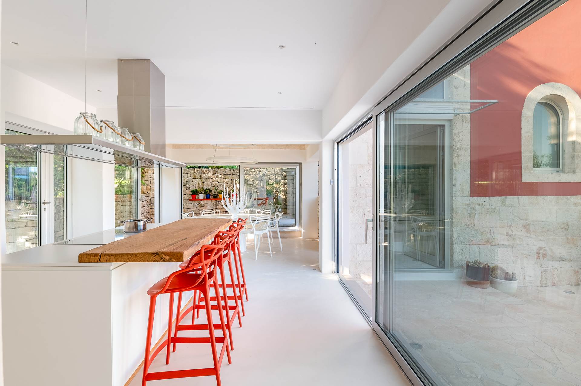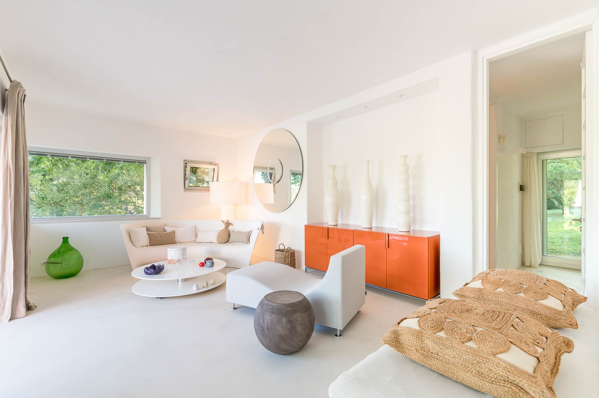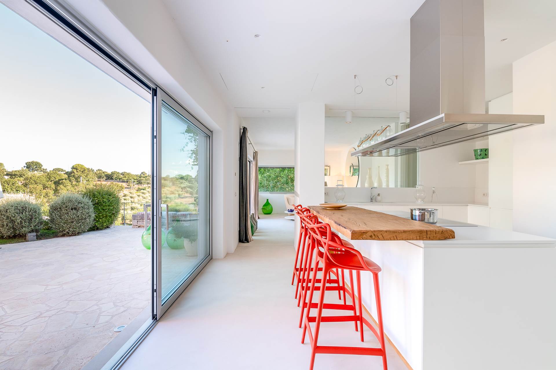 Several areas, shaded of course, are added to the outdoor veranda, equipped with dining table and seating, outdoor kitchen and barbecue.
