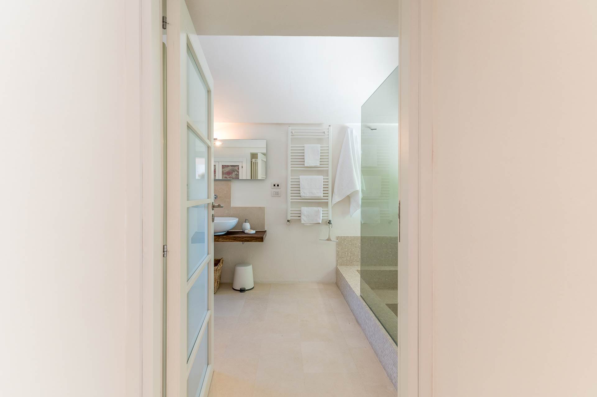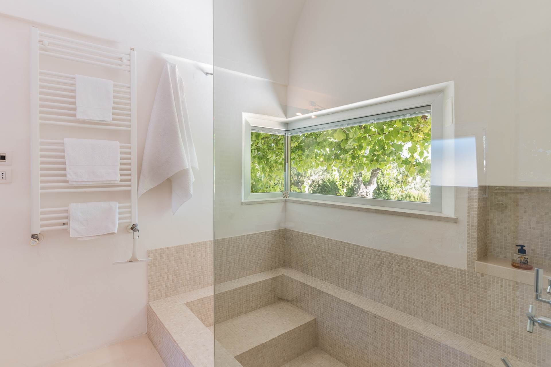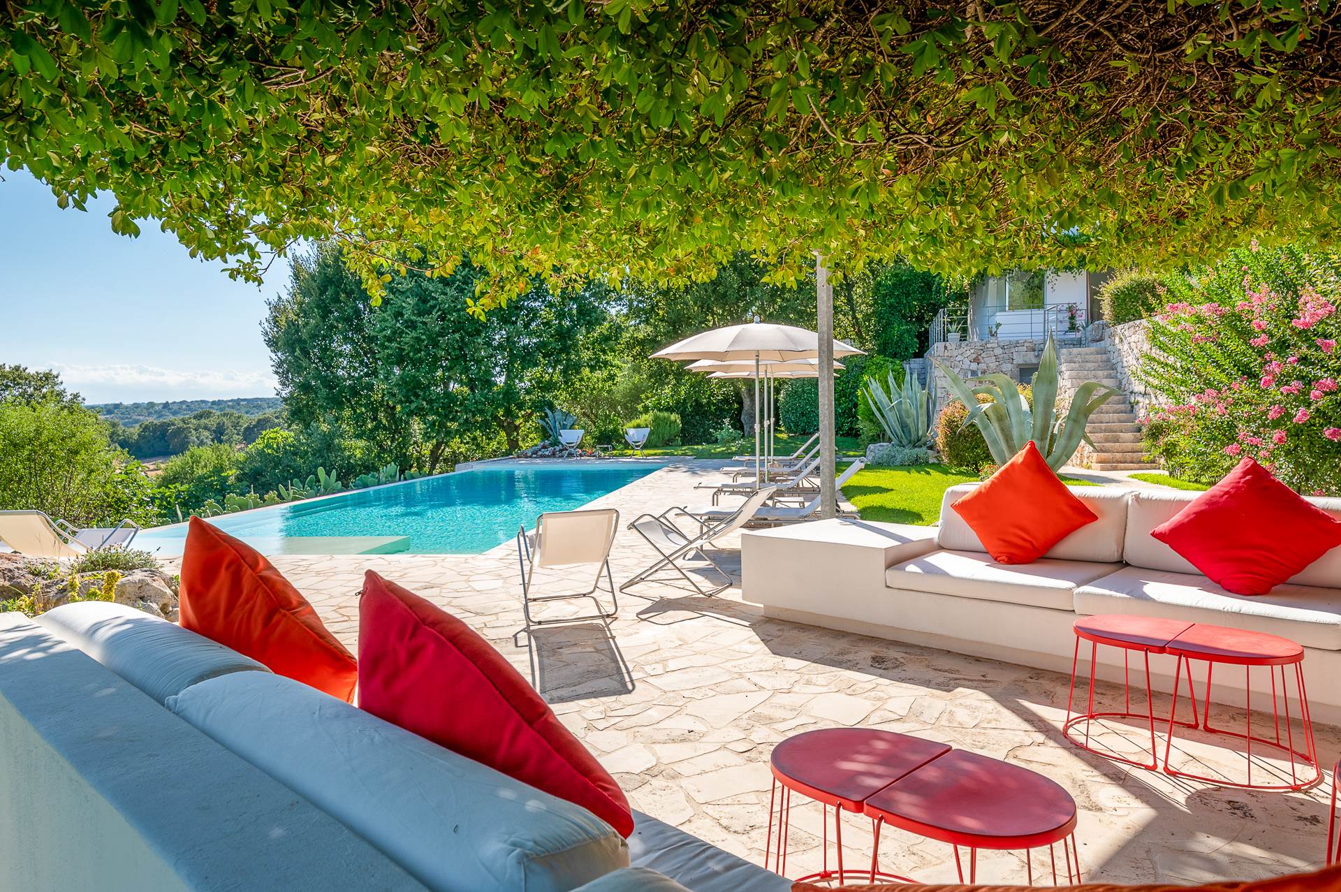 The infinity pool, located in a panoramic position, 12x6 m long, is equipped with salt sterilization system, is surrounded by local stone floors, furnished with sun loungers. The pool area is completed by a comfortable outdoor shower and a 15 sqm technical room.