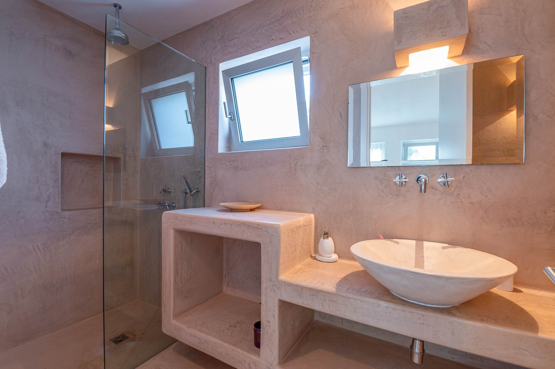 On the left side of the Villa is an additional stone building, consisting of a living area with kitchen and fireplace, two bedrooms with ensuite bathroom. Next to the building there is a single bedroom with bathroom.