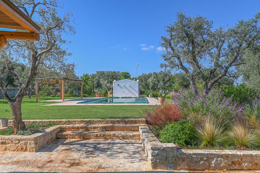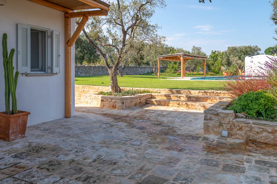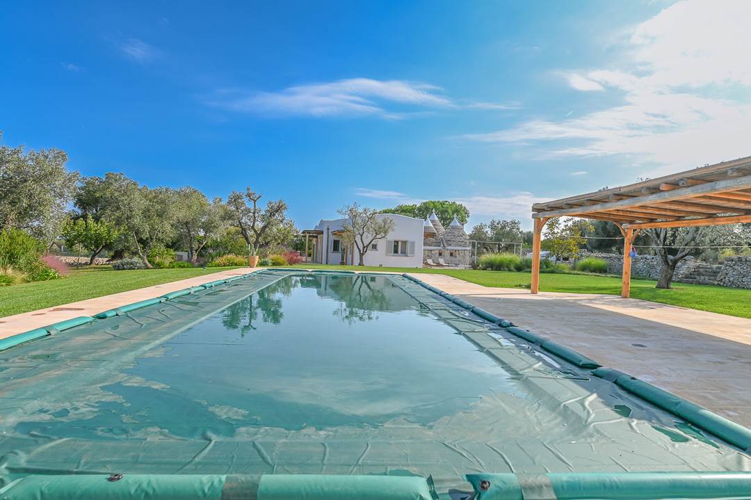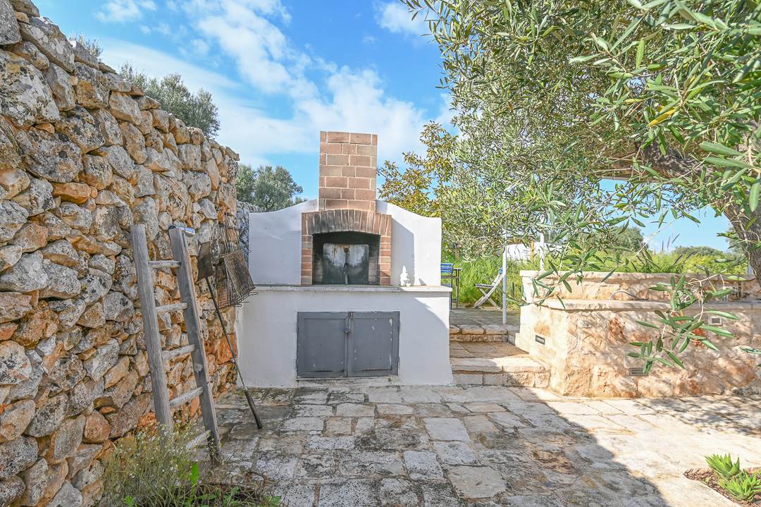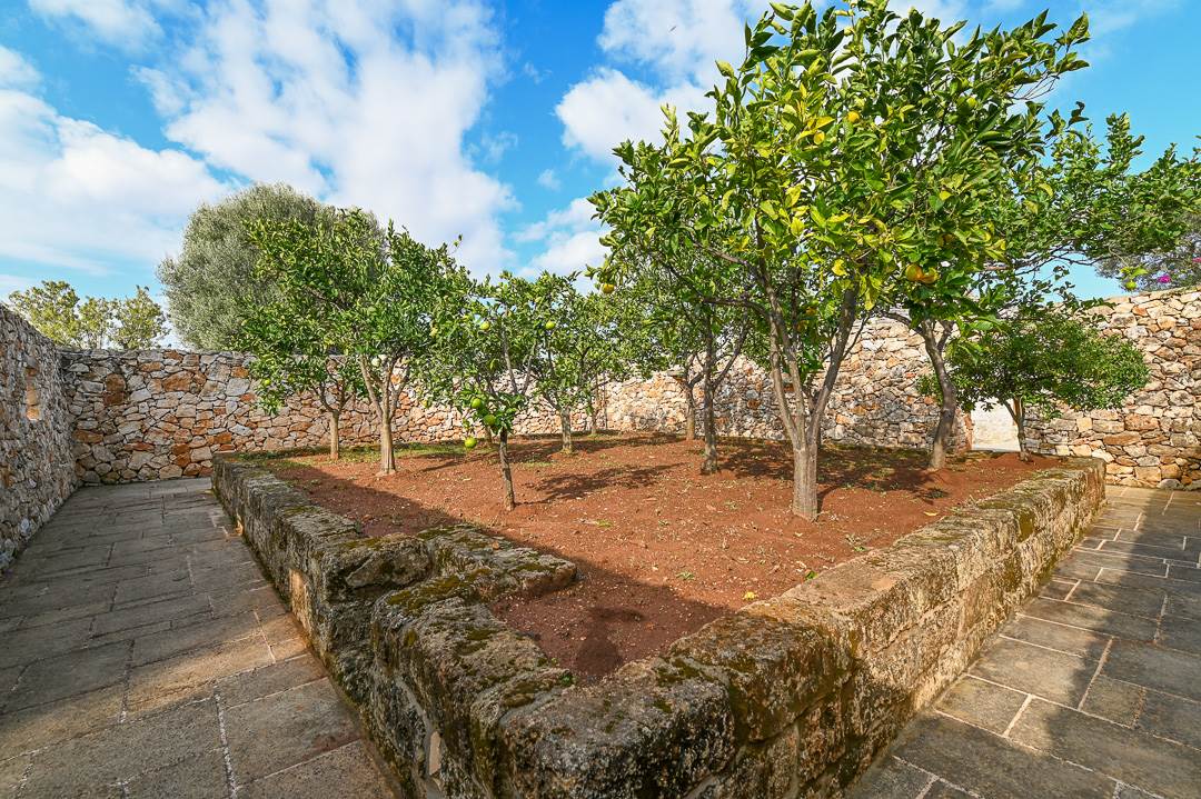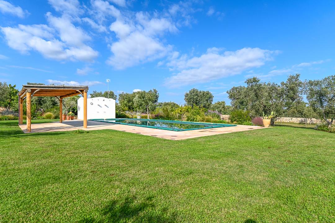 The swimming pool, 60 sqm, located in a sunny position in the middle of a large lawn, is surrounded by stone flooring, a solarium and two comfortable showers. A characteristic citrus grove, enclosed by high dry stone walls, is located next to the trullo. A stone and masonry oven is located near a pergola.