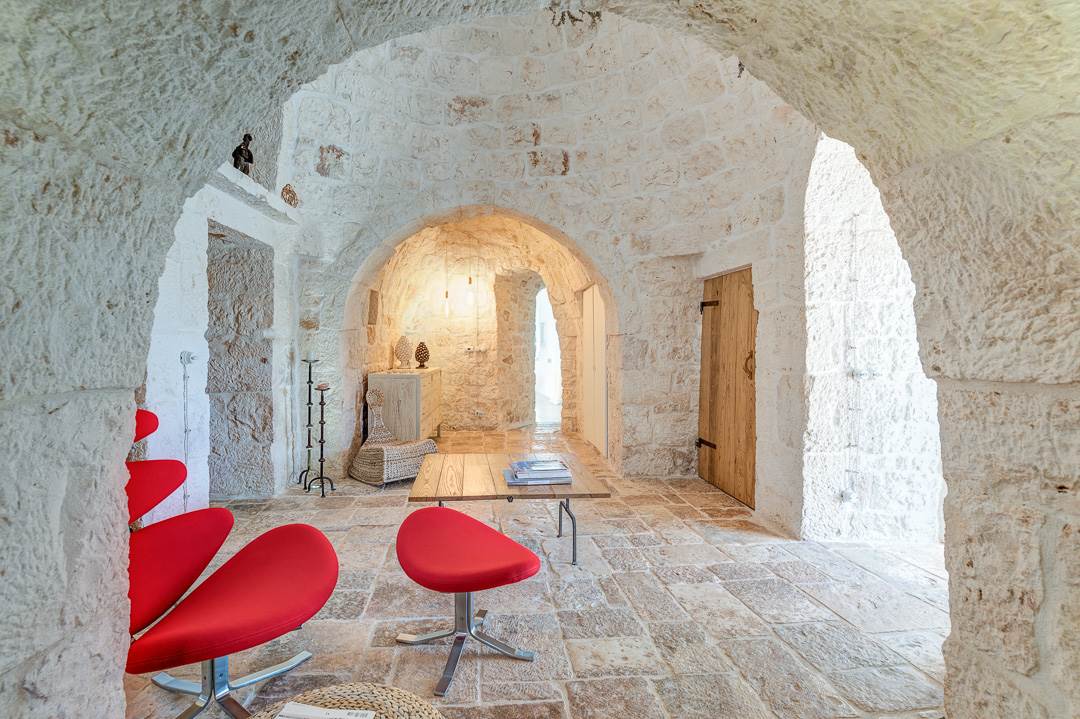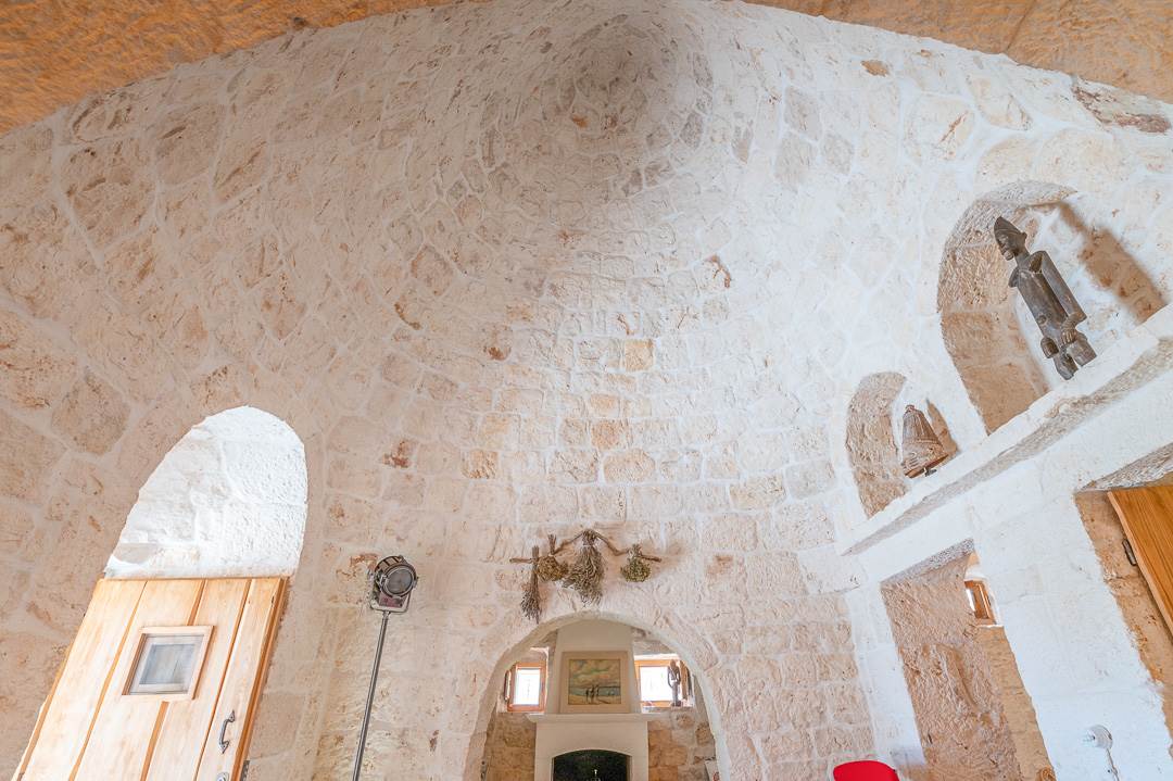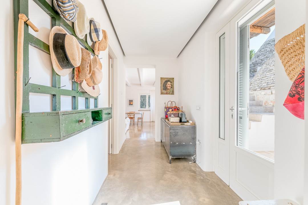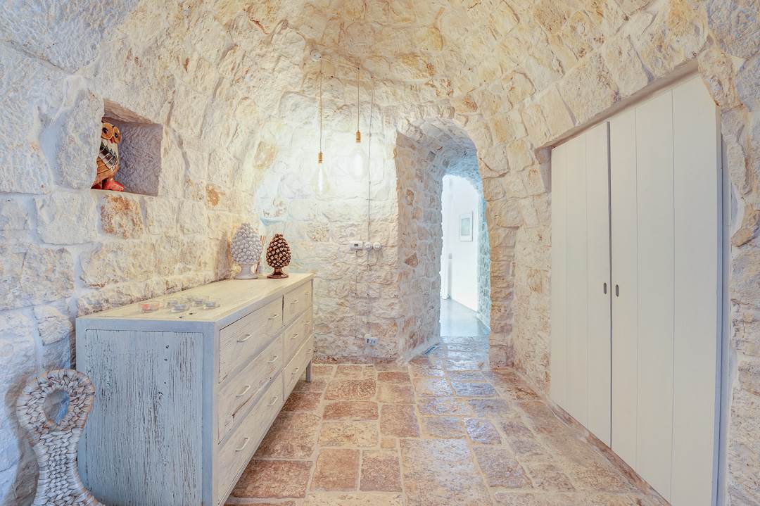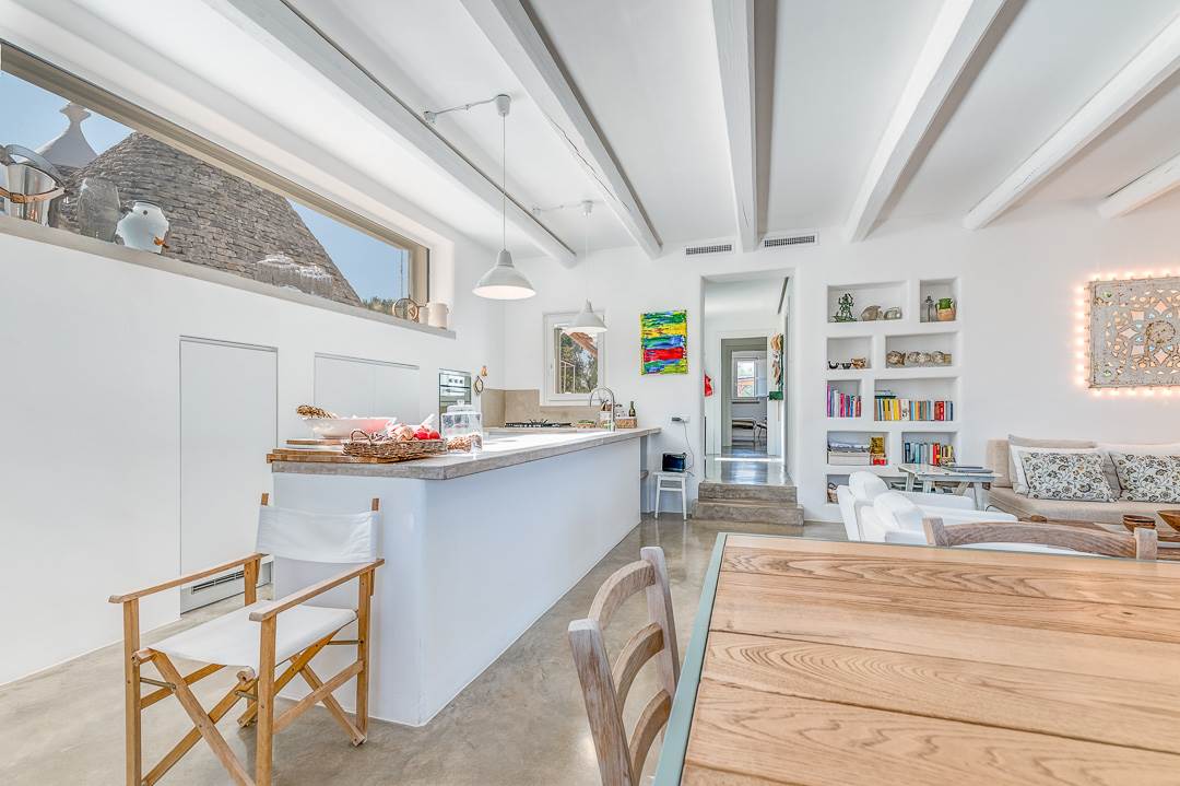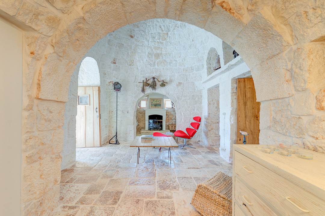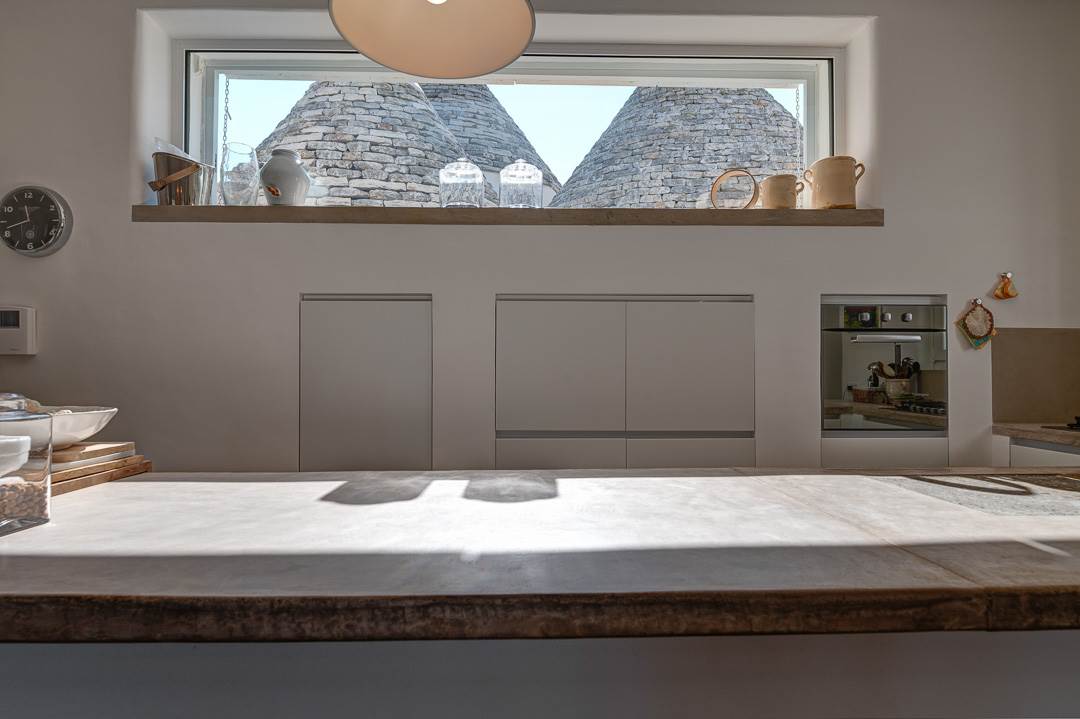 An avenue leads to the entrance of the trullo. The trullo, consisting of five cones, houses a large entrance, a characteristic alcove with stone seats and fireplace, a large bathroom, a bedroom, a second bathroom and a characteristic tunnel corridor that connects the trullo with the large and bright living area of the modern part of the building. In the living room there is a modern open kitchen, characterized by a large ribbon window, placed at the top, which allows the view of the characteristic cones of the trullo; the living area is completed by a dining corner and a sofa area with a masonry bookcase.
