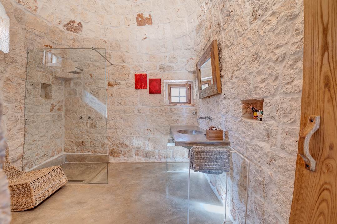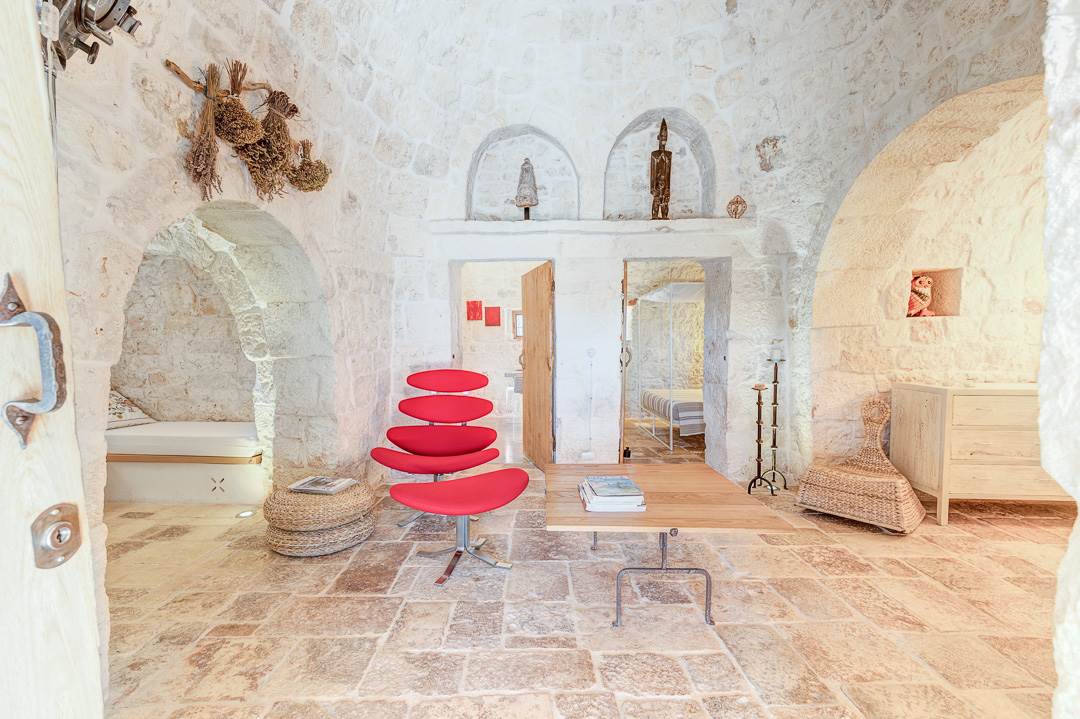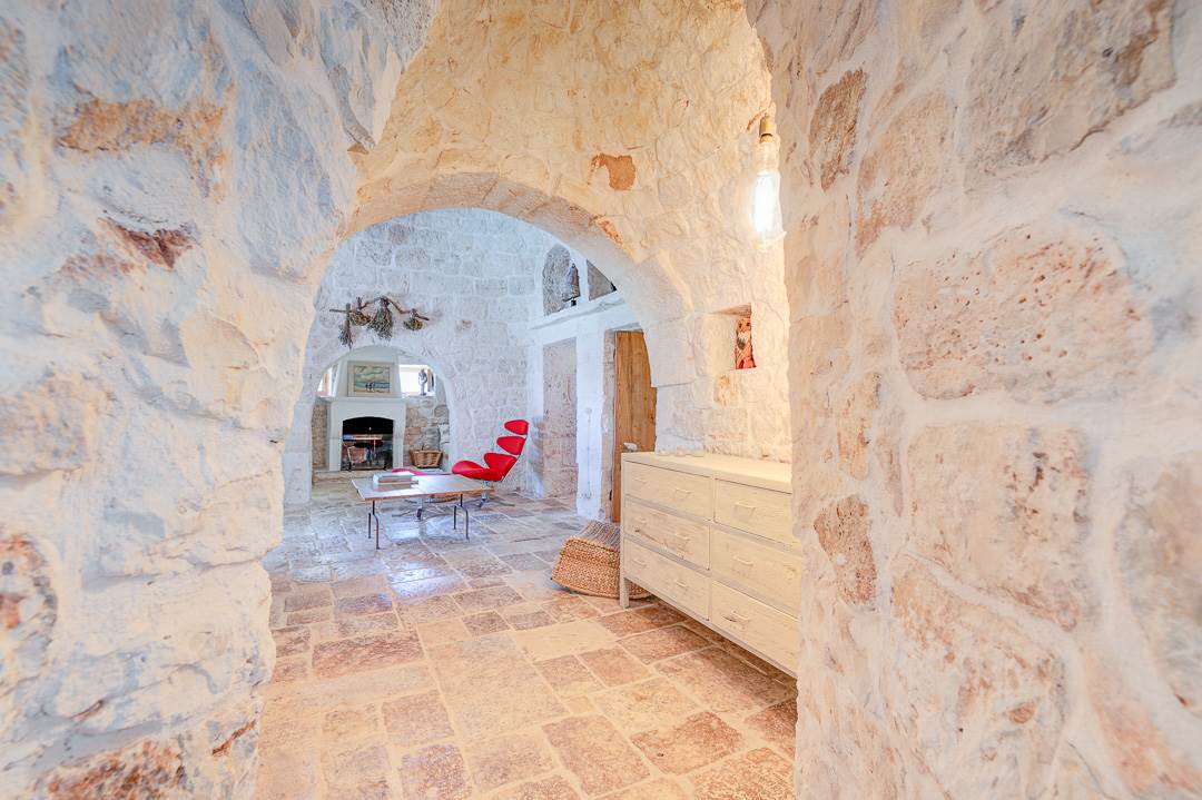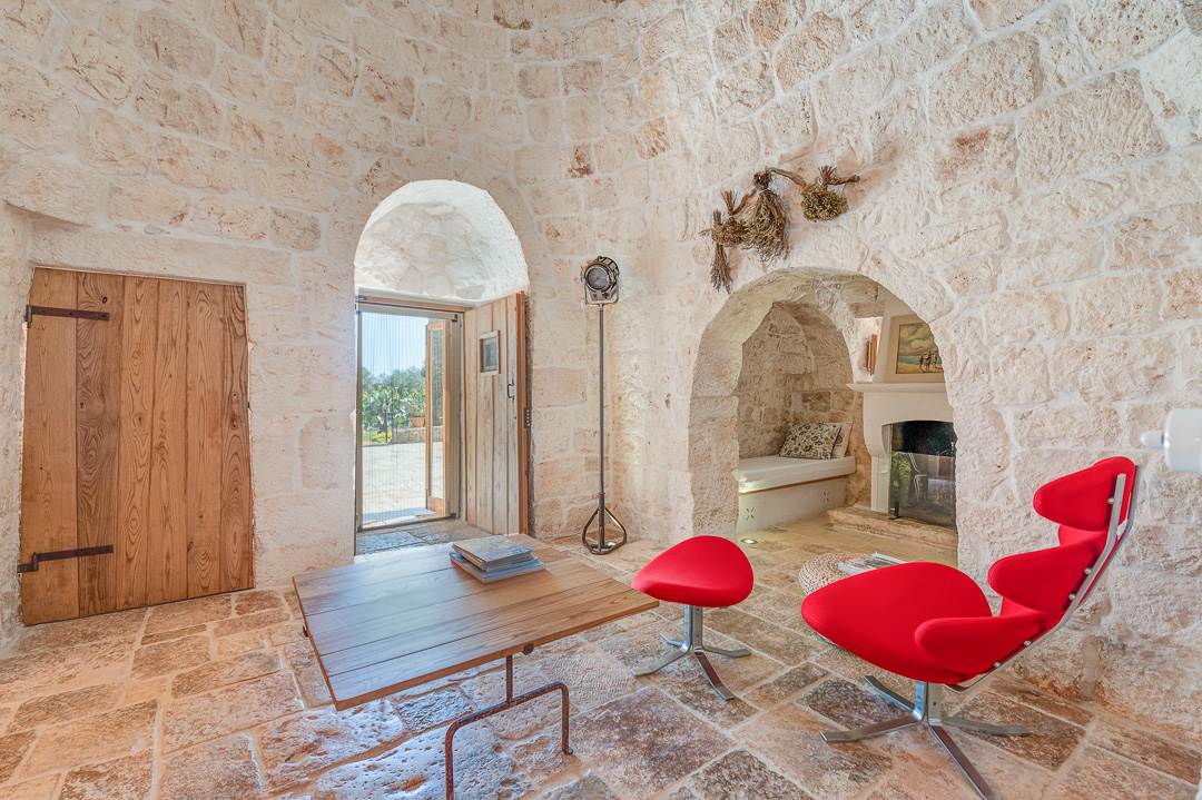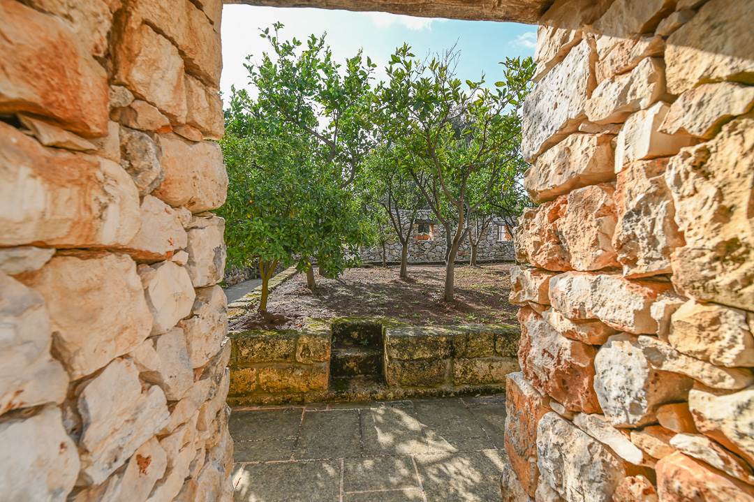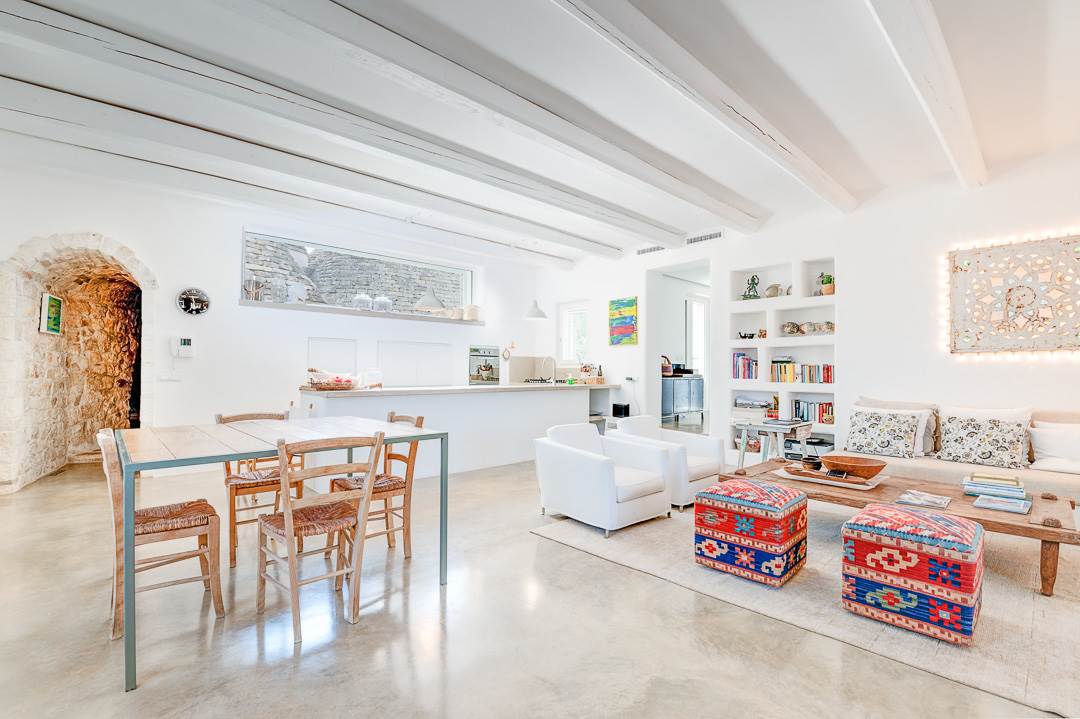 An avenue leads to the entrance of the trullo. The trullo, consisting of five cones, houses a large entrance, a characteristic alcove with stone seats and fireplace, a large bathroom, a bedroom, a second bathroom and a characteristic tunnel corridor that connects the trullo with the large and bright living area of the modern part of the building. In the living room there is a modern open kitchen, characterized by a large ribbon window, placed at the top, which allows the view of the characteristic cones of the trullo; the living area is completed by a dining corner and a sofa area with a masonry bookcase.