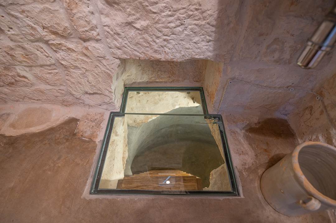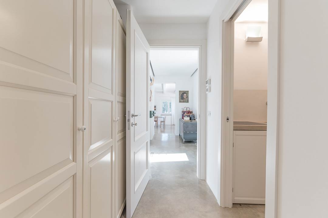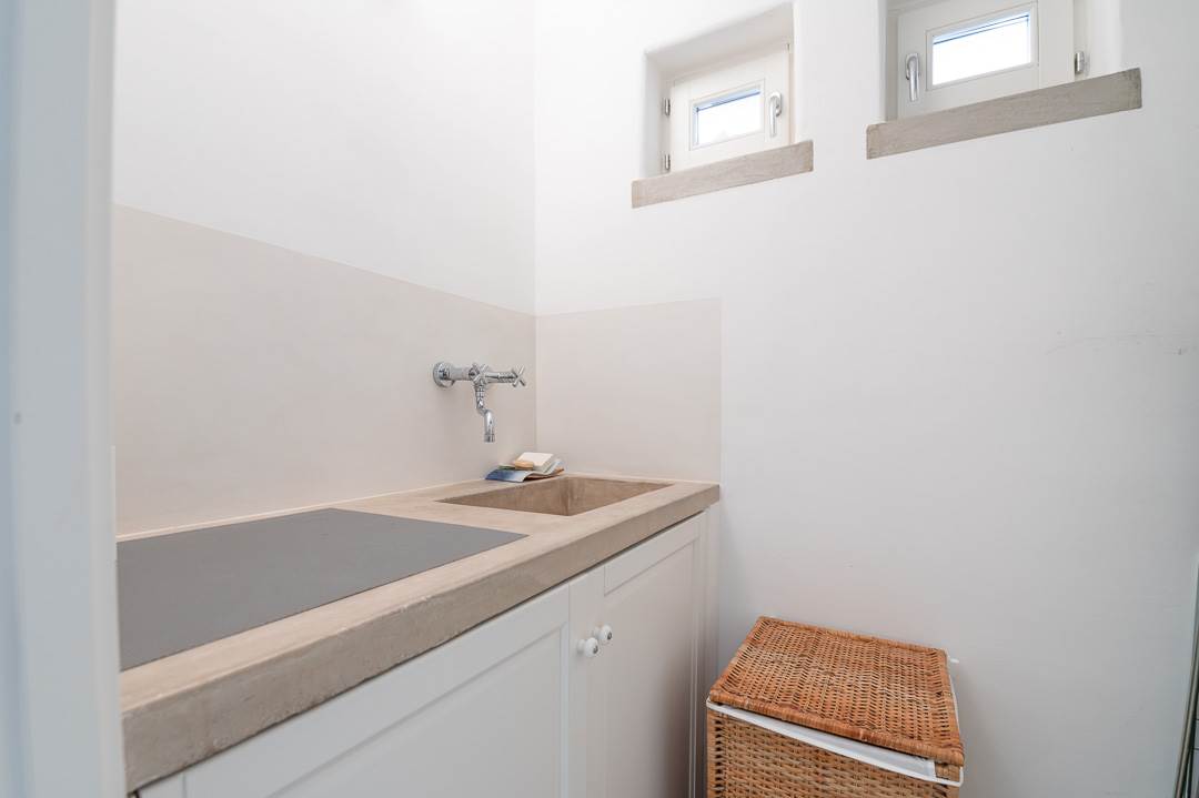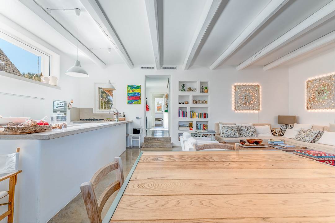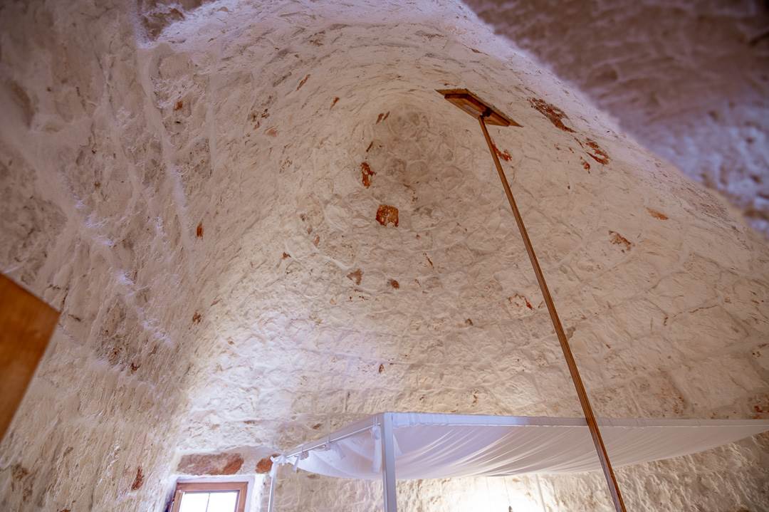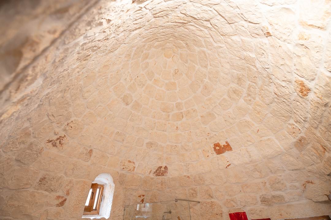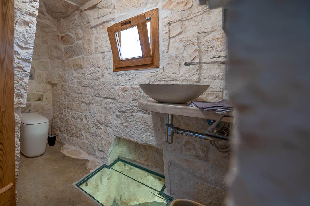 An avenue leads to the entrance of the trullo. The trullo, consisting of five cones, houses a large entrance, a characteristic alcove with stone seats and fireplace, a large bathroom, a bedroom, a second bathroom and a characteristic tunnel corridor that connects the trullo with the large and bright living area of the modern part of the building. In the living room there is a modern open kitchen, characterized by a large ribbon window, placed at the top, which allows the view of the characteristic cones of the trullo; the living area is completed by a dining corner and a sofa area with a masonry bookcase.