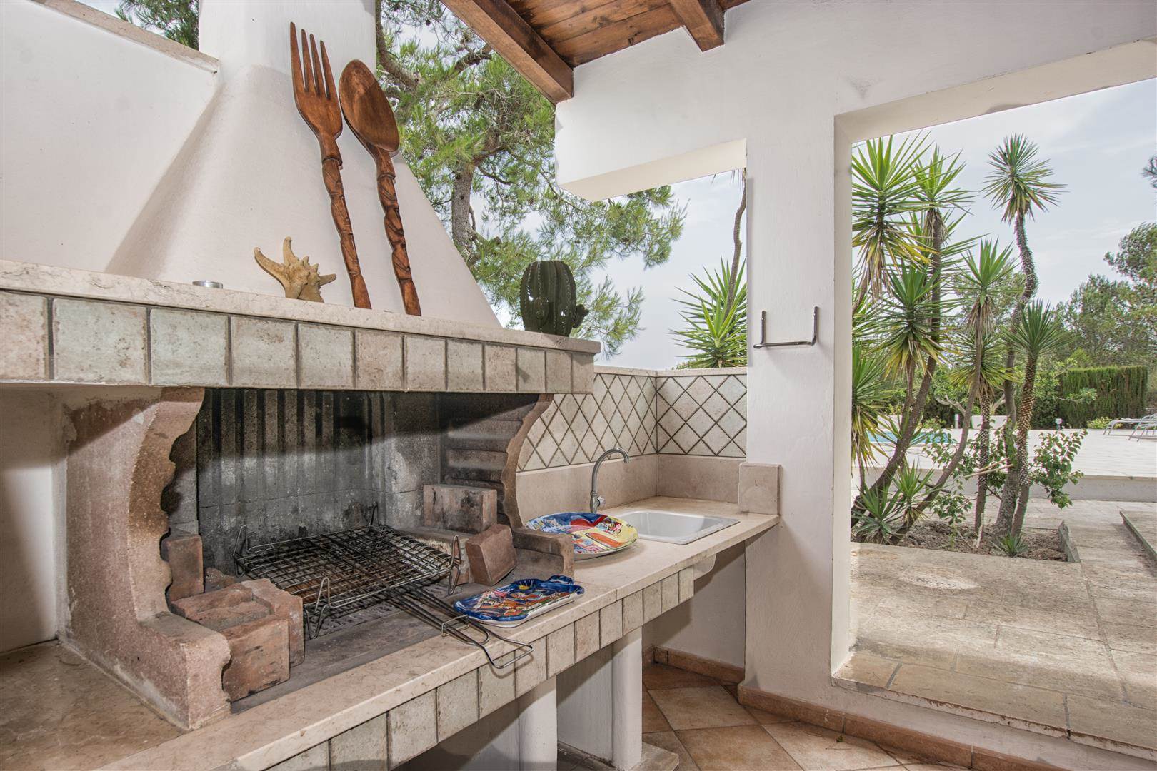 Outside there is a veranda and BBQ, which then leads to the beautiful swimming pool, which is totally private. There is a washroom not attached to the main house, where you will find the washing machine. There is also a storeroom, which is great for storing suitcases, and all things domestic.