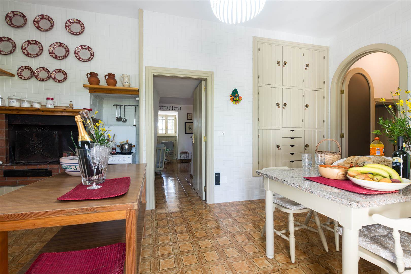 The open plan kitchen has ample room to dine, and is also placed well to cook inside and to then eat on the veranda overlooking Olive trees and the beautifully landscaped gardens and newly built pool.