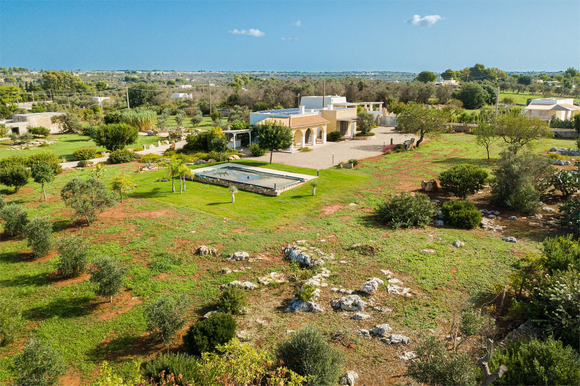 Security is guaranteed by an alarm system, video surveillance with cameras and two automatic gates, main and secondary, for access to the property. A shaded parking area is also available.