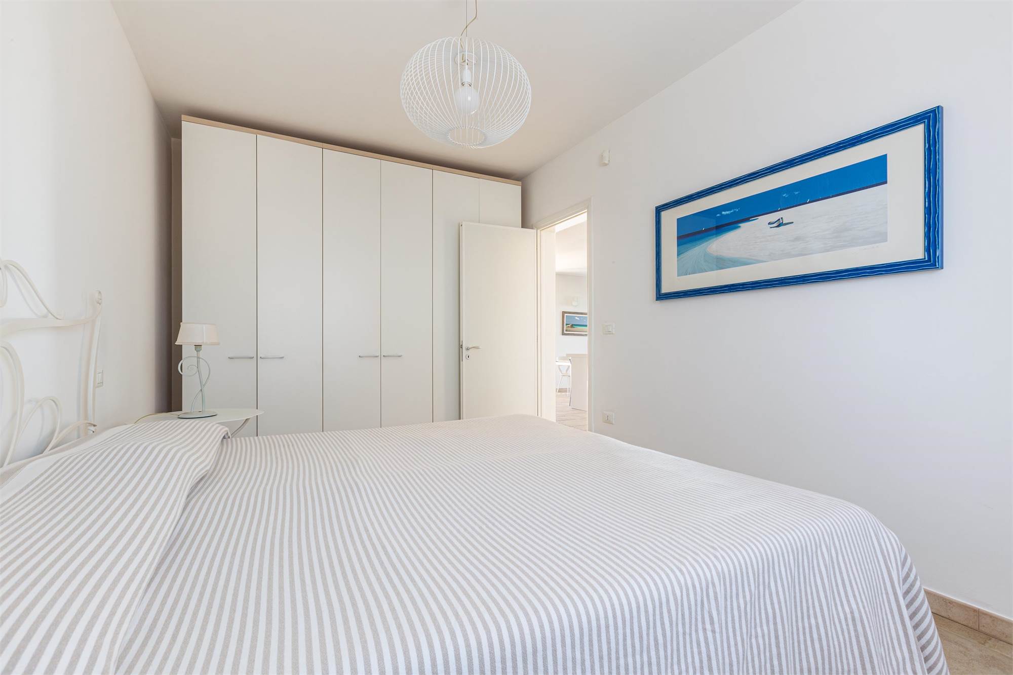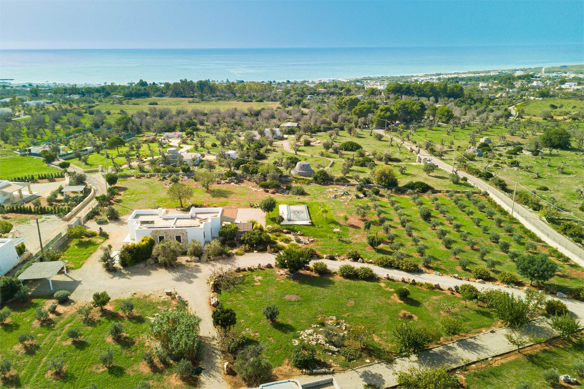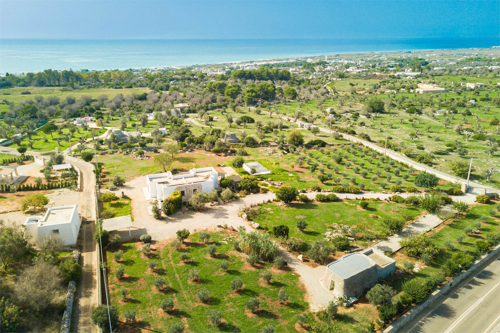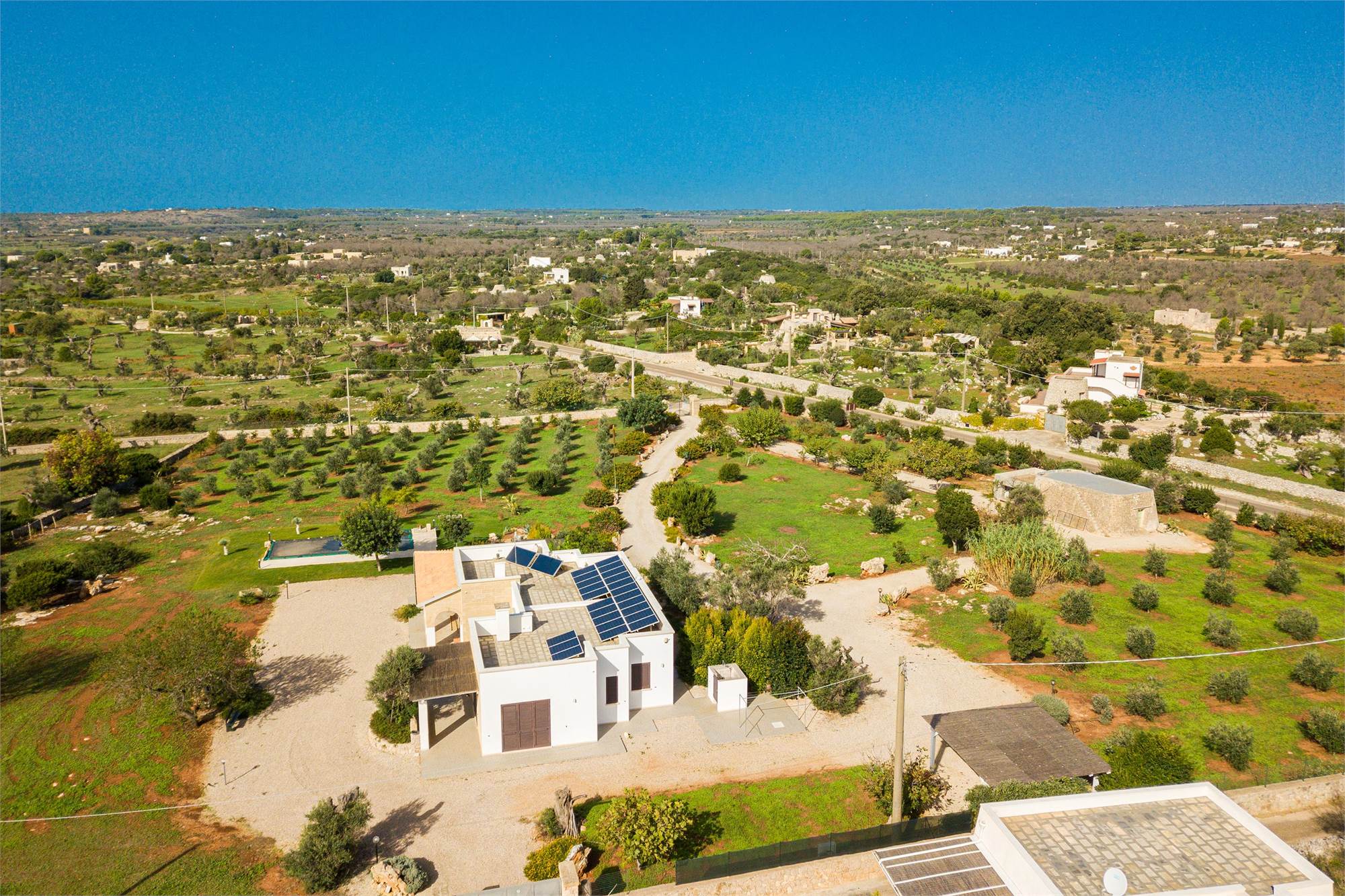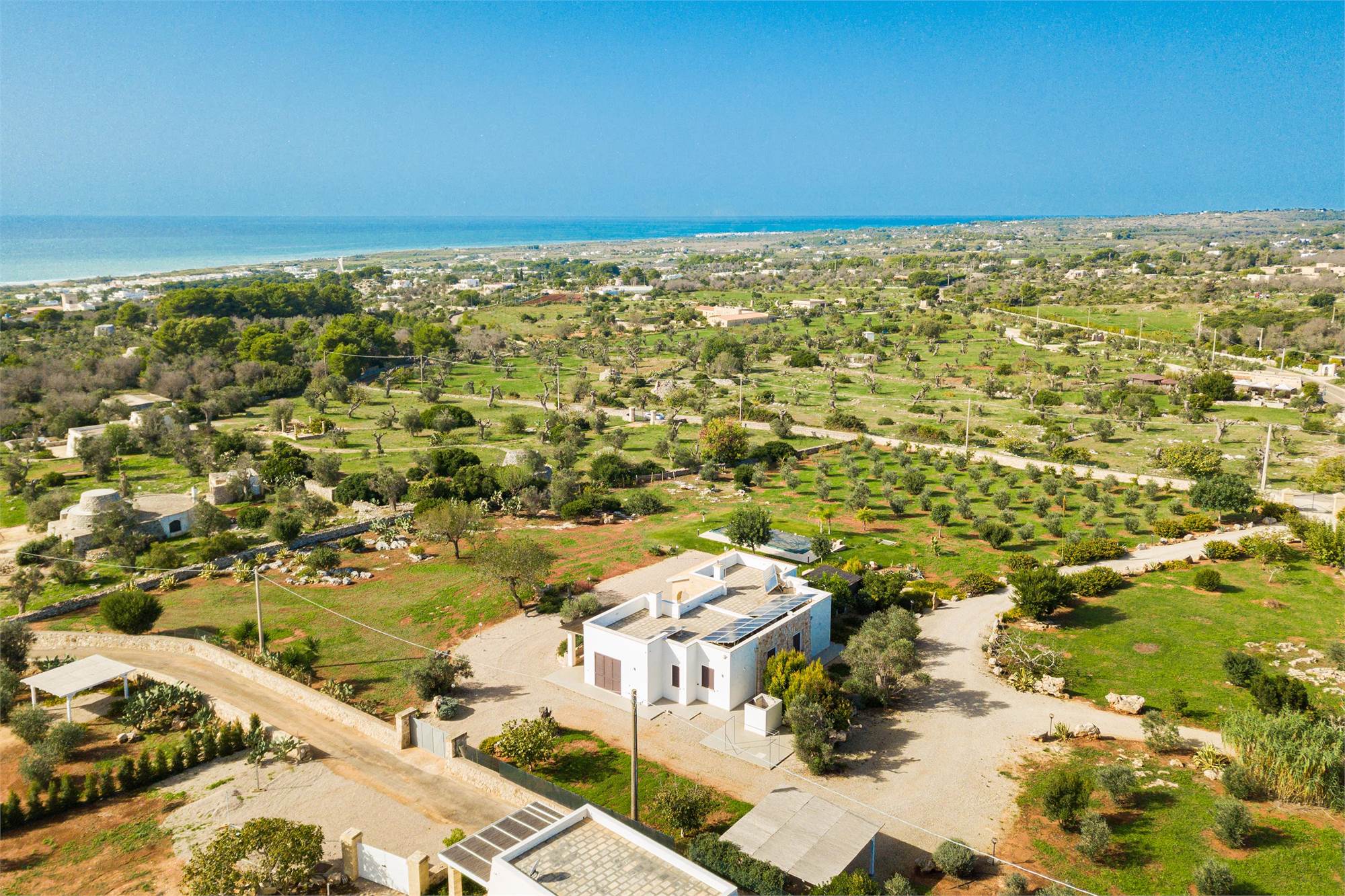 This elegant sea view villa with swimming pool is located in Pescoluse, Marina di Salve (LE), Salento, and is sold fully furnished as shown. The villa is connected to the public water network and has a 6.5 kW photovoltaic system, solar panels for the production of hot water, an artesian well for fresh water, a phytopurification system, an automated irrigation system and outdoor lighting.