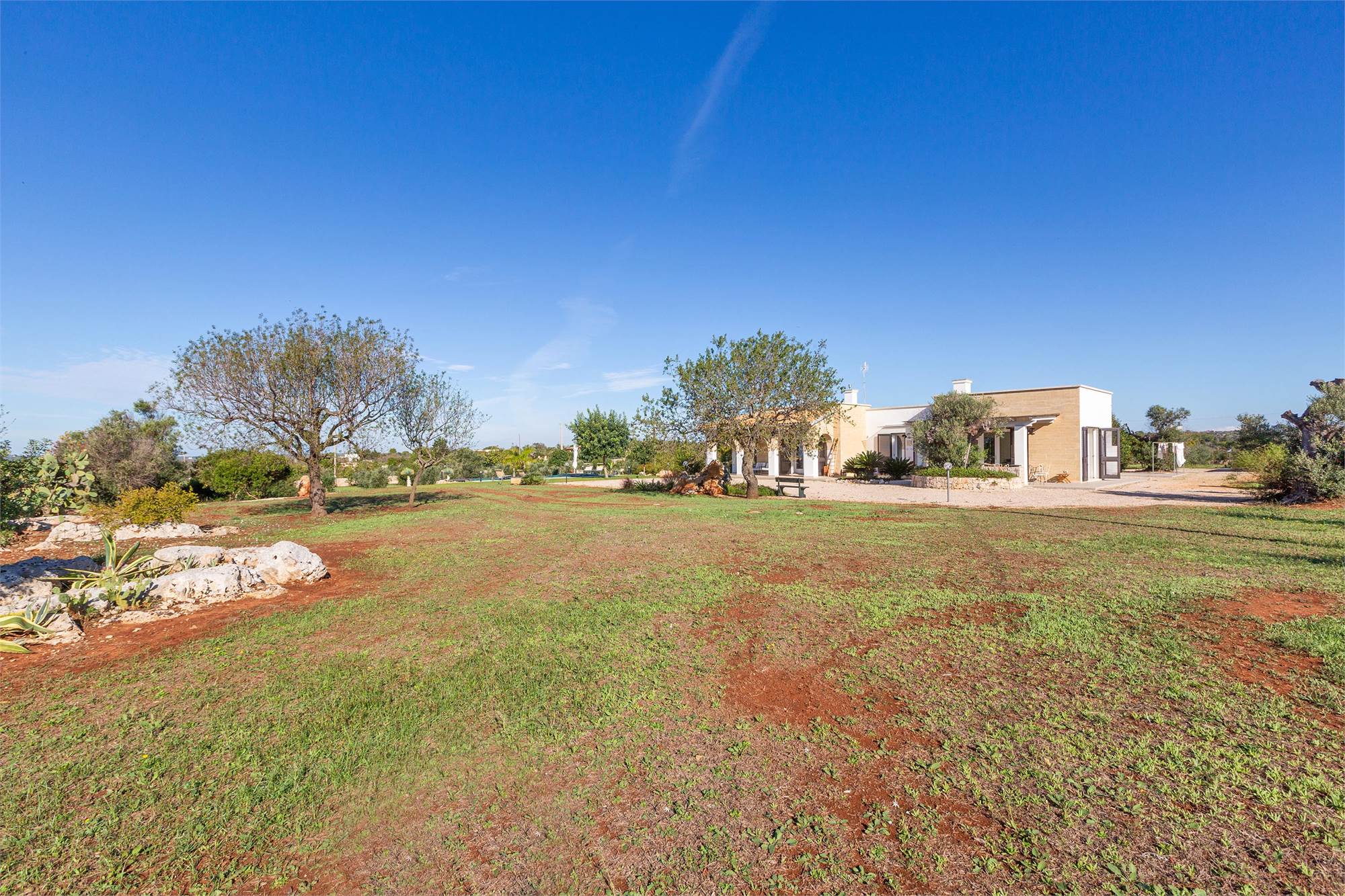 The large outdoor area offers many opportunities to spend moments of tranquility immersed in the beauty of the garden. The terraces, with a large shaded porch with bamboo and a corner porch with tiles, are ideal places to enjoy refreshments at sunset. The garden houses a variety of Mediterranean shrubs, tall trees, aromatic herbs, a citrus grove, a small vineyard and 100 newly planted olive trees.
