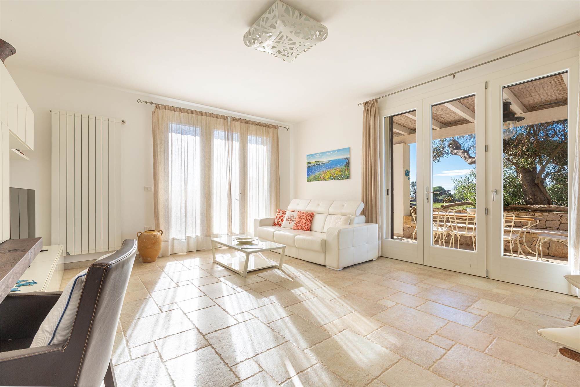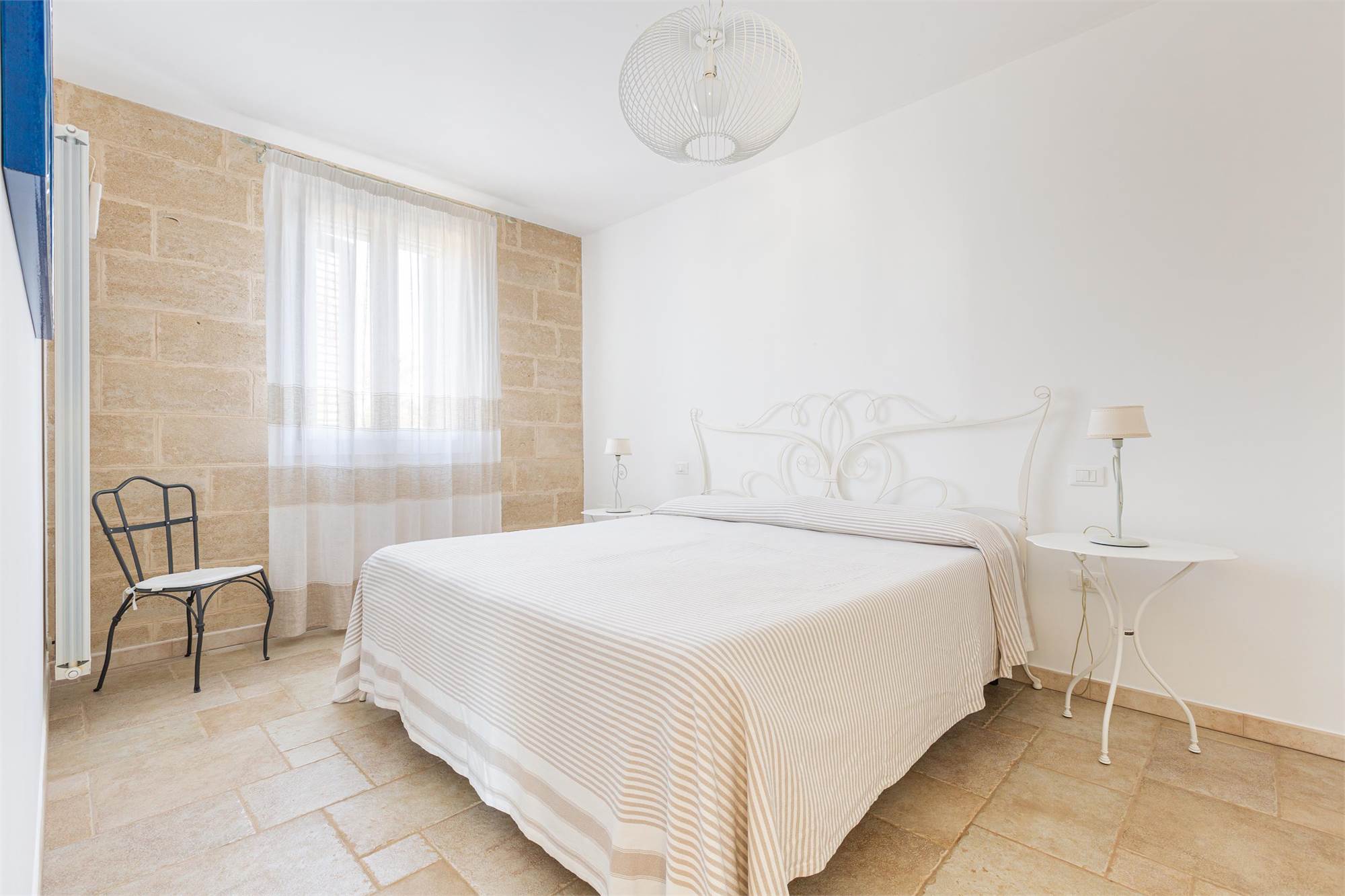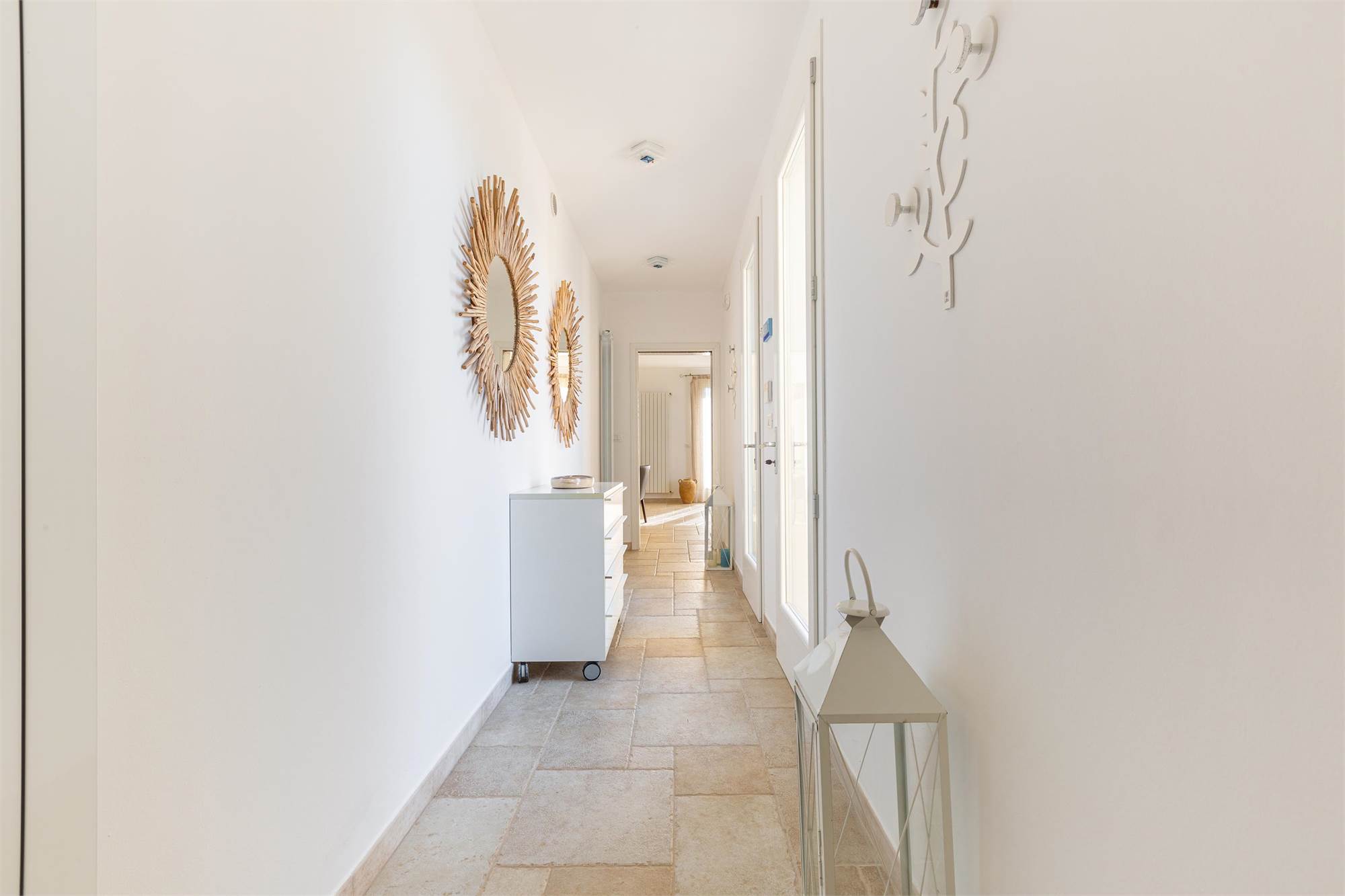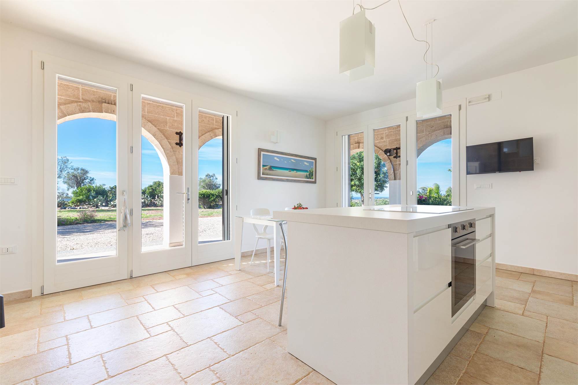 The villa is characterized by living stone coverings, typical of Salento, and enjoys beautiful natural lighting in all seasons thanks to the large windows and bright windows overlooking the garden, offering an enchanting sea view.
