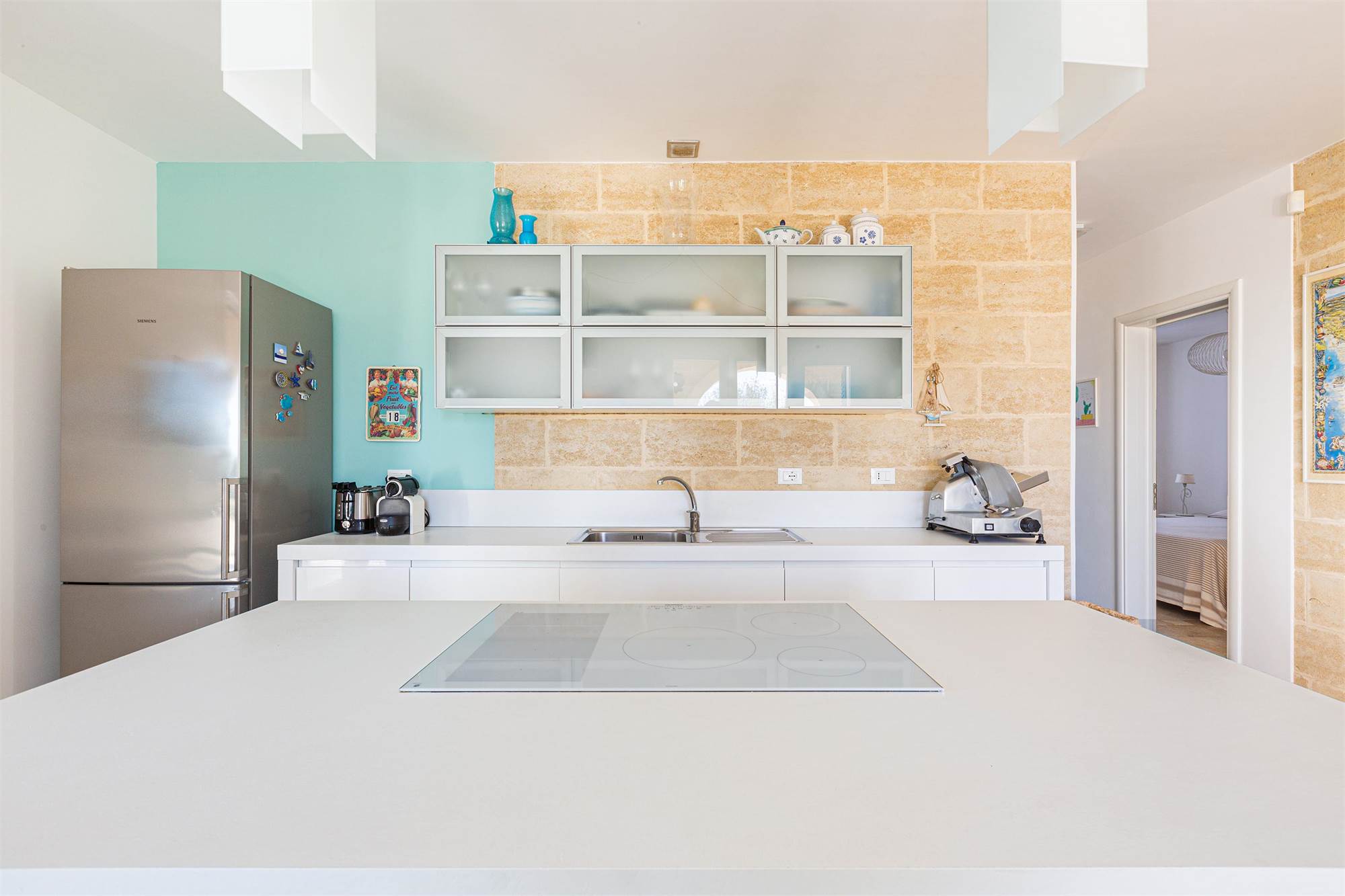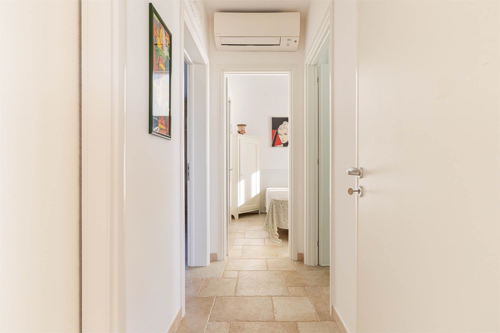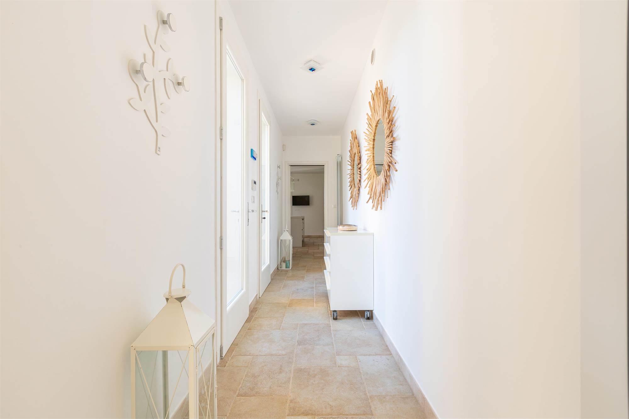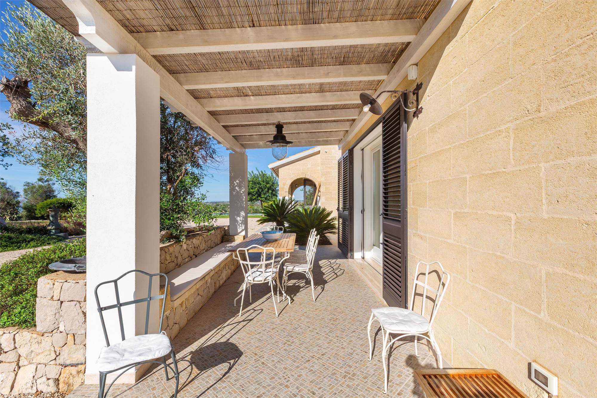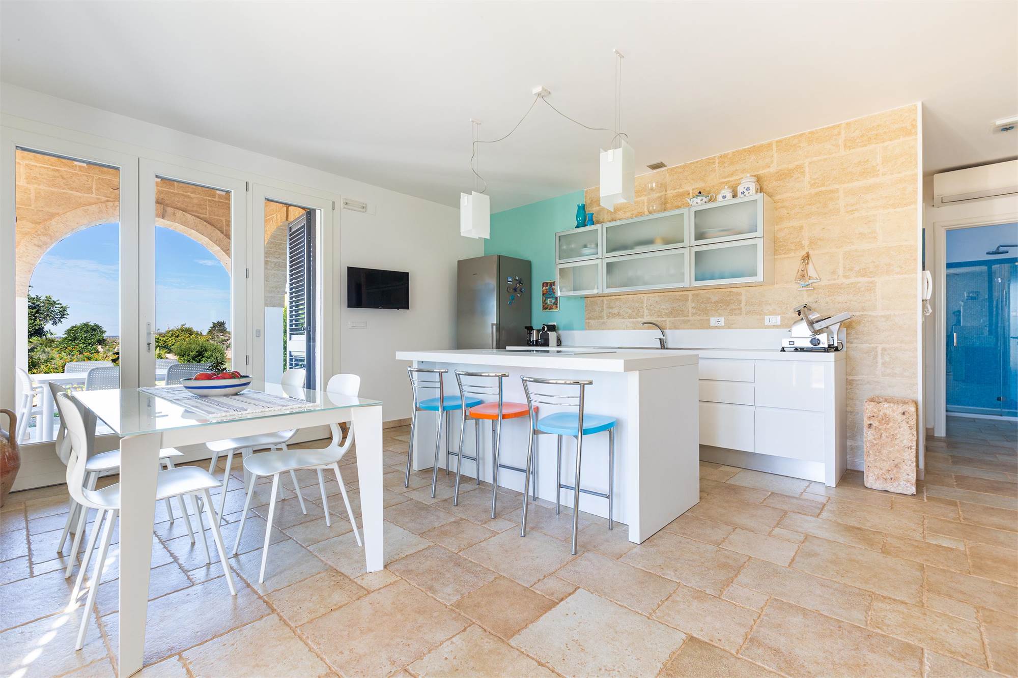 The villa is characterized by living stone coverings, typical of Salento, and enjoys beautiful natural lighting in all seasons thanks to the large windows and bright windows overlooking the garden, offering an enchanting sea view.