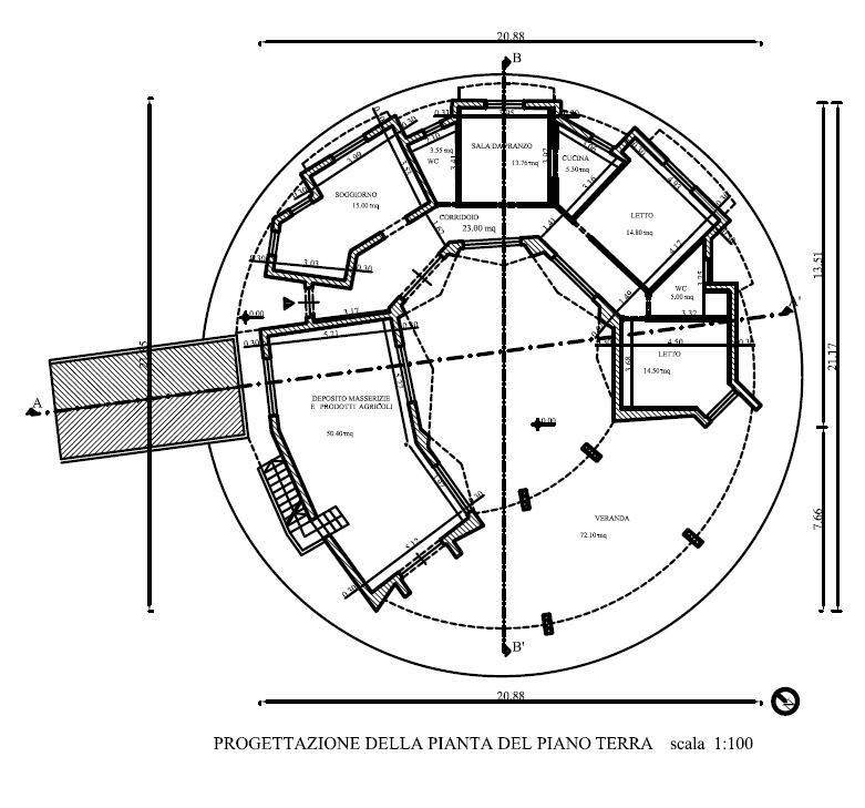 Situated in a dominant position within a lush vineyard, the villa has a semi-octagonal plan, reminiscent of that of the Castle of Frederick II in Andria. The rooms of the villa are articulated around a central patio, closed by a large veranda overlooking the vineyard below.