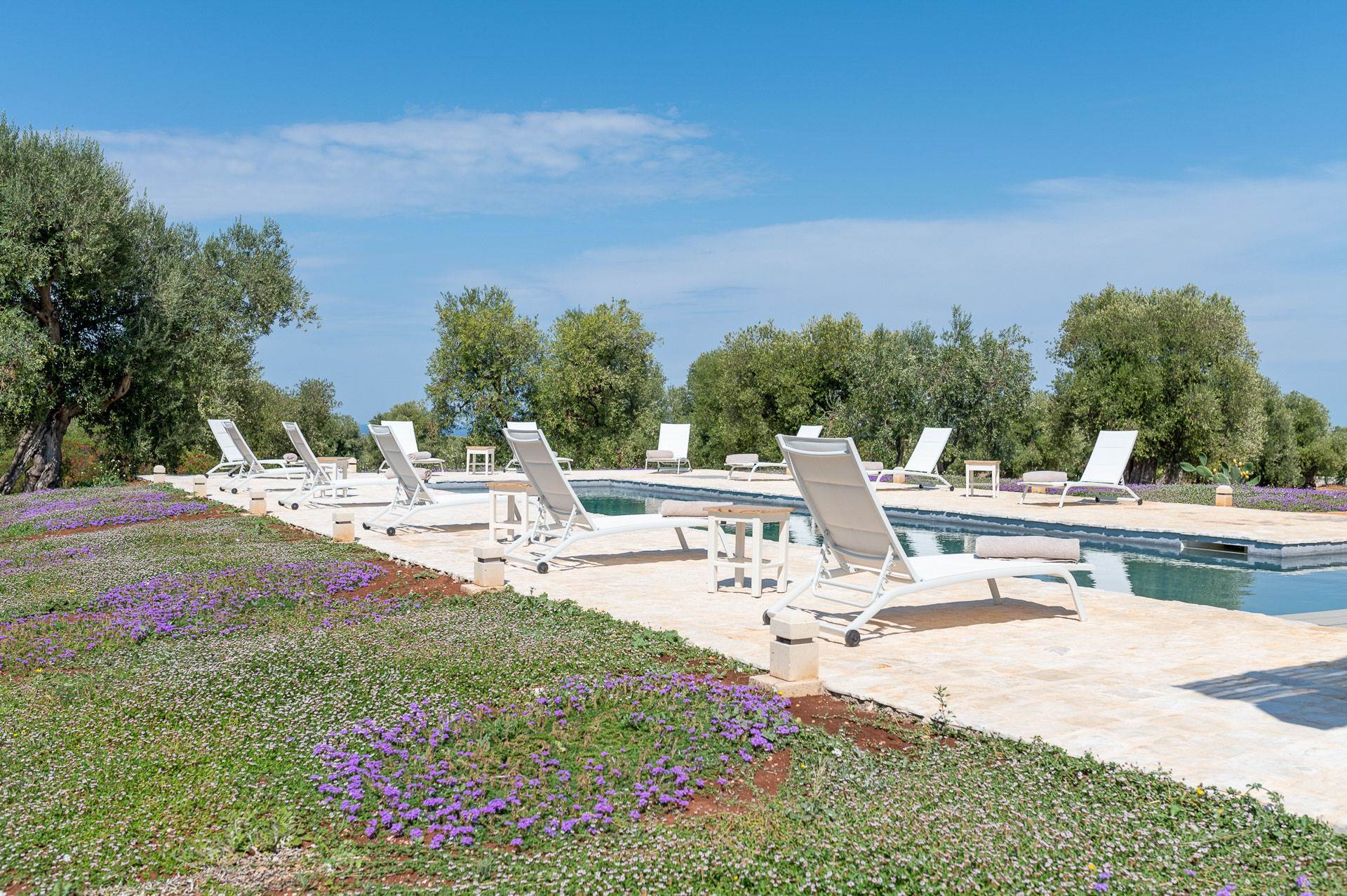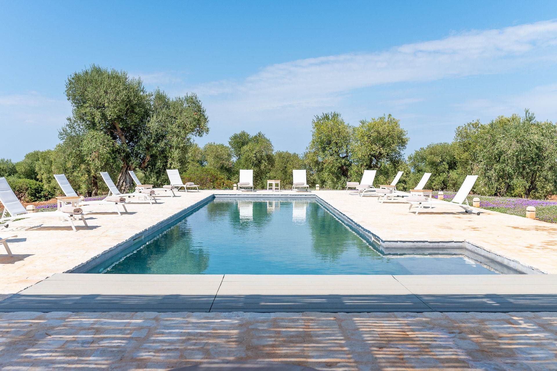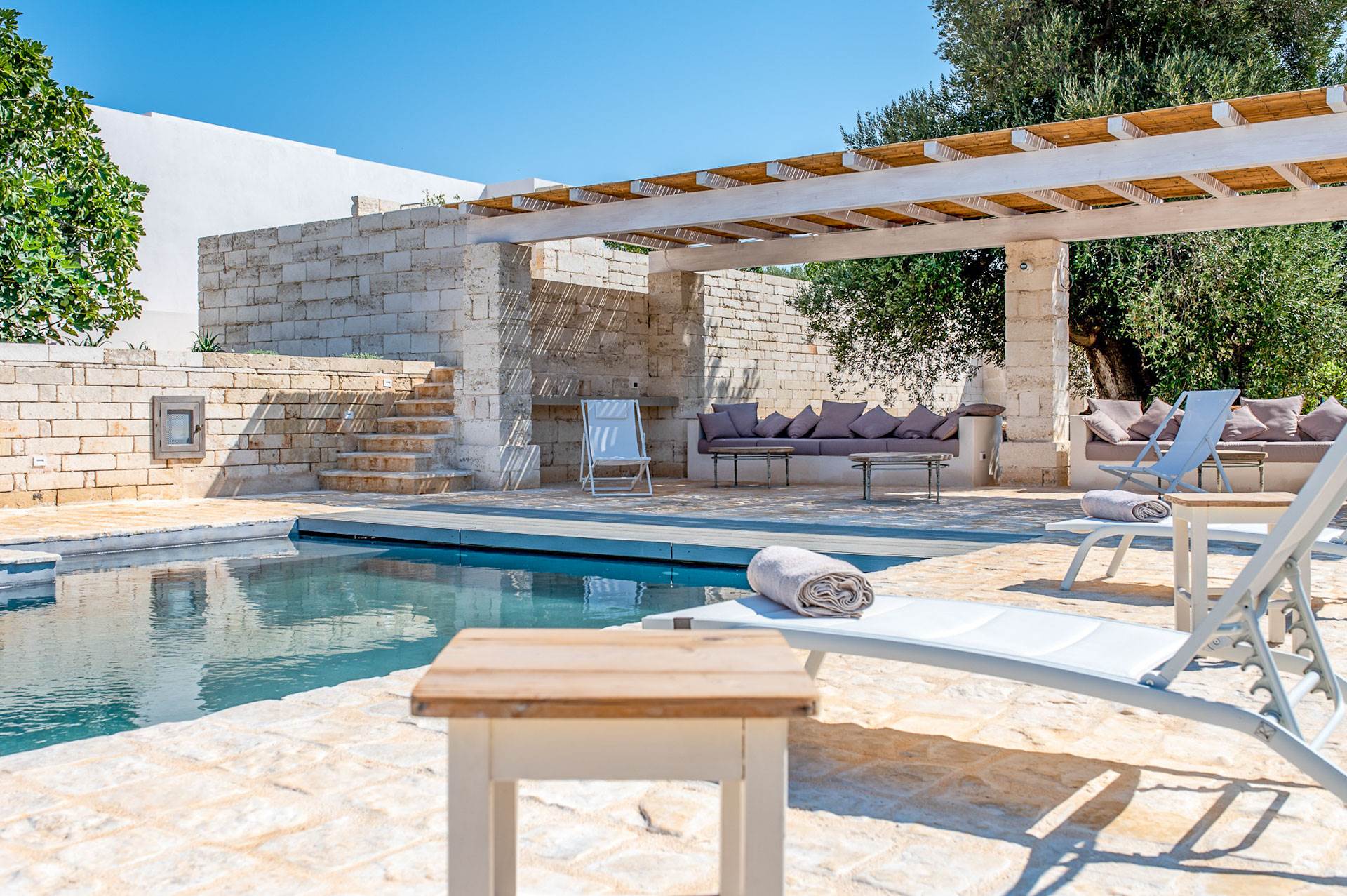The external environments of the villa for rent are characterised by the dominant presence of local stone and the Mediterranean garden with a swimming pool (heatable) that create a unique atmosphere to spend a special holiday in the company of friends and relatives.