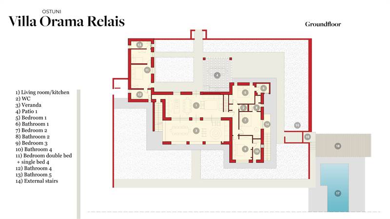 The villa for sale is only 3 km from the centre of Ostuni and 6 km from the wonderful beaches of Torre Pozzelle and Costa Merlata; Villa Orama Relais is immersed in the countryside of the Itria Valley, with a sea view and a panoramic view of the historic centre of Ostuni (from the terrace).