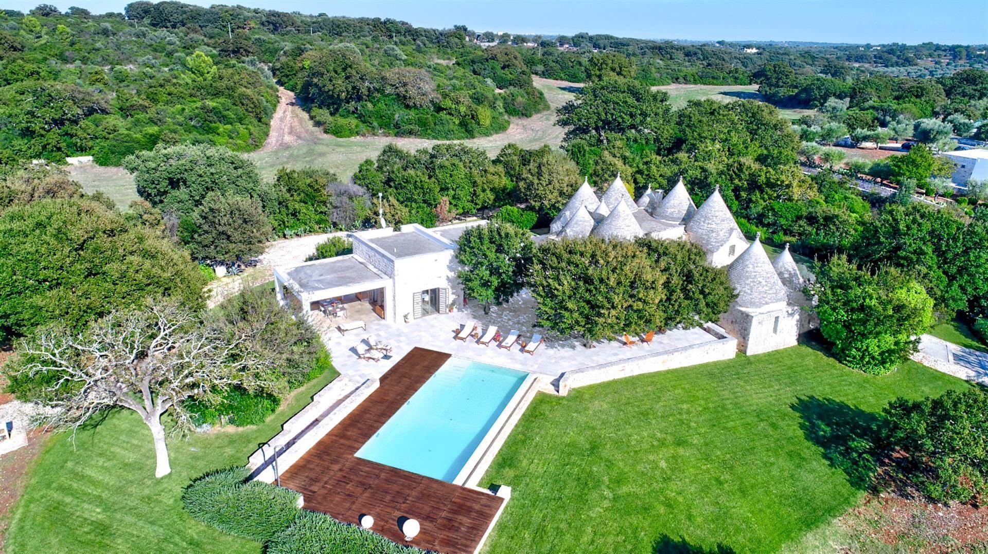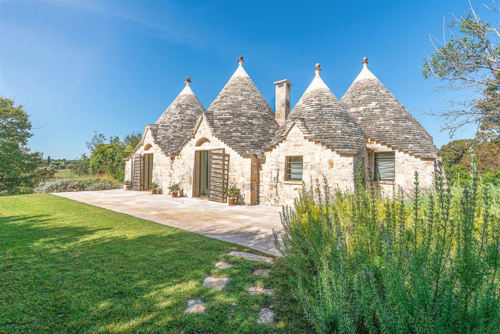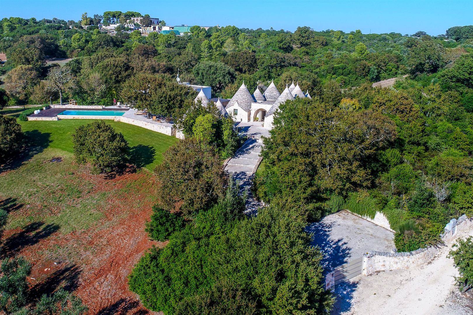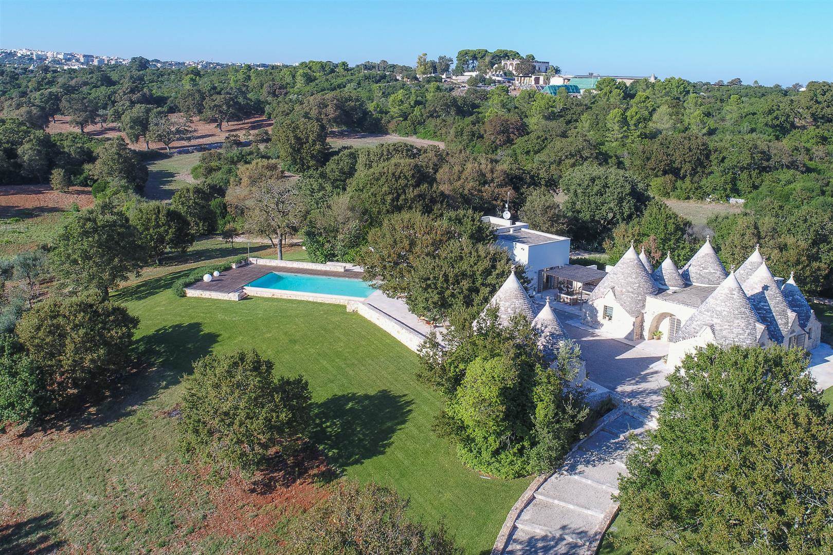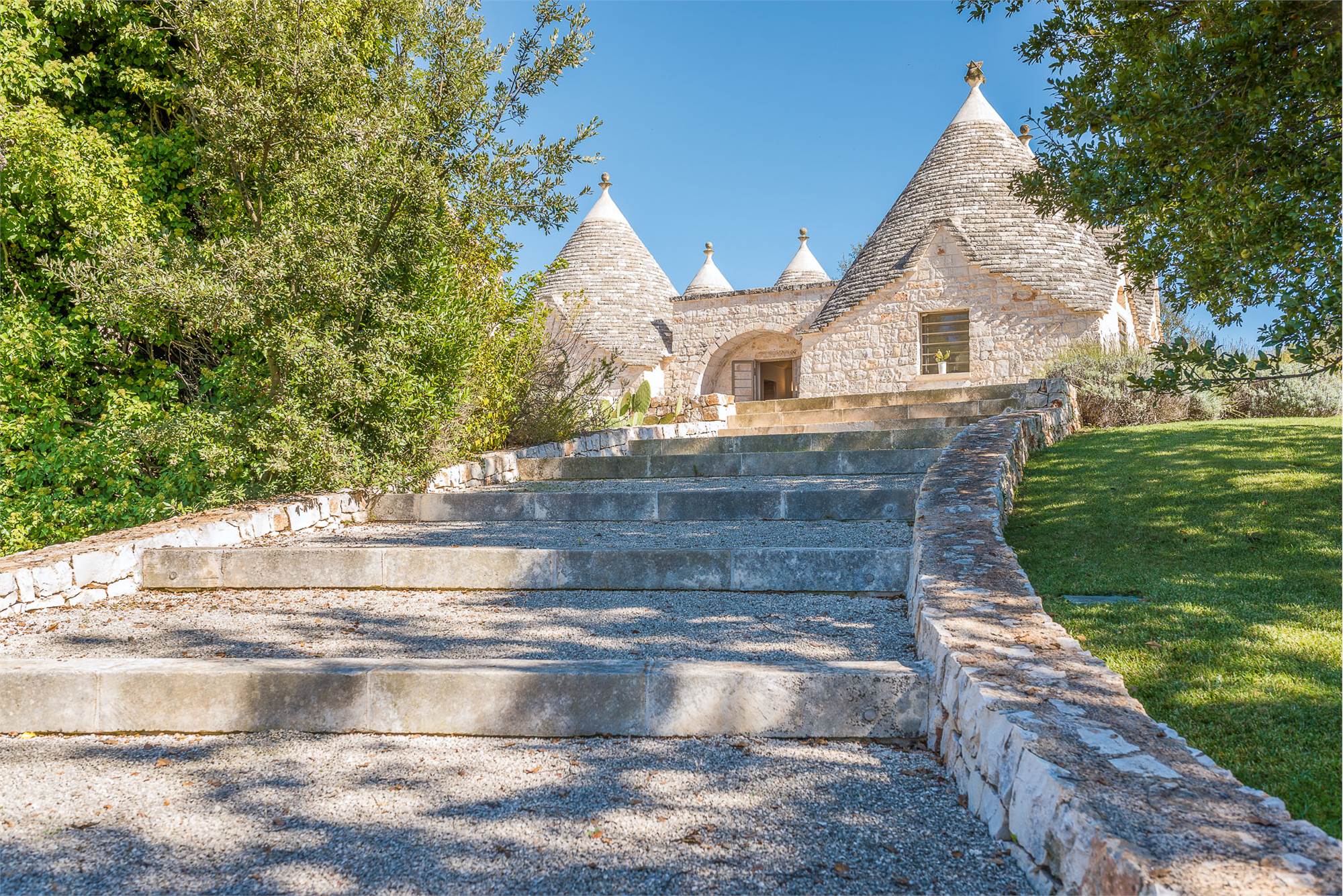 Thanks to the elevated position, Trulli Moncada, dominate the entire valley, giving a unique view of the countryside of the Itria Valley. The entire and extensive property is fully fenced and is surrounded by oak and olive trees. Inside the garden, an English lawn skirts the Trulli and the pool.