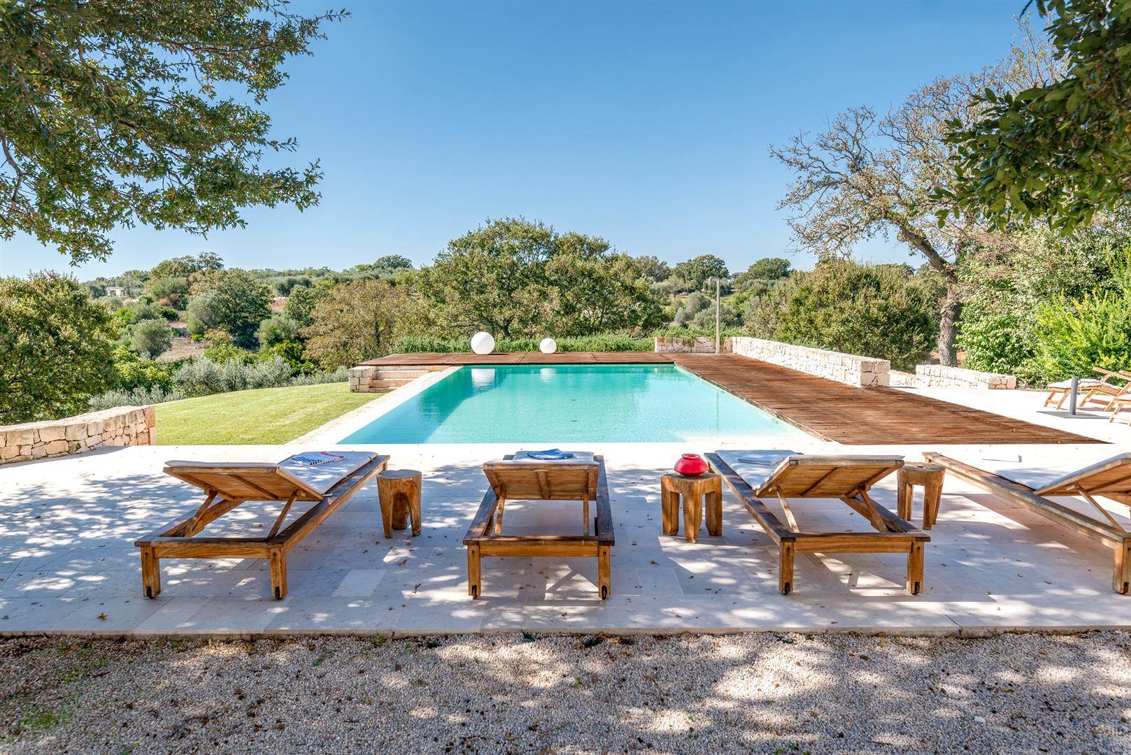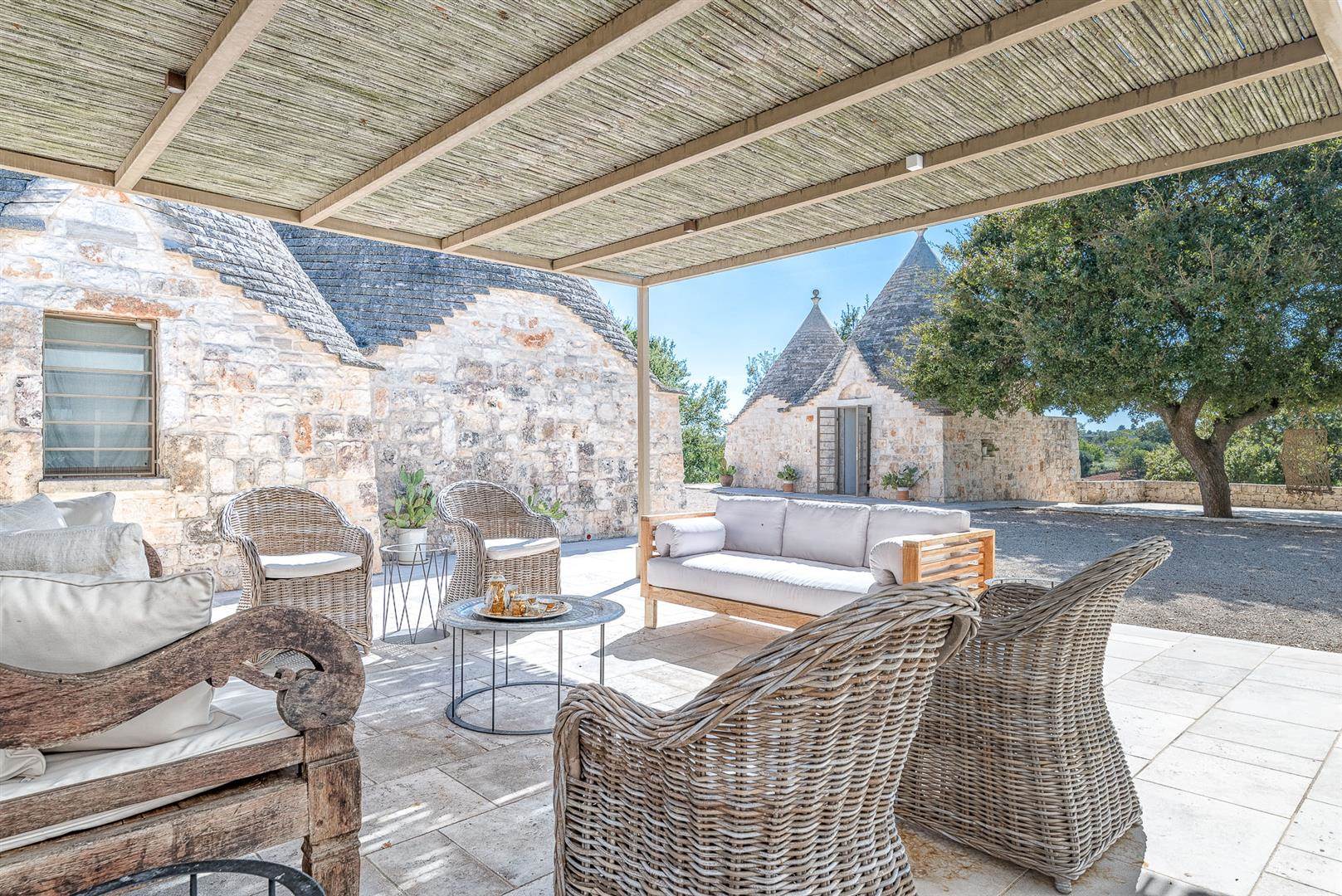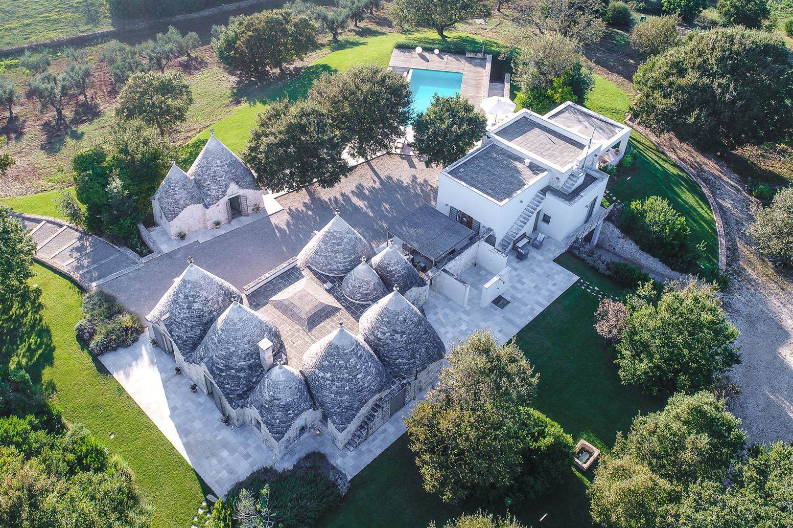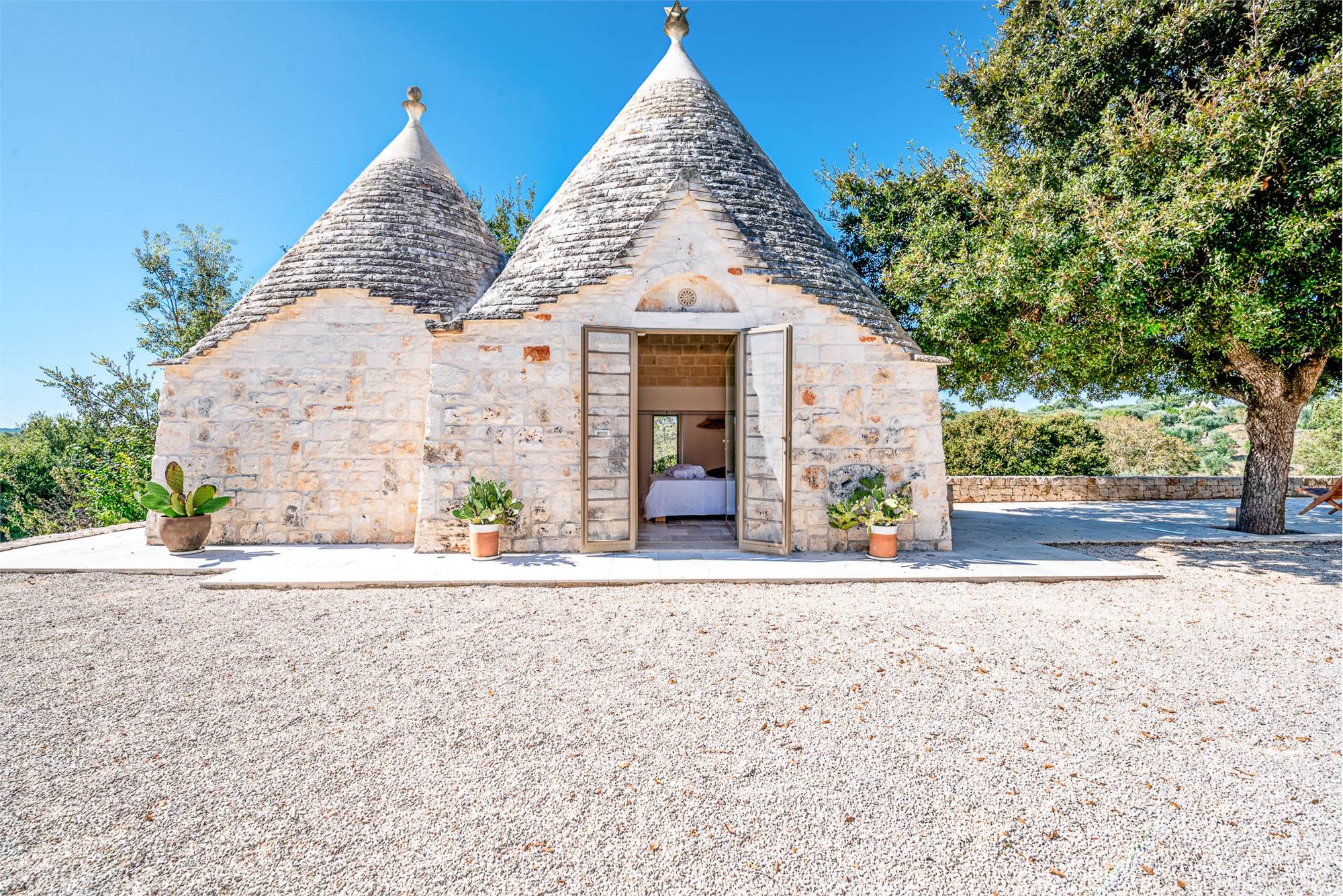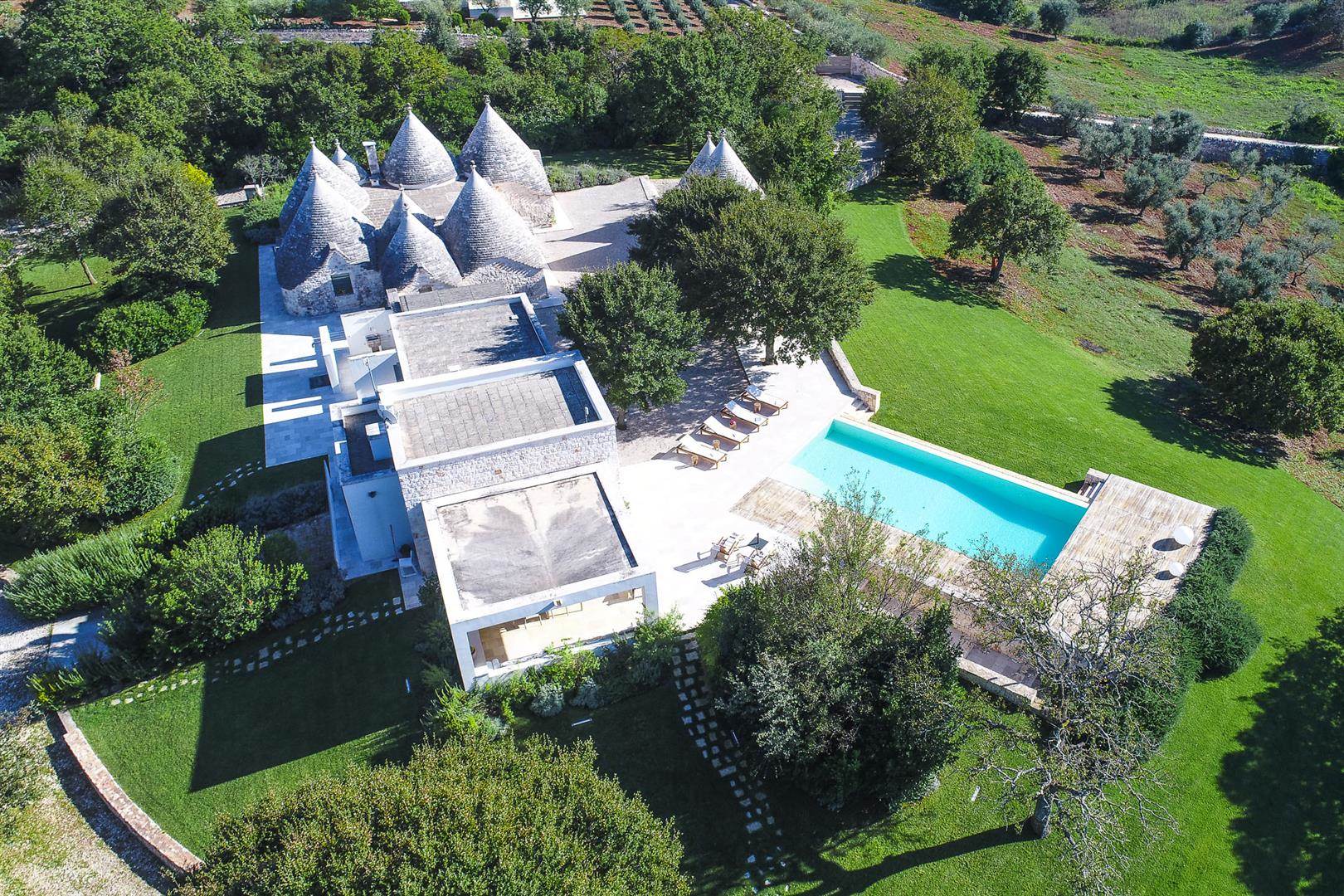 Thanks to the elevated position, Trulli Moncada, dominate the entire valley, giving a unique view of the countryside of the Itria Valley. The entire and extensive property is fully fenced and is surrounded by oak and olive trees. Inside the garden, an English lawn skirts the Trulli and the pool.