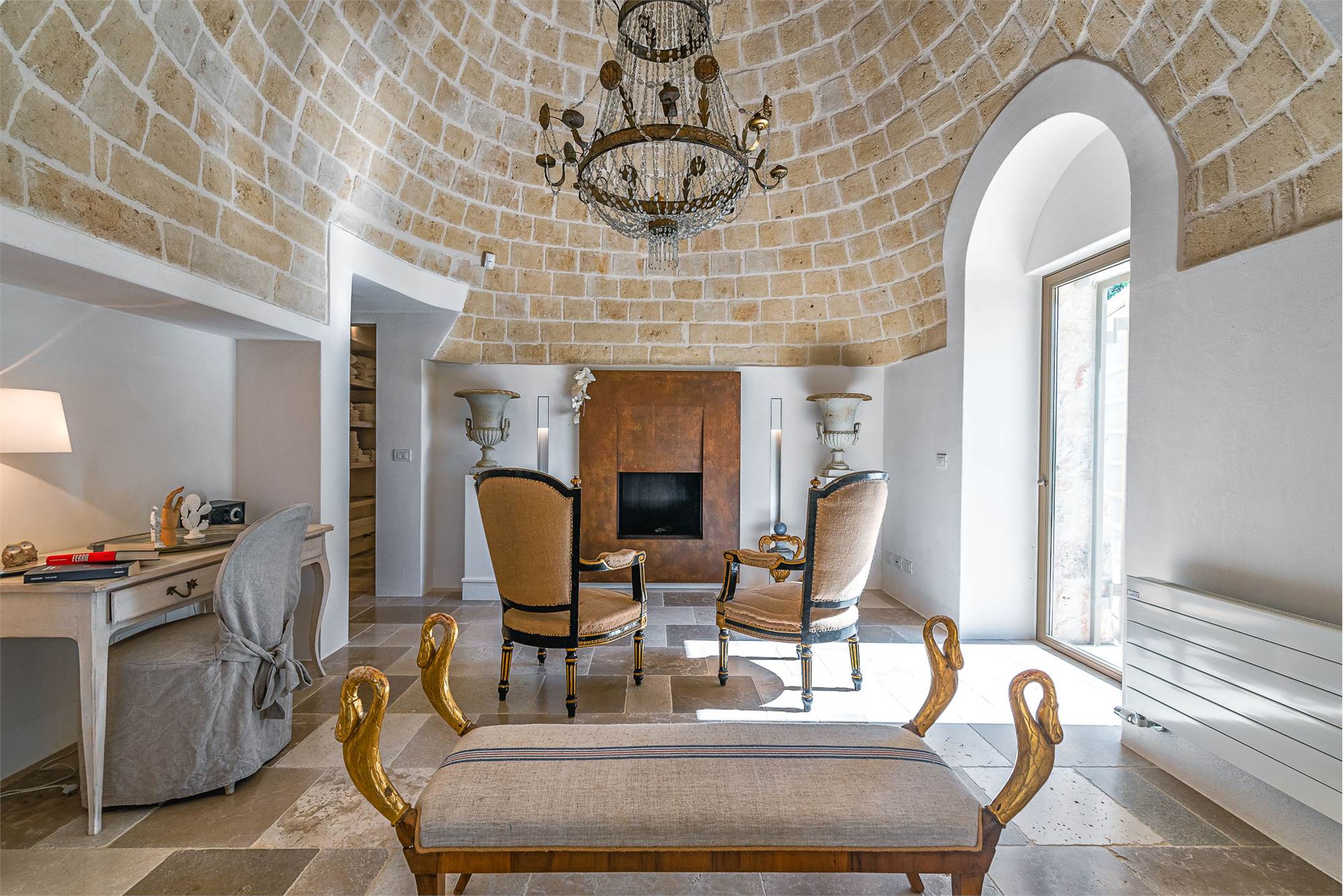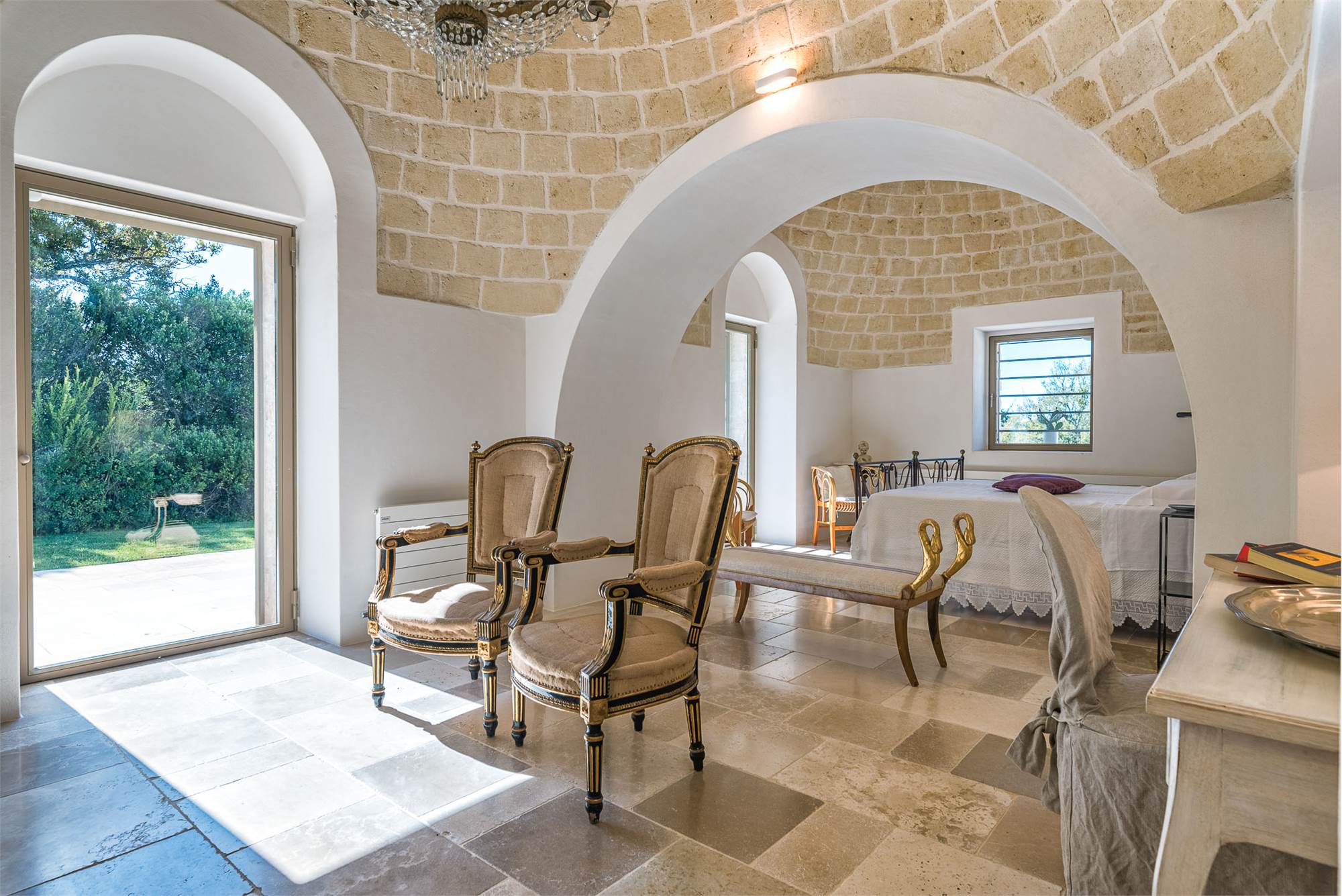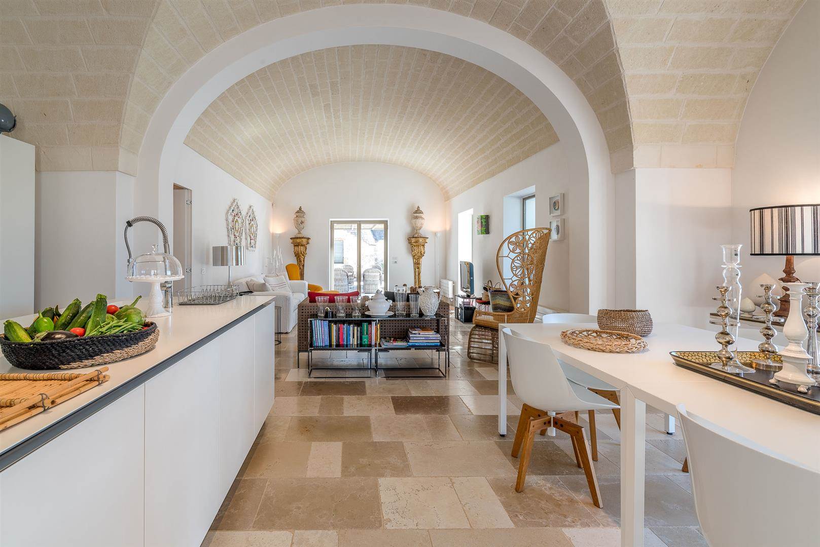 A large lamia, with a net surface of 70sqm, with star and barrel vaults and polished local stone flooring, houses the living area with a comfortable open kitchen, a service area with pantry, a bathroom, a dining area and a large and bright seating area, with large windows overlooking the garden and pool.