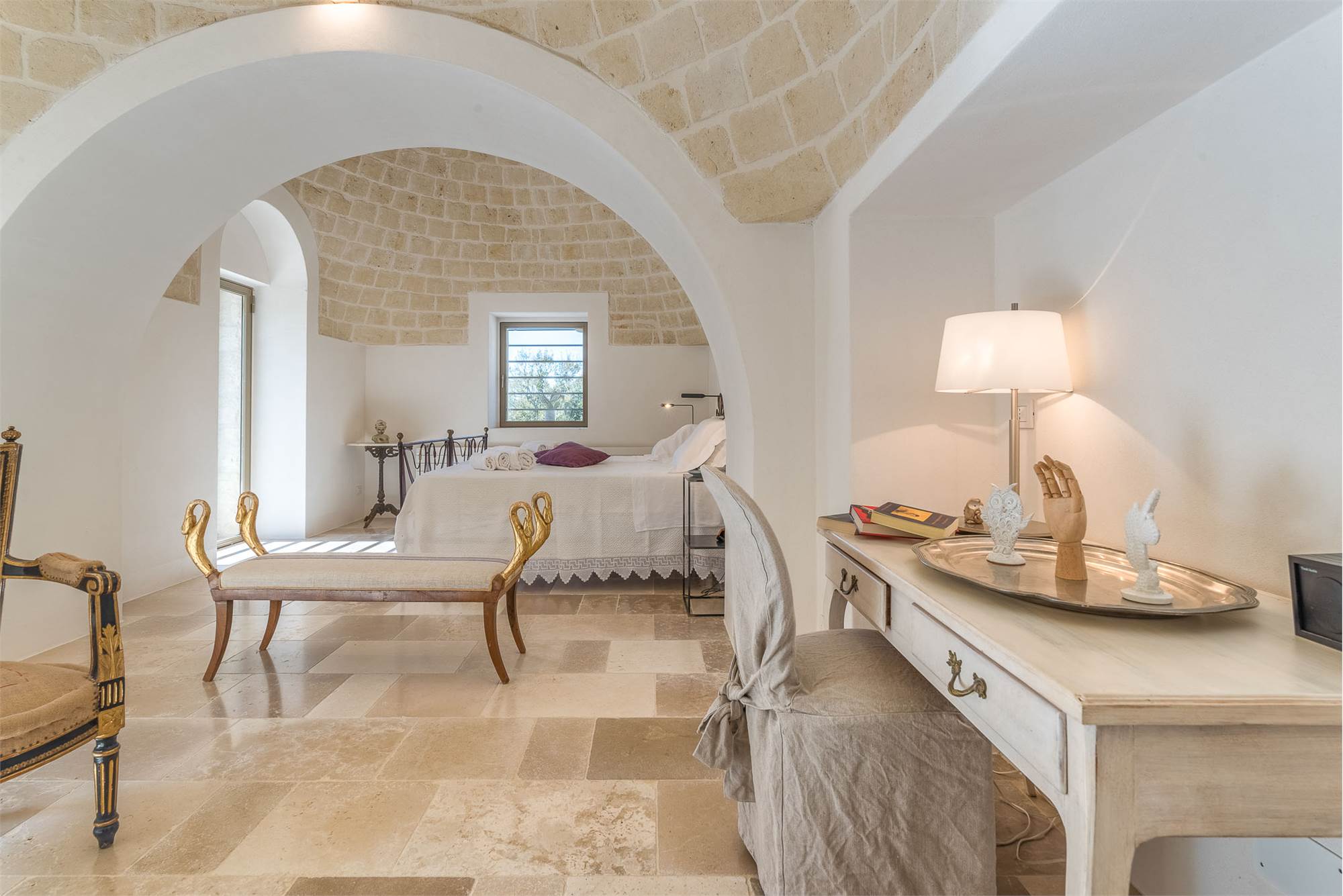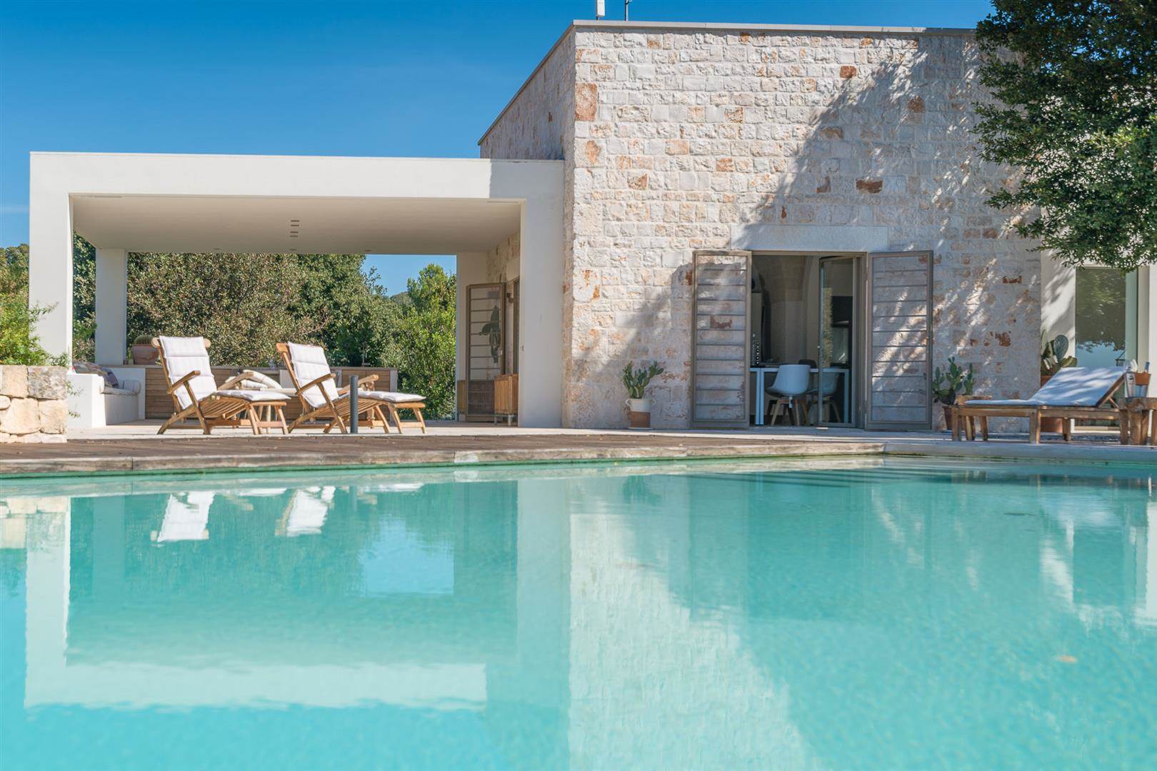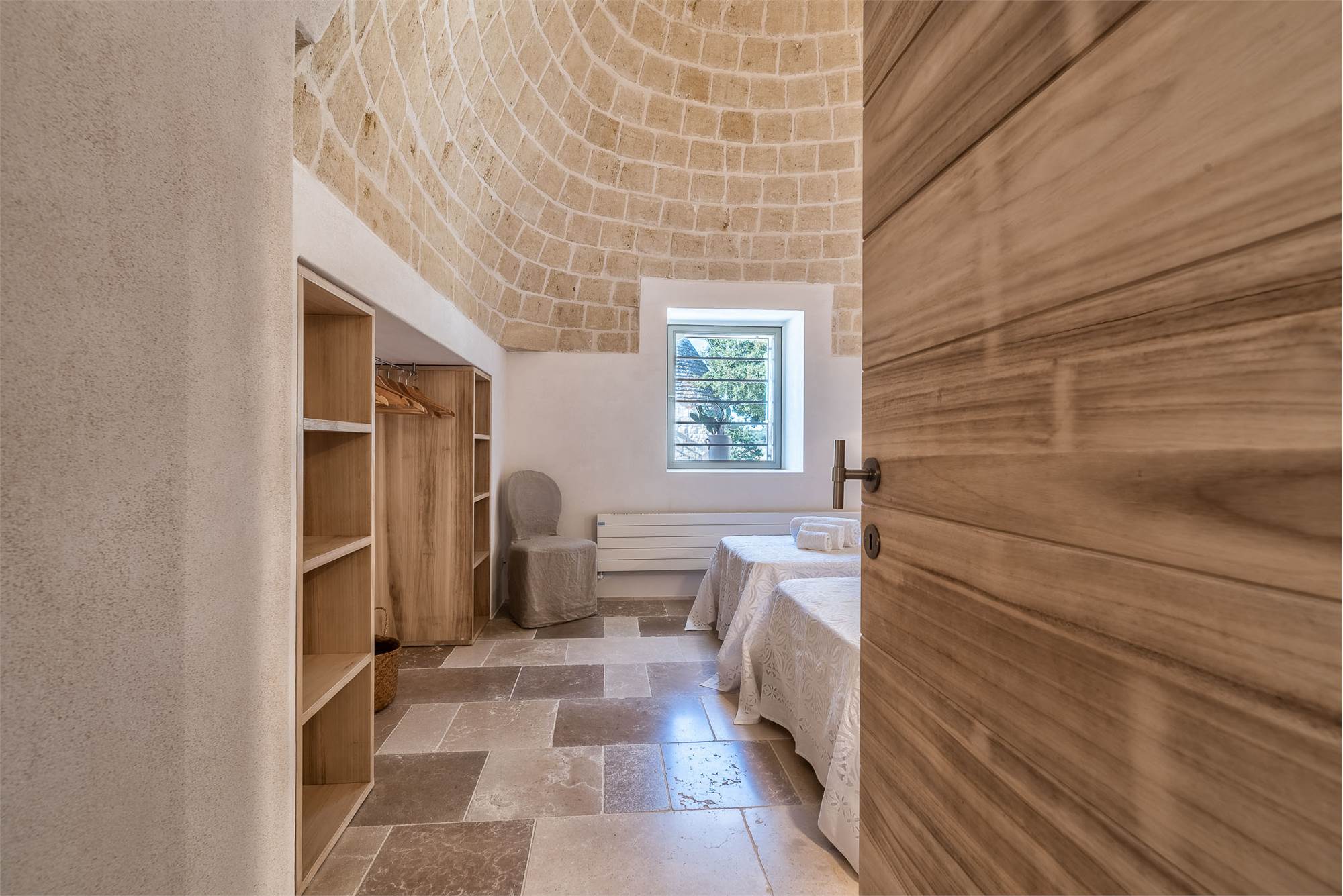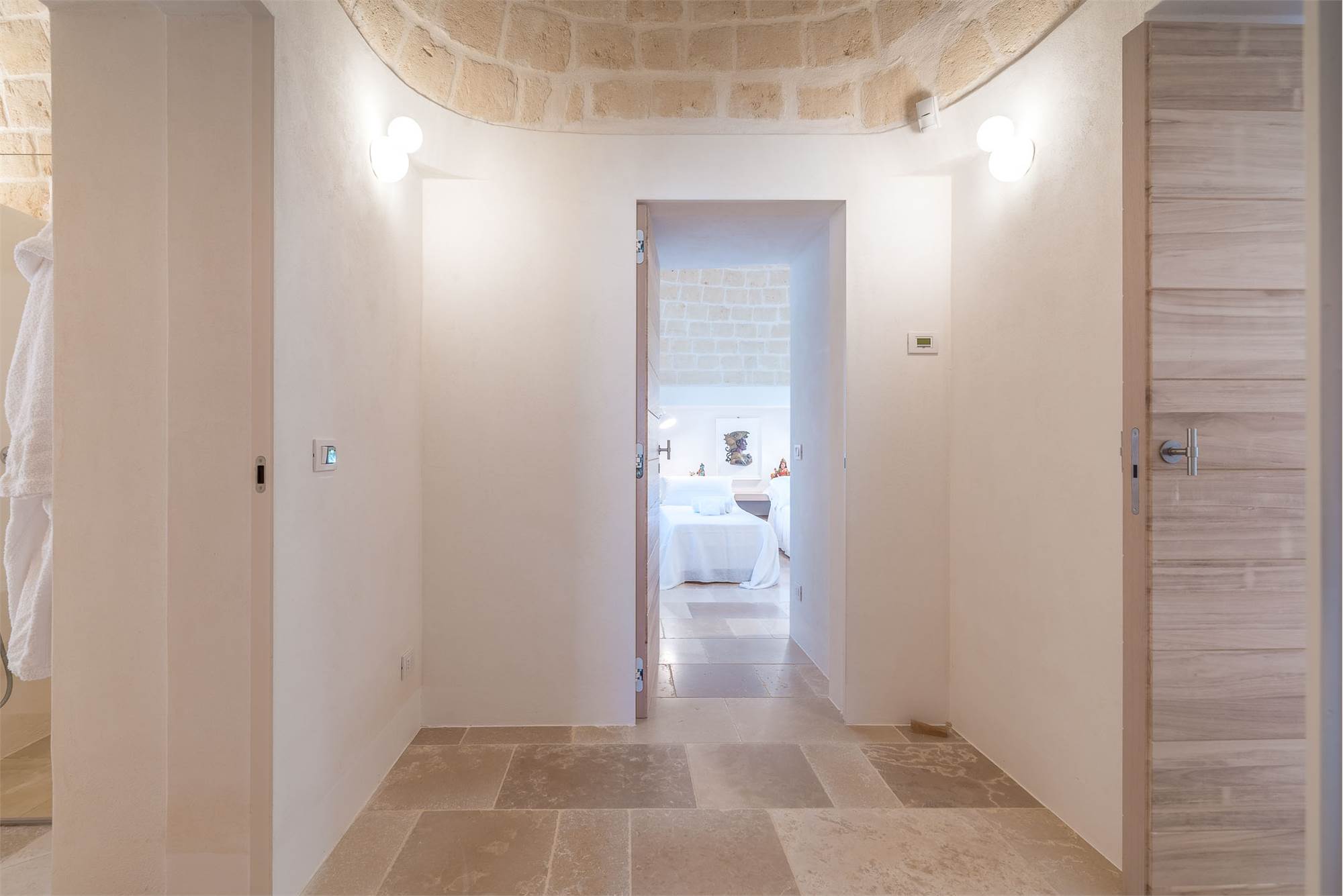 A large lamia, with a net surface of 70sqm, with star and barrel vaults and polished local stone flooring, houses the living area with a comfortable open kitchen, a service area with pantry, a bathroom, a dining area and a large and bright seating area, with large windows overlooking the garden and pool.