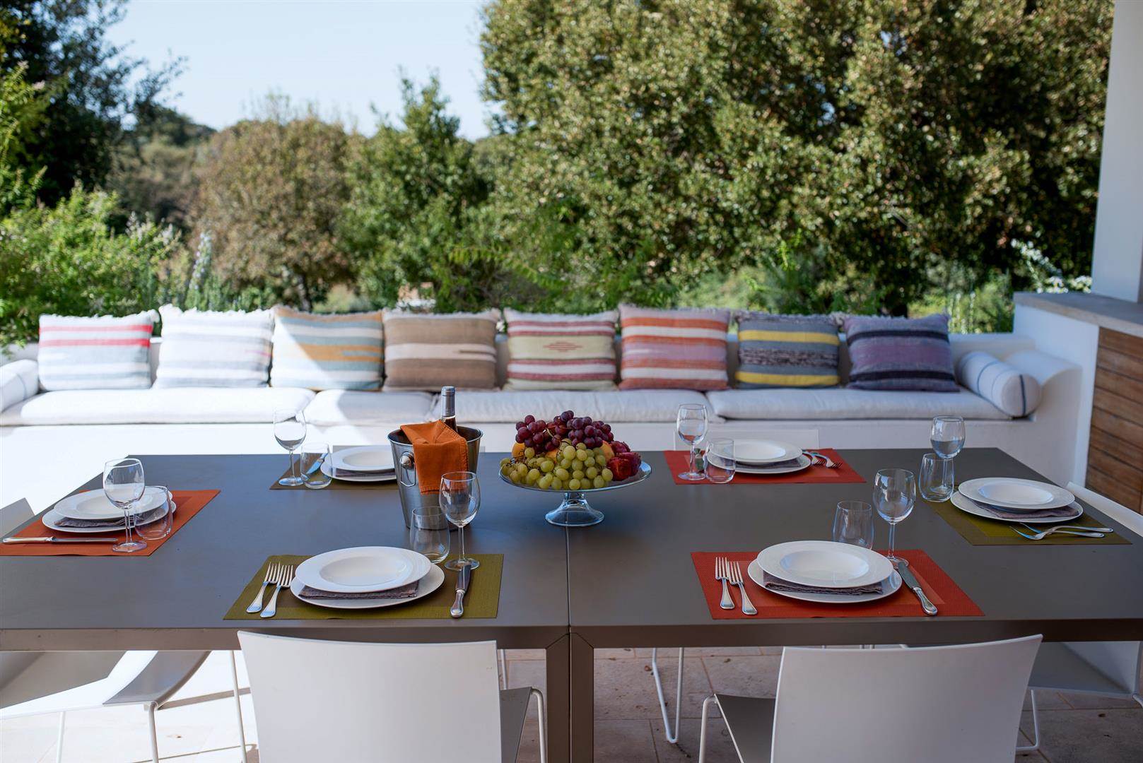Several areas, shaded naturally, are added to the outdoor veranda, equipped with dining table and wall seats, outdoor kitchen and barbecue.