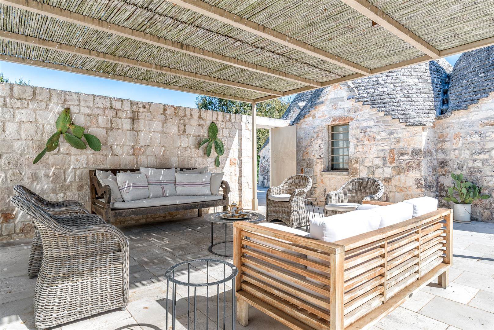 Connected to the lamia by a pergola is the comfortable sleeping area, contained within a large group of 8 trulli.