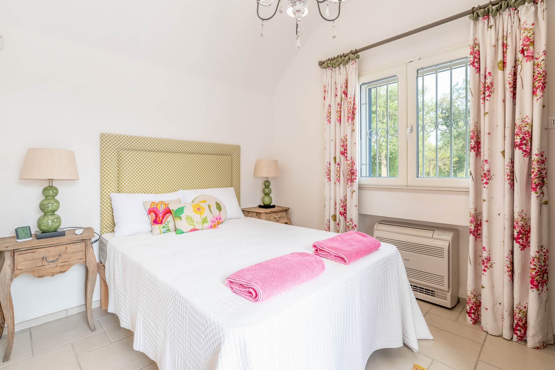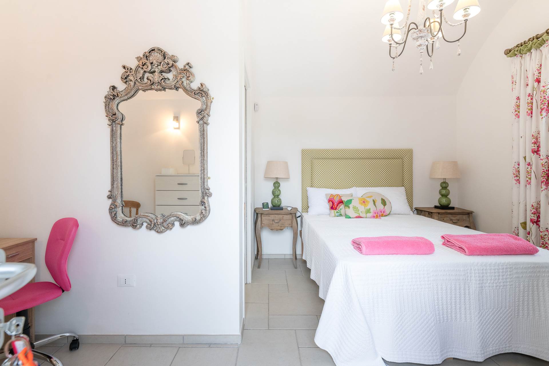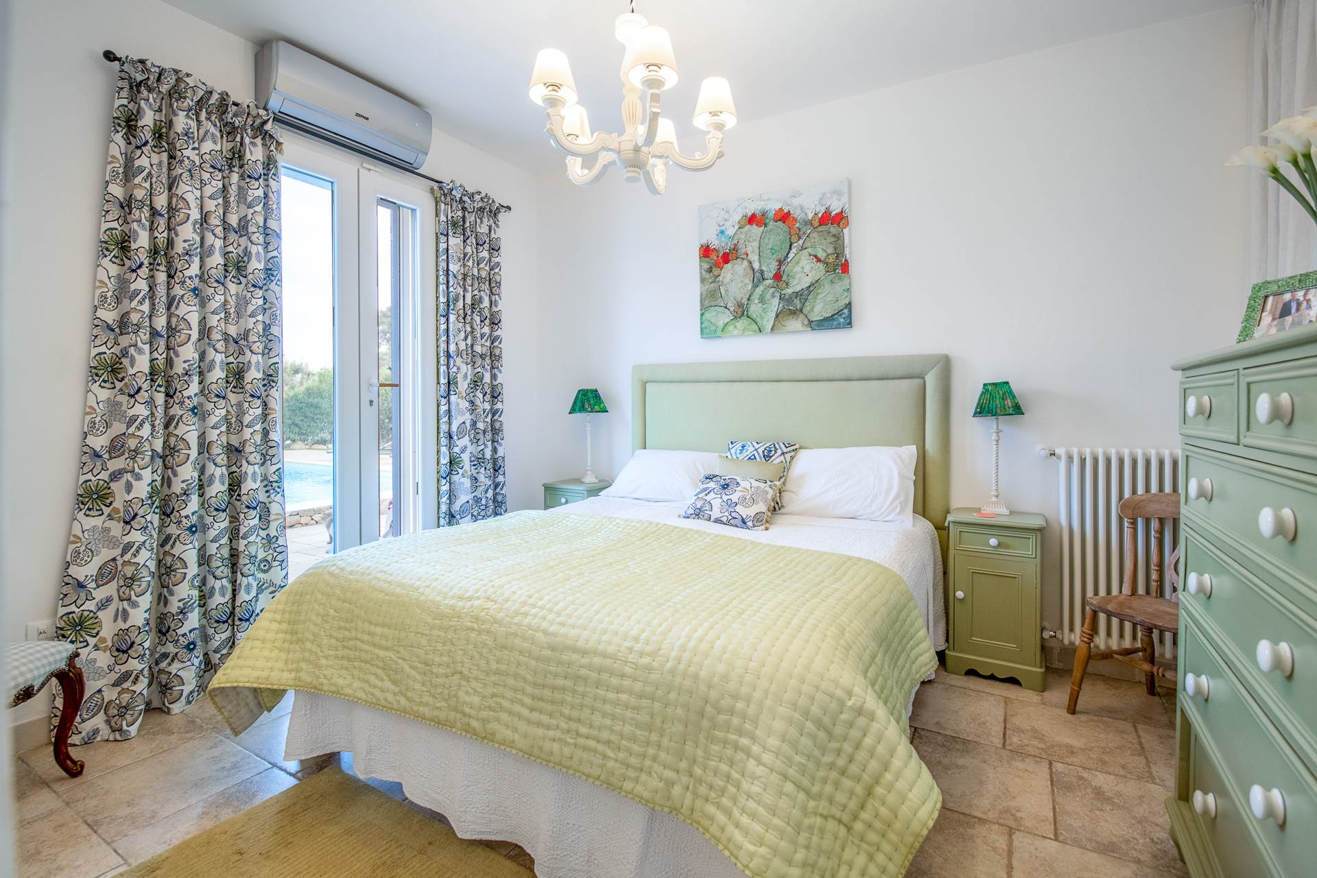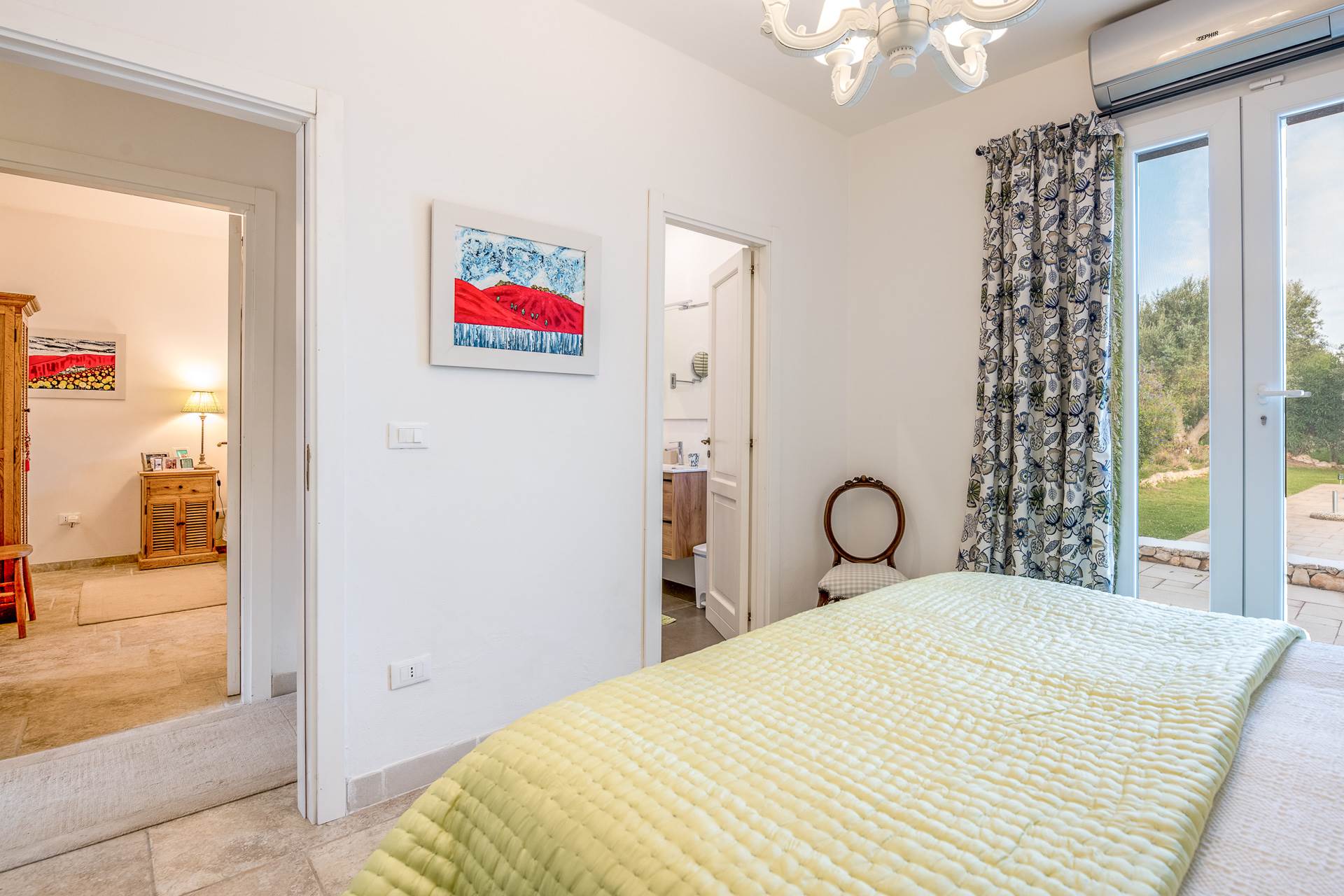 Una camera ha porte finestre che conducono direttamente alla zona piscina, mentre l'altra ha ampie finestre che permettono l'ingresso di molta luce naturale.