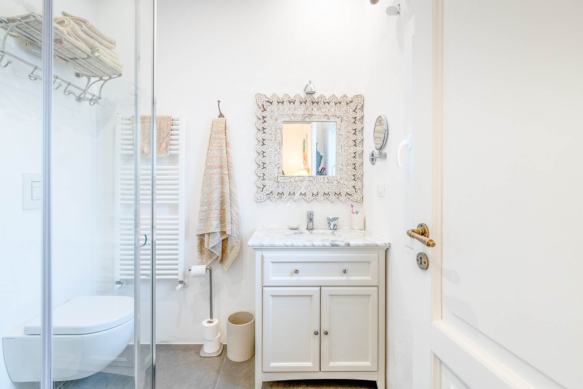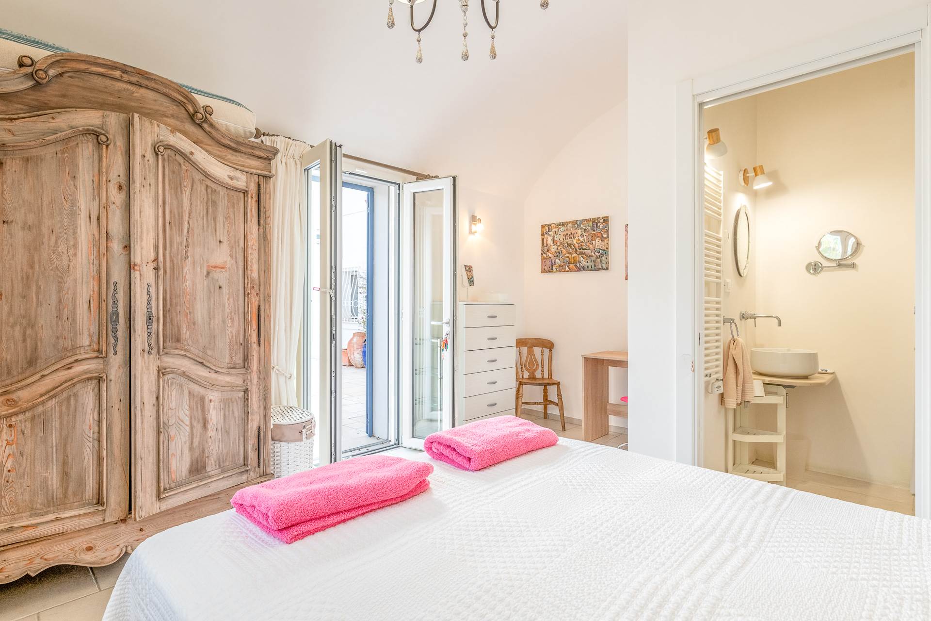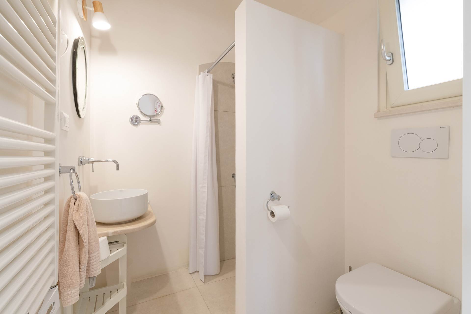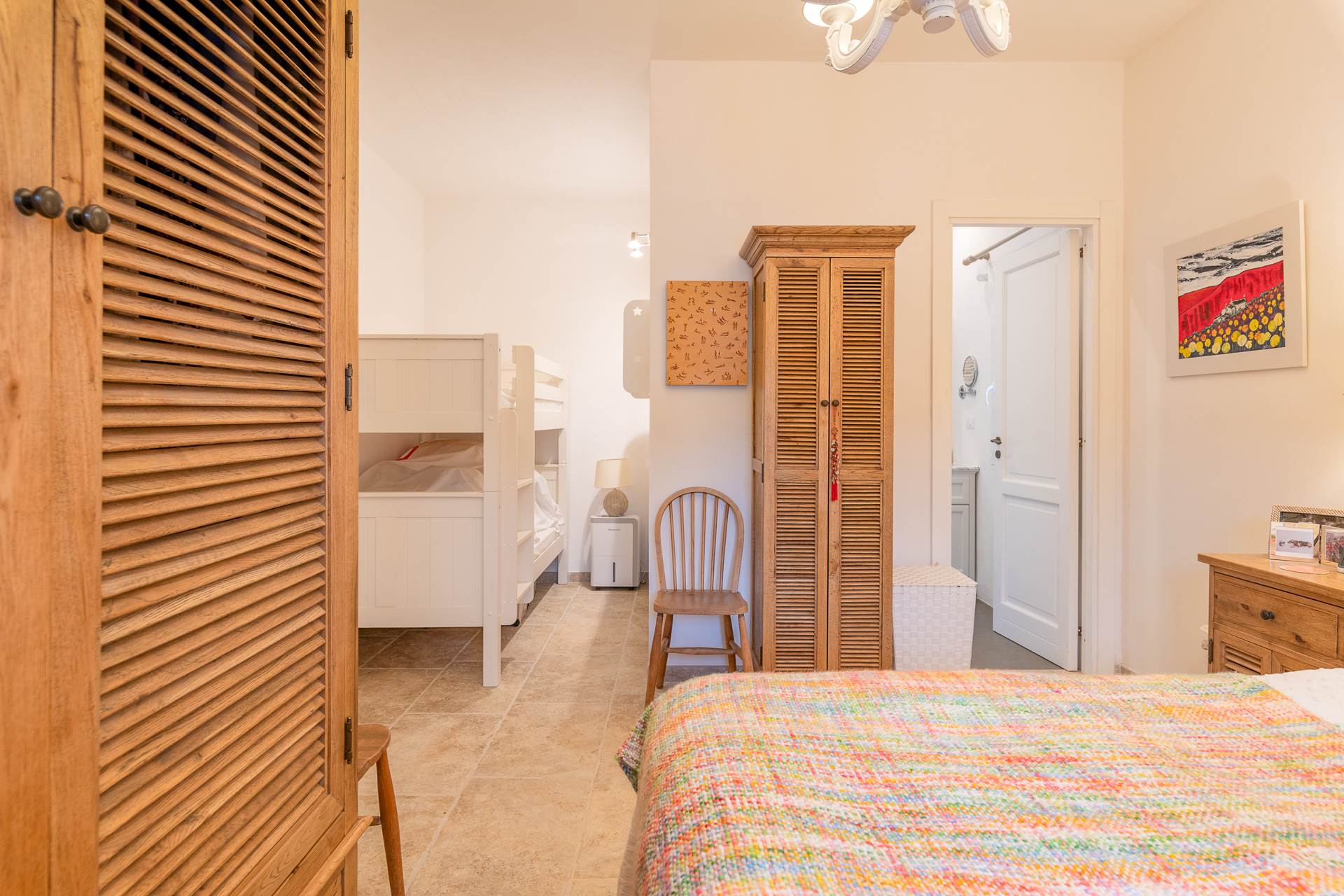 Dal soggiorno e dalla zona pranzo si accede a due camere matrimoniali, entrambe con bagno privato.